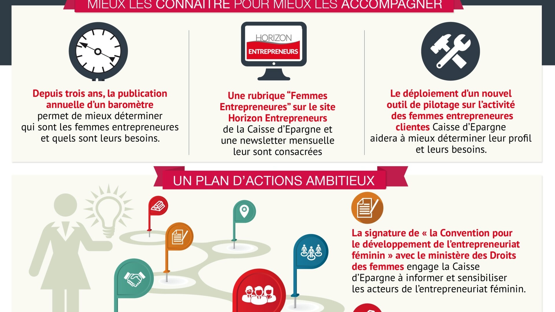 Depuis 2012, la Caisse d’Epargne publie un baromètre annuel permettant de déterminer les profils et les besoins des femmes entrepreneures. Cette année, une nouvelle étude qualitative sous le prisme de l’économie comportementale a été mise en place afin d’identifier les freins et les obstacles à leur volonté de création d’entreprise. Cette étude est ainsi un préalable à l’identification d’un « nudge », point de départ d’un programme d’actions menées conjointement par la Caisse d’Epargne et ses partenaires, afin d’atteindre l’objectif en 2017 que 40 % des nouvelles entreprises soient créées par des femmes.