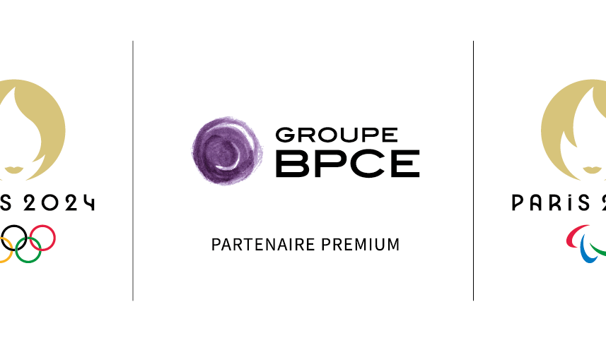 Visuel des logos Paris 2024 Olympique et Paralympique avec le logo du Groupe BPCE, indiquant leur partenariat premium pour les Jeux Olympiques et Paralympiques de Paris 2024.