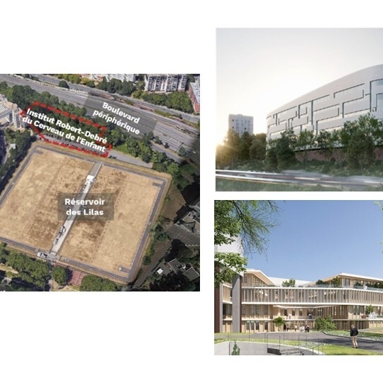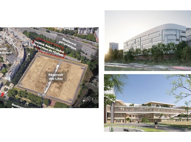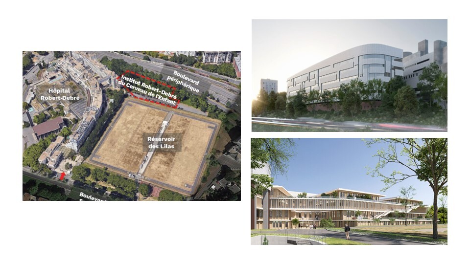 Vue aérienne du site de l’Institut Robert-Debré du Cerveau de l’Enfant à Paris et perspectives architecturales du futur bâtiment, illustrant le projet de pôle hospitalo-universitaire pour la recherche et les soins sur le cerveau de l’enfant.