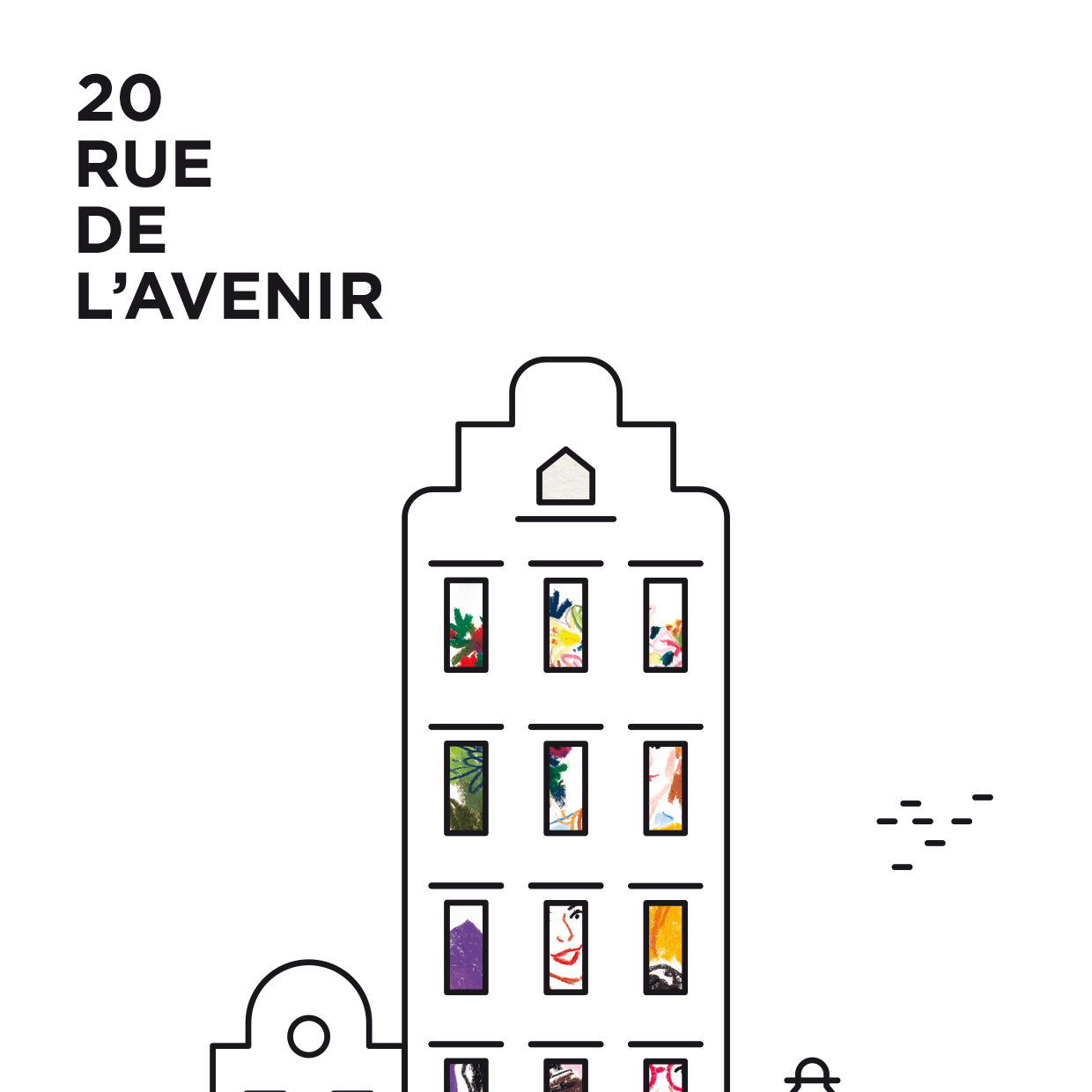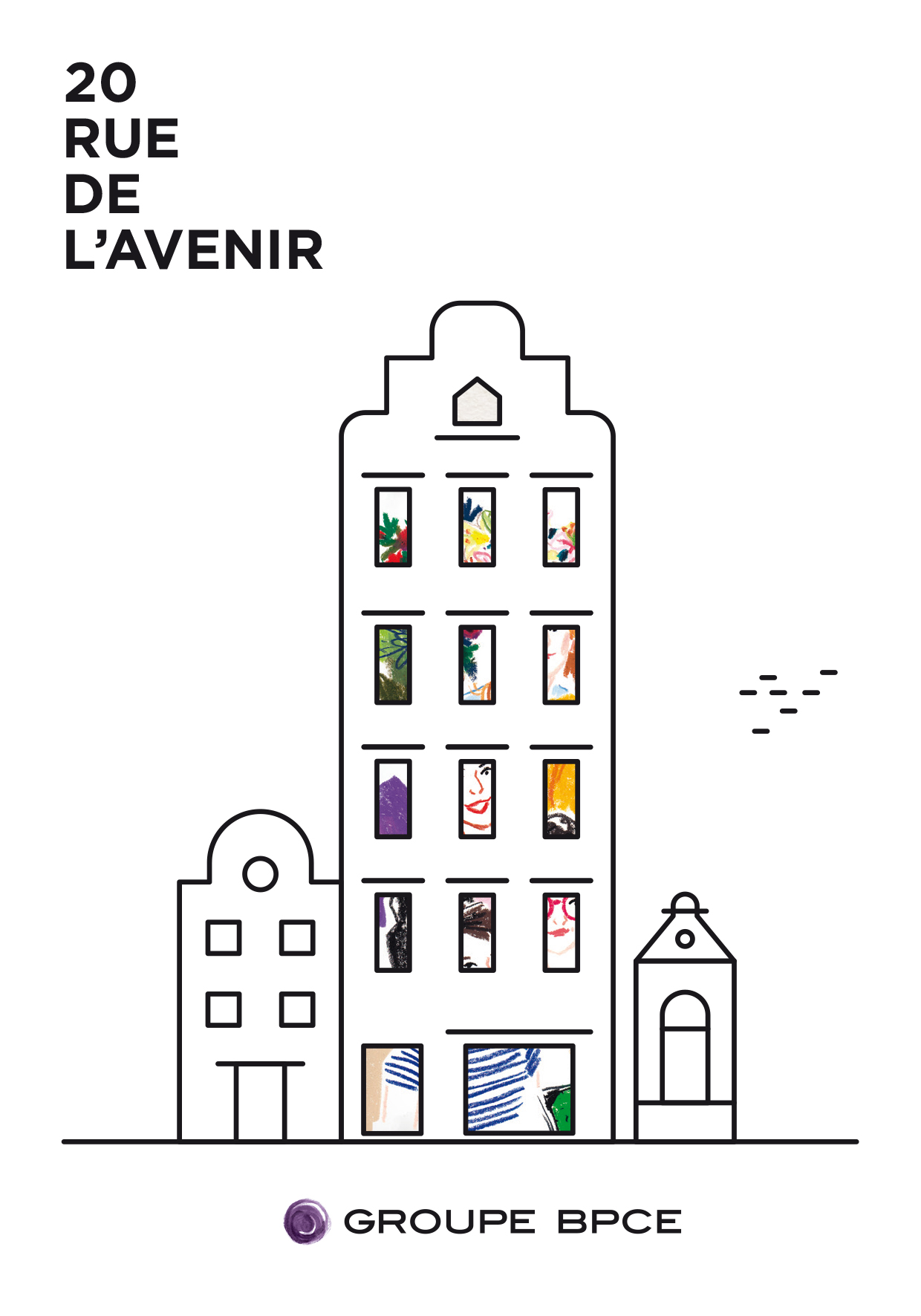 Illustration de la couverture du rapport d'activité 2017 du Groupe BPCE intitulé « 20 rue de l'Avenir », mettant en scène un immeuble stylisé avec des fenêtres illustrées, symbole de diversité et d'innovation au sein du groupe.