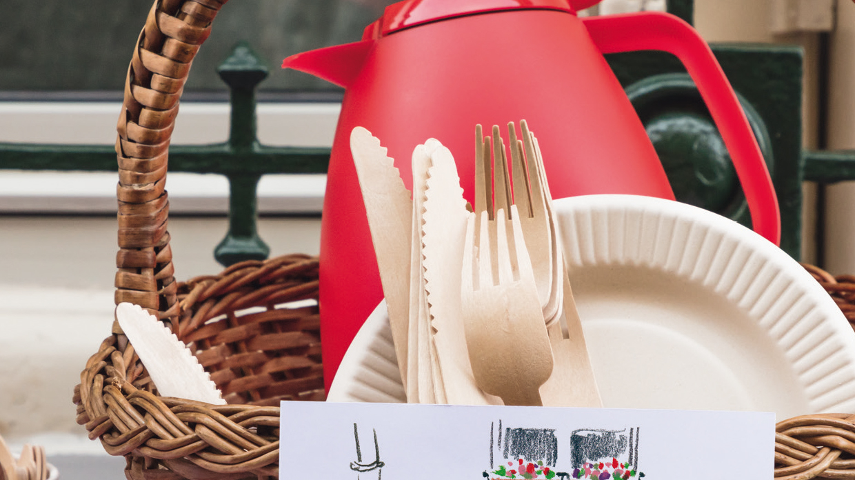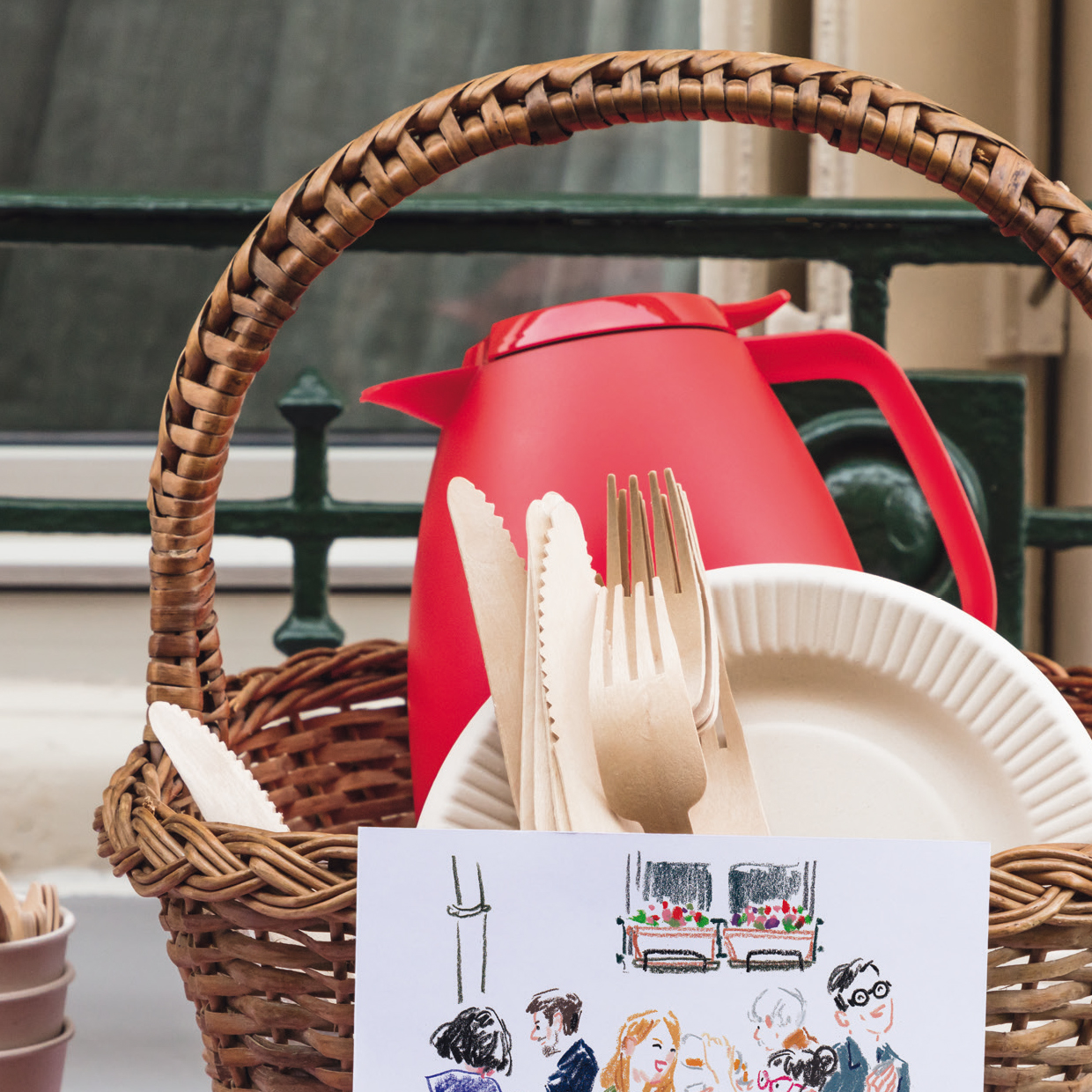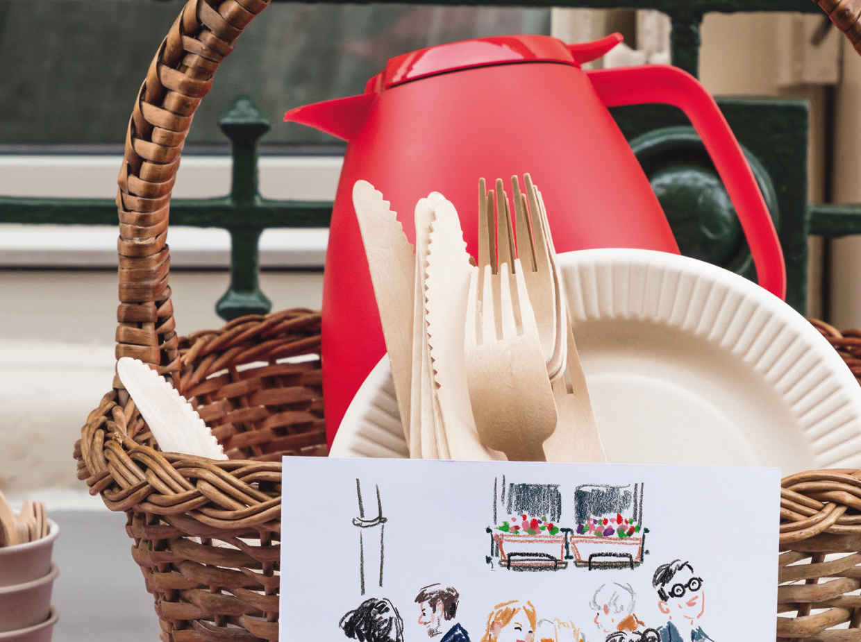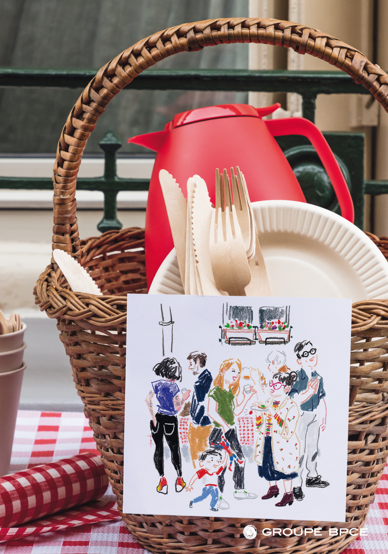 Panier pique-nique avec vaisselle biodégradable, illustration de convivialité et thermos rouge, extrait du rapport d’activité 2017 du Groupe BPCE.
