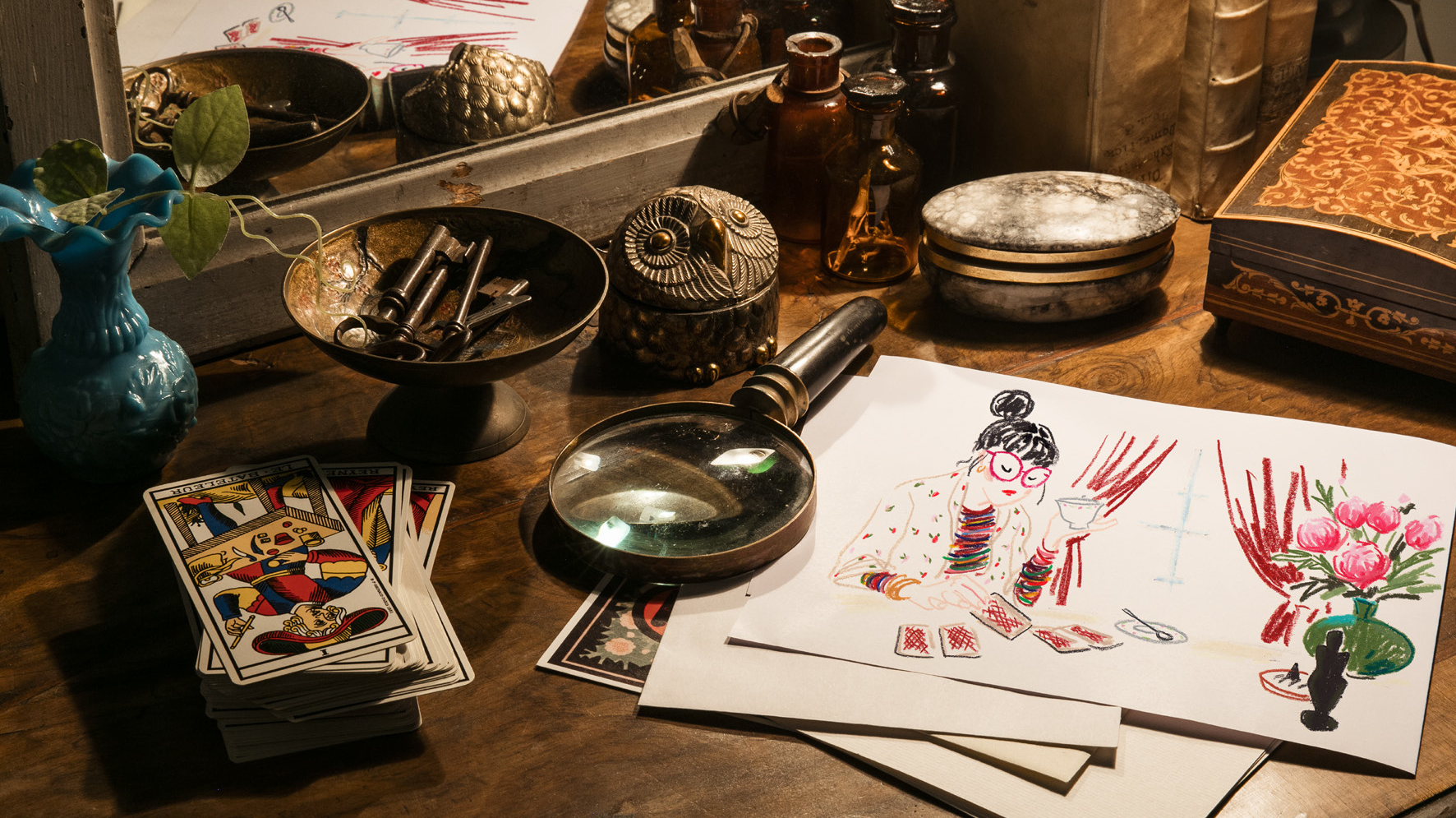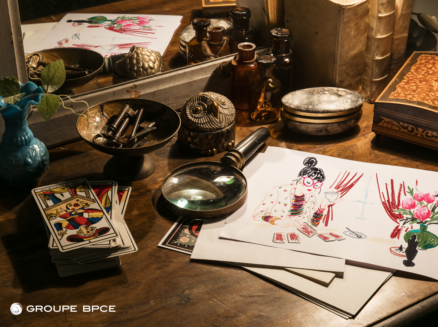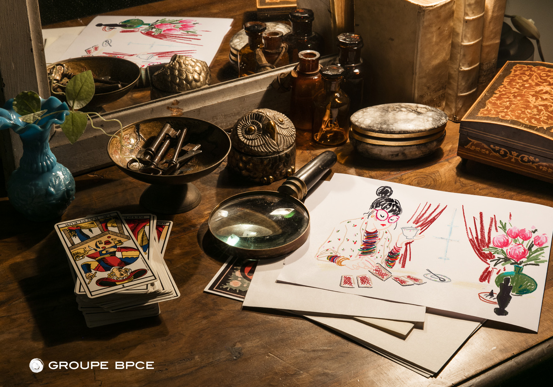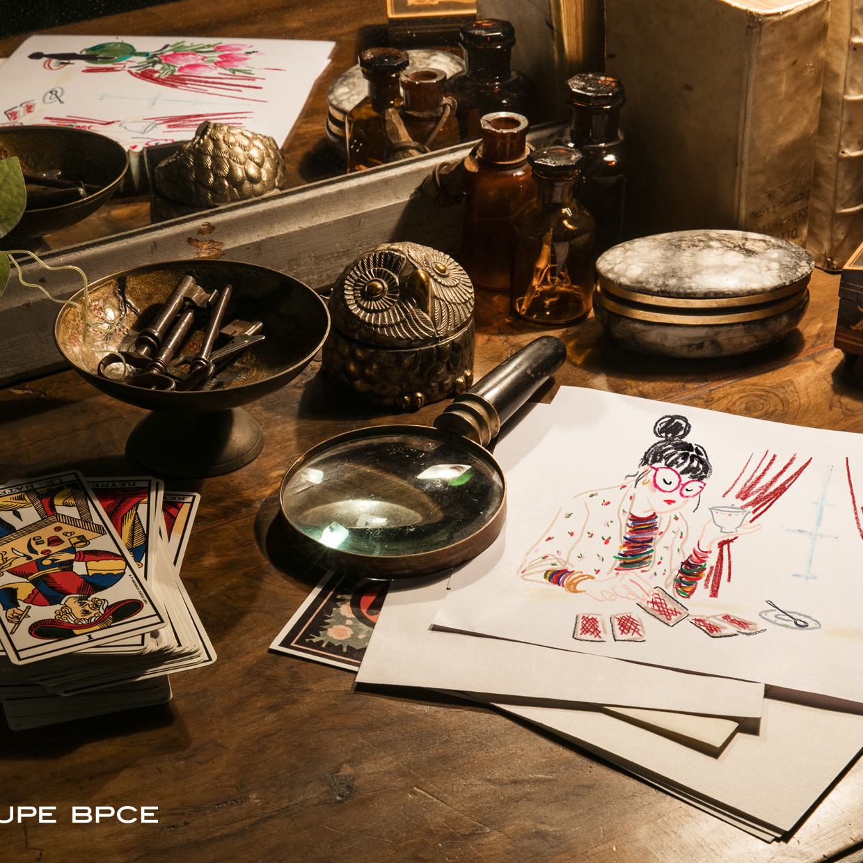 Nature morte évoquant l'univers du rapport d'activité 2017 du Groupe BPCE, avec des objets rétro, des cartes, une loupe et une illustration colorée sur une table en bois.