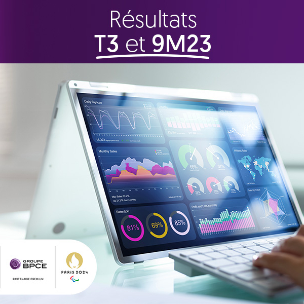 Vue d'un ordinateur affichant des graphiques financiers, accompagnée d'un bandeau indiquant 'Résultats T3 et 9M23' du Groupe BPCE, partenaire des Jeux Olympiques et Paralympiques de Paris 2024.