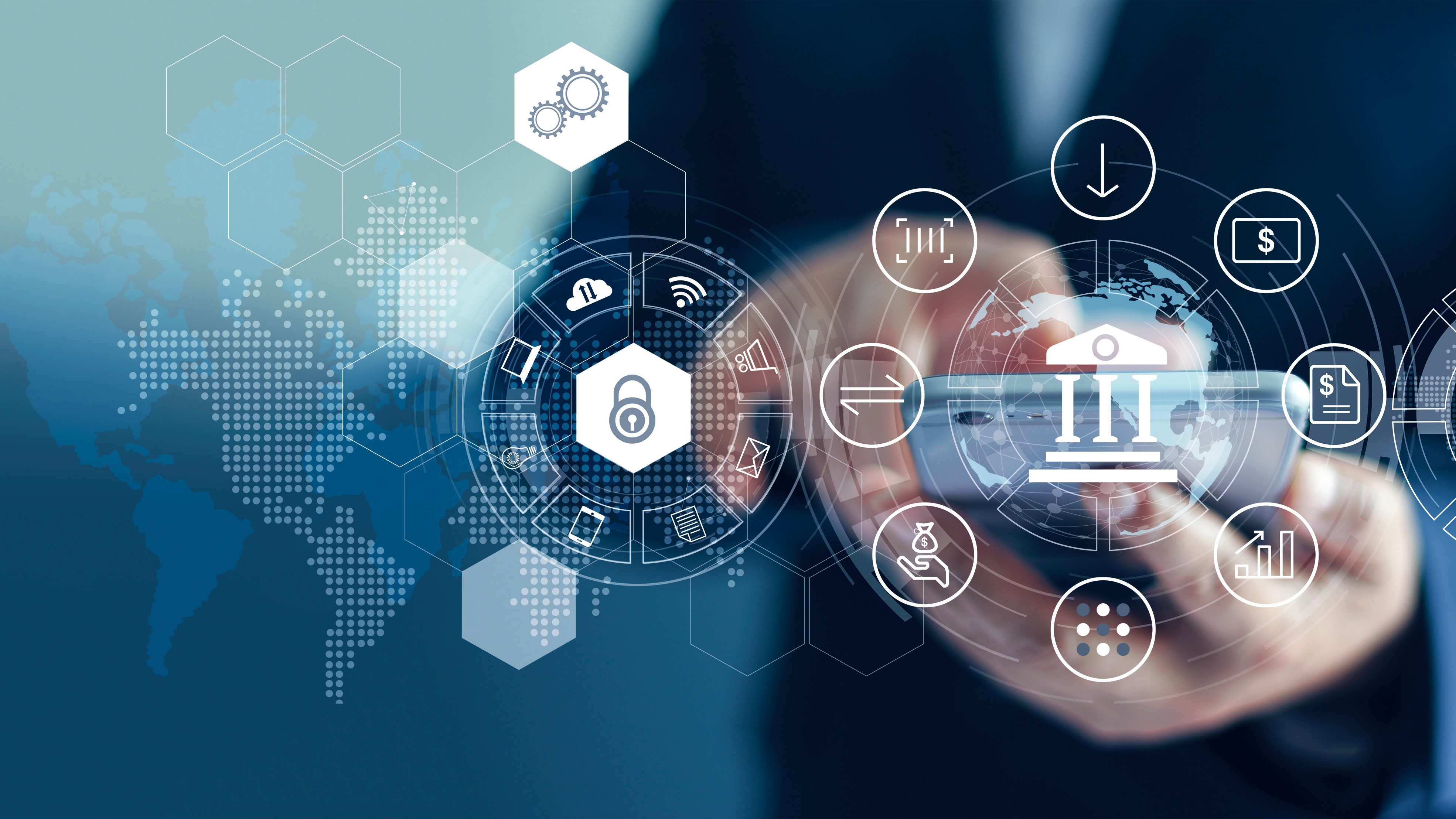 Homme d'affaires utilisant un smartphone pour accéder à des services bancaires numériques, illustré par des icônes de sécurité, paiements et services financiers sur fond de carte mondiale.