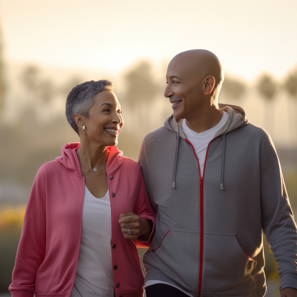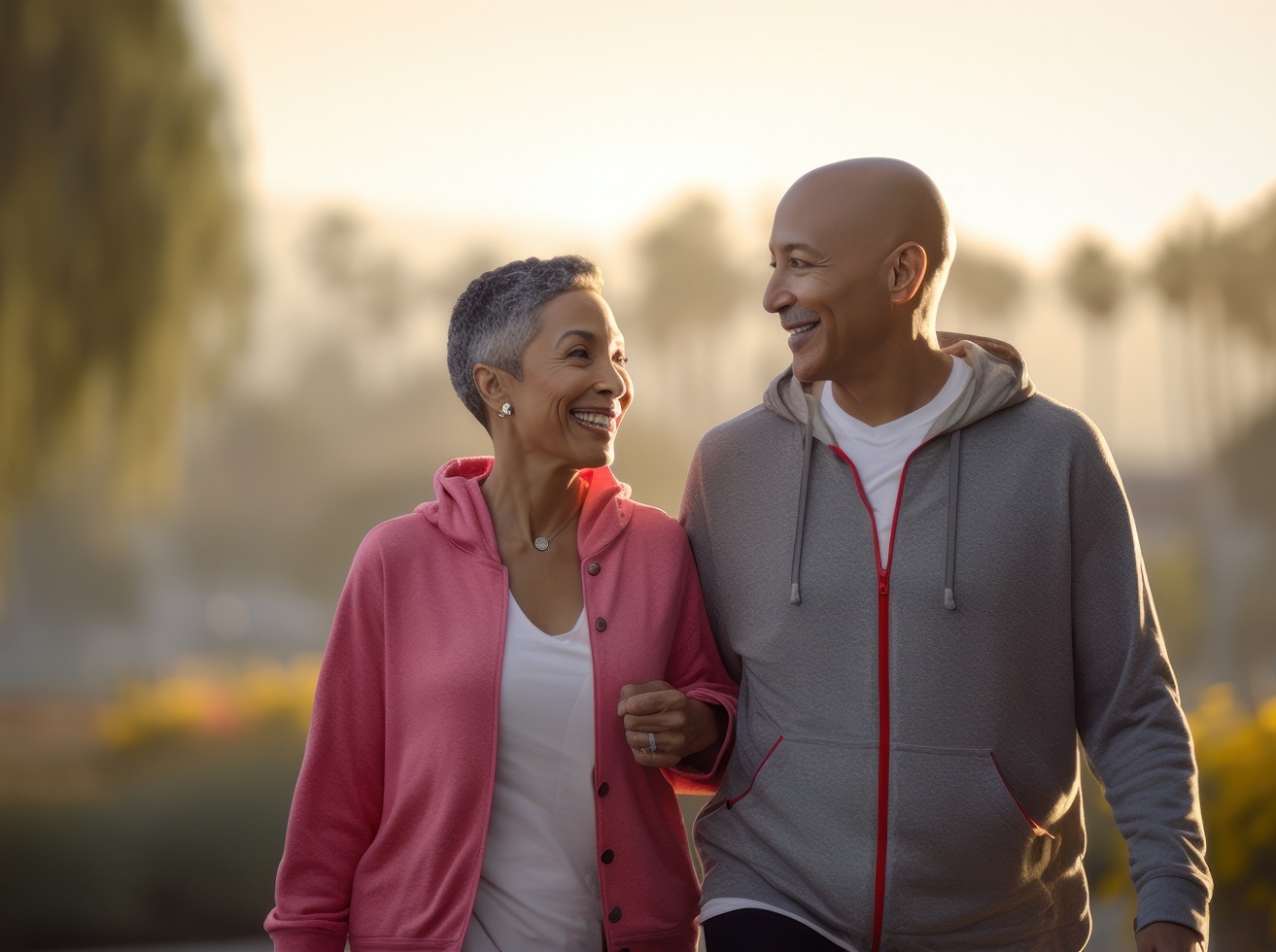 Couple senior marchant ensemble dans un parc au coucher du soleil, illustrant l'activité physique au quotidien et le bien-être en plein air.