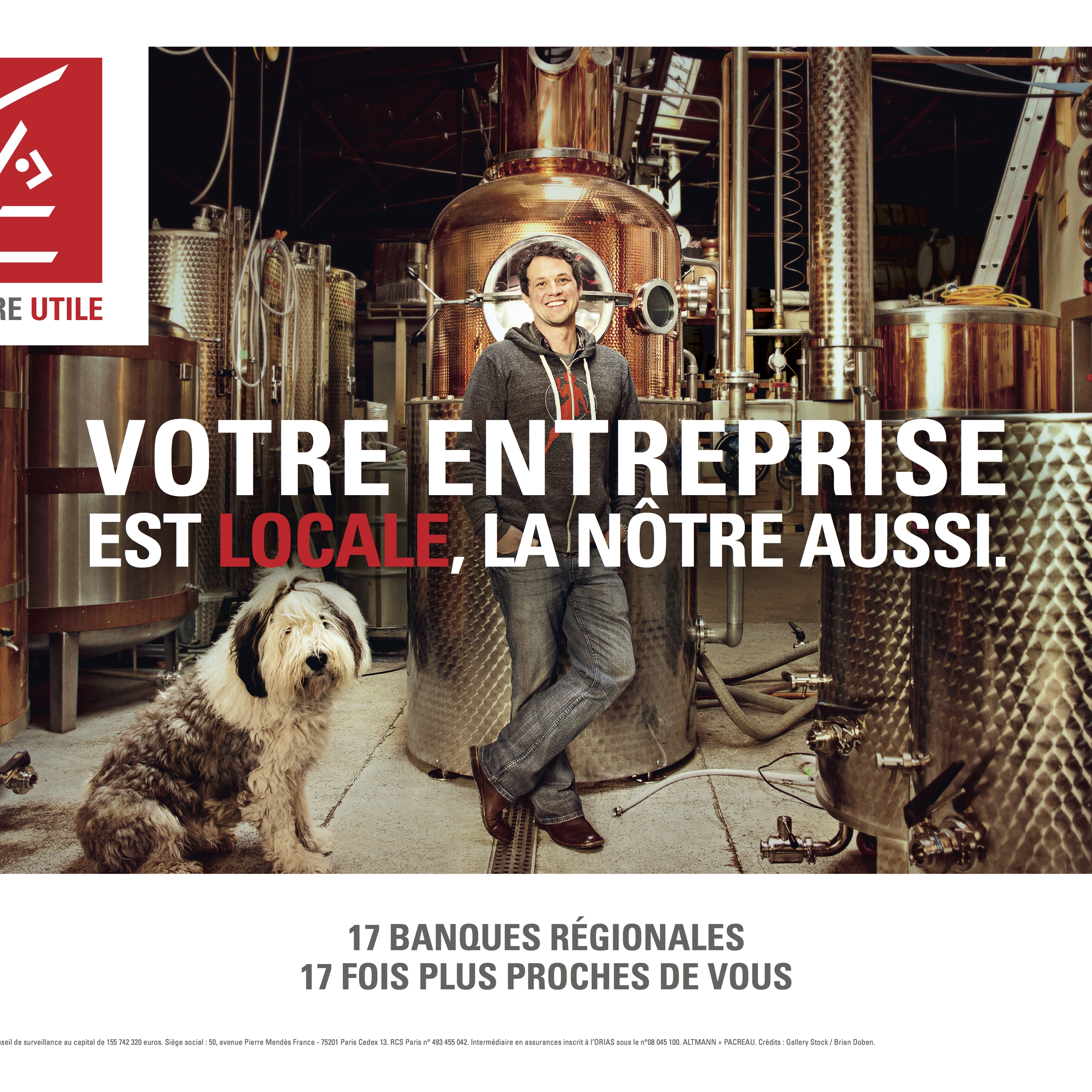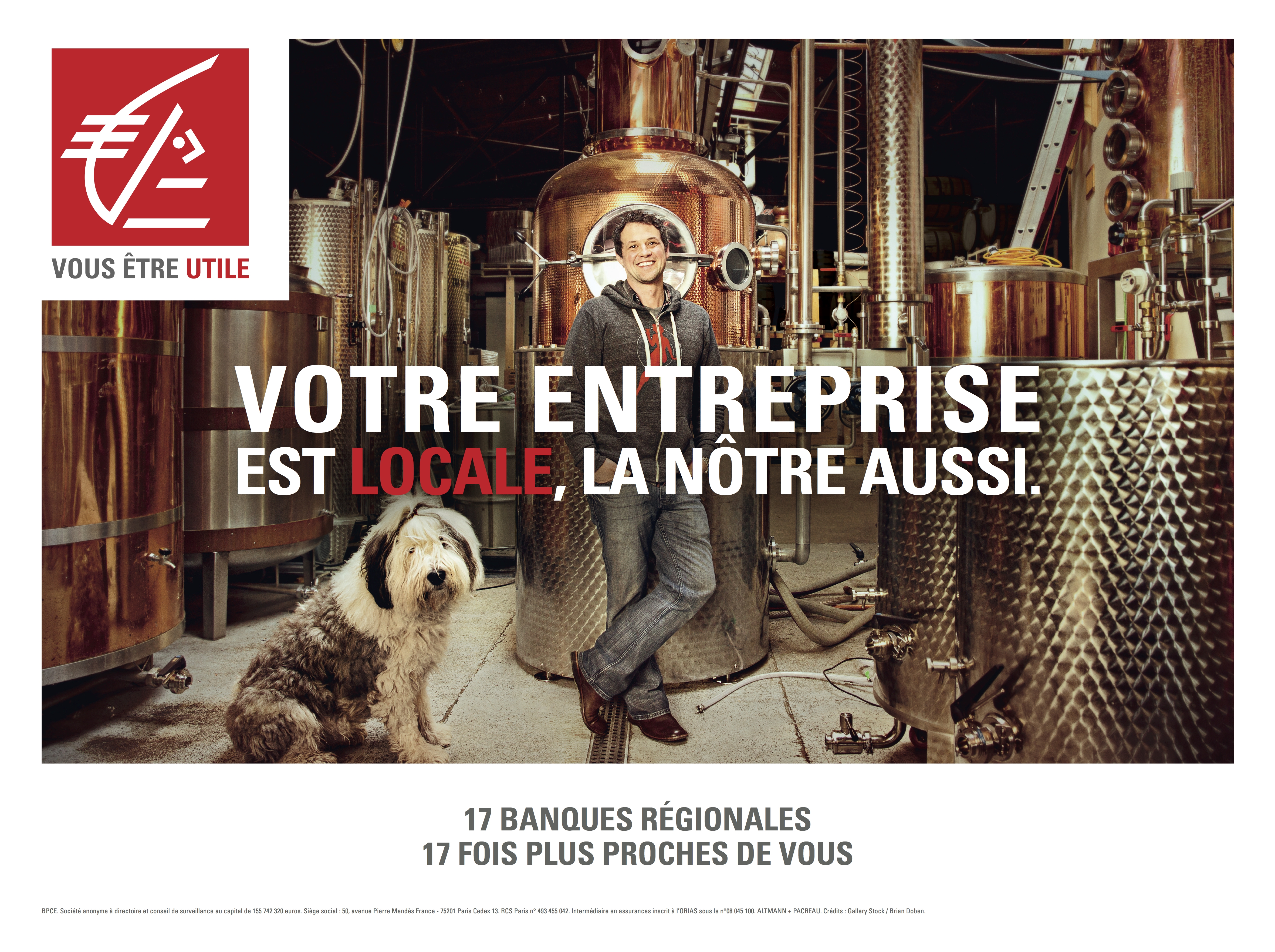 Affiche publicitaire de la Caisse d'Epargne illustrant un entrepreneur dans une distillerie, accompagnée de la signature "Vous être utile" et du slogan "Votre entreprise est locale, la nôtre aussi".