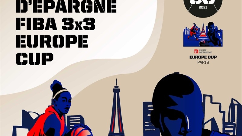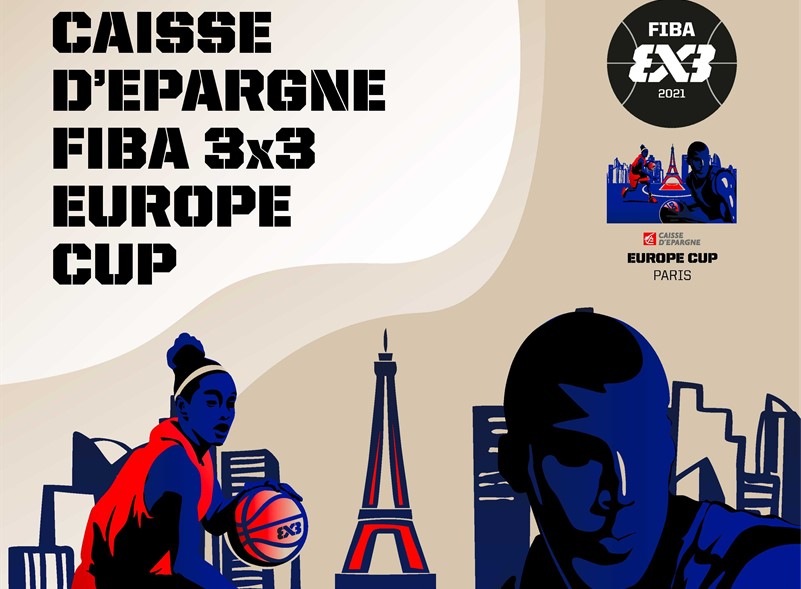 Affiche officielle de la Caisse d'Epargne FIBA 3x3 Europe Cup, mettant en scène des joueurs de basketball et la Tour Eiffel pour l'édition parisienne.