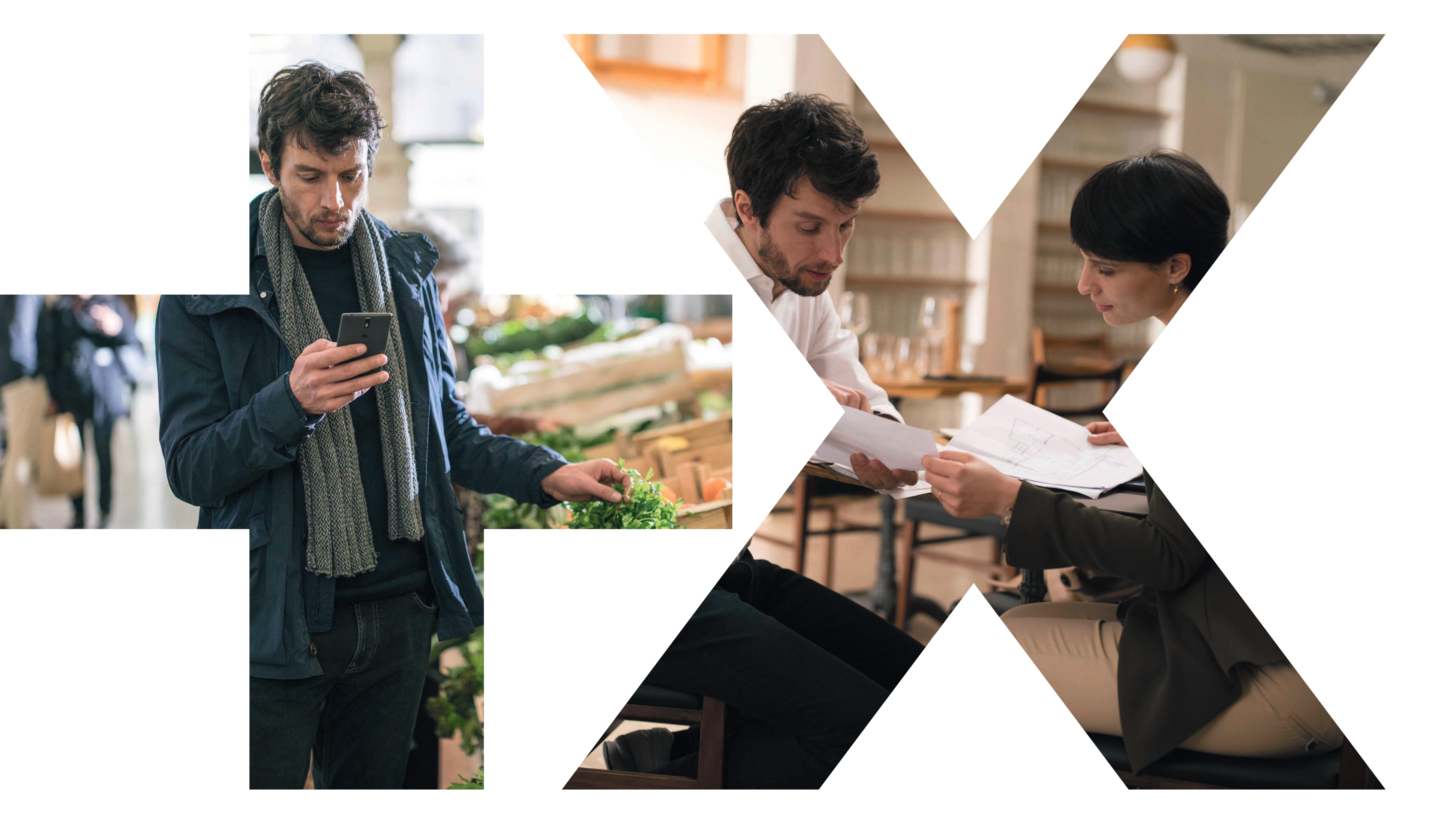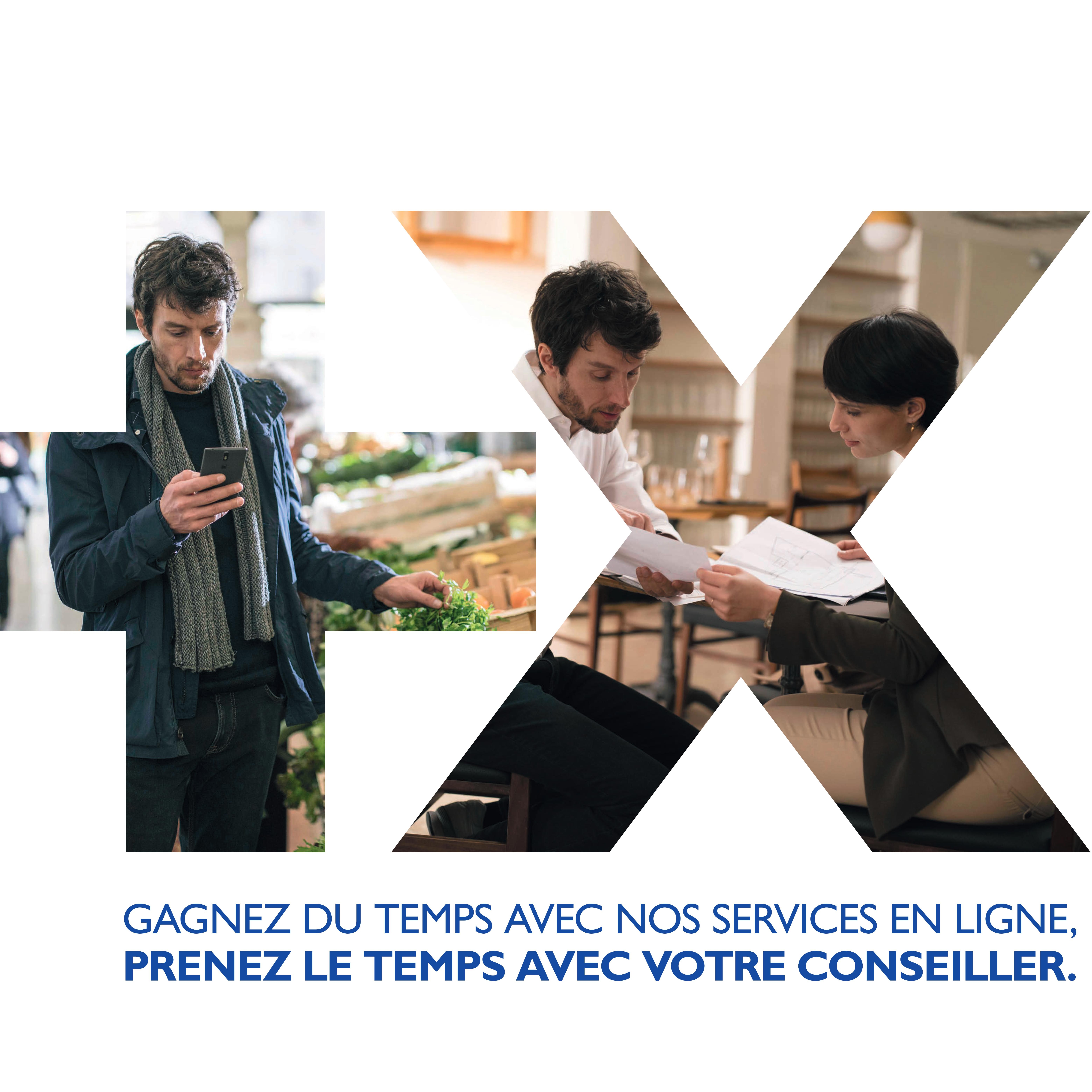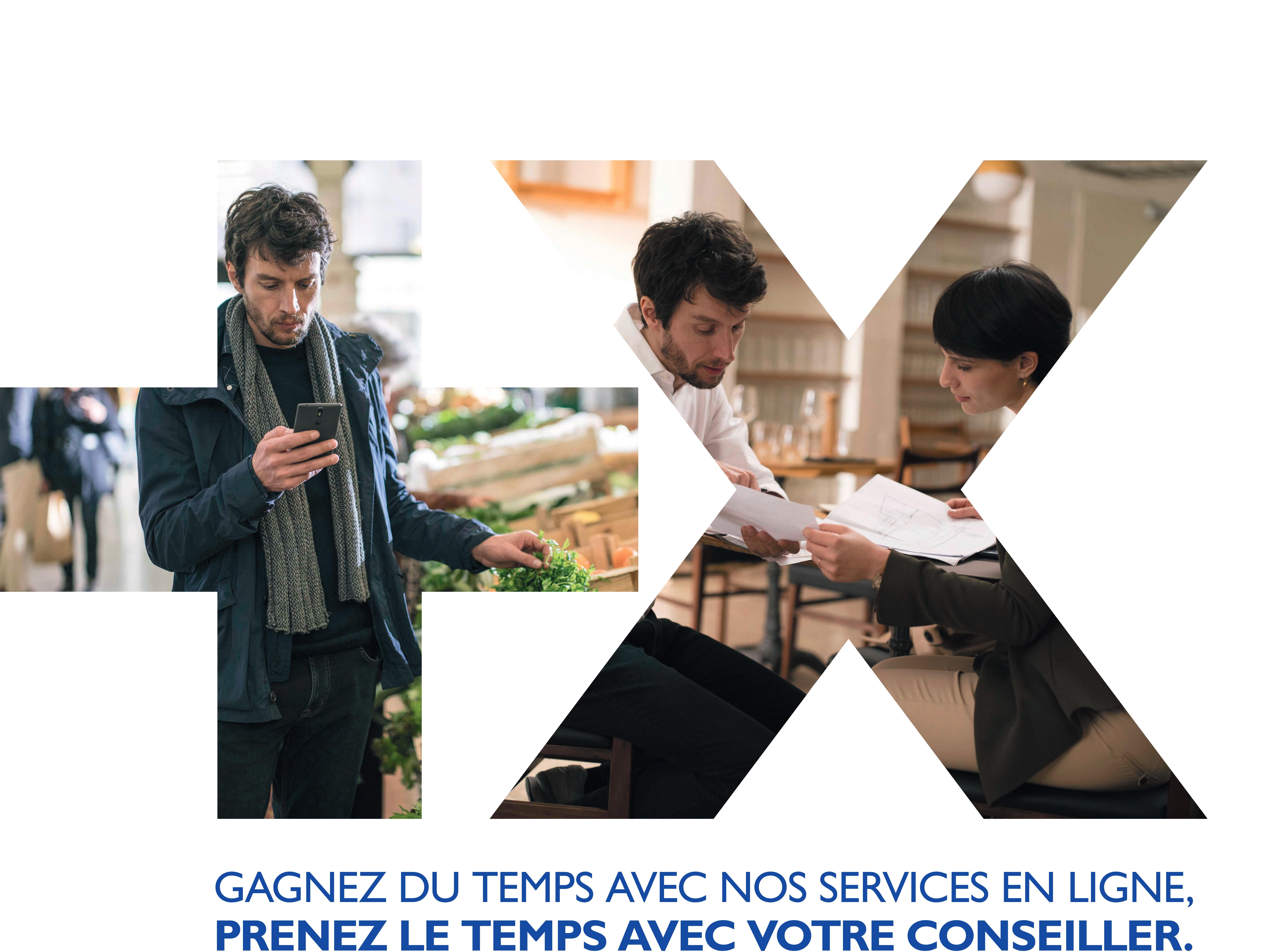 Affiche de la campagne Banque Populaire mettant en avant l'alliance entre services digitaux et accompagnement humain avec un conseiller.