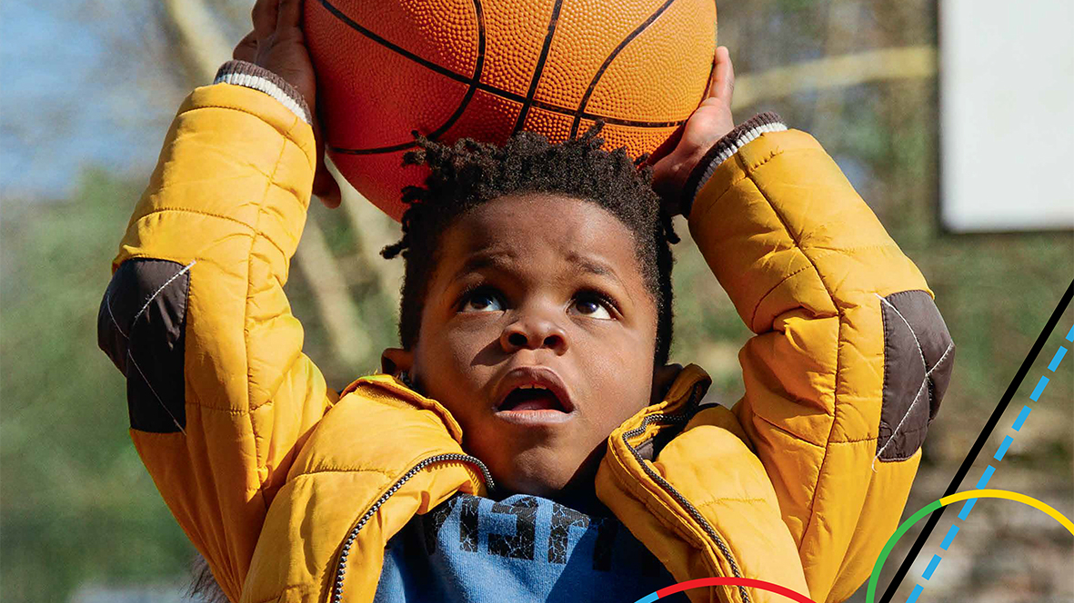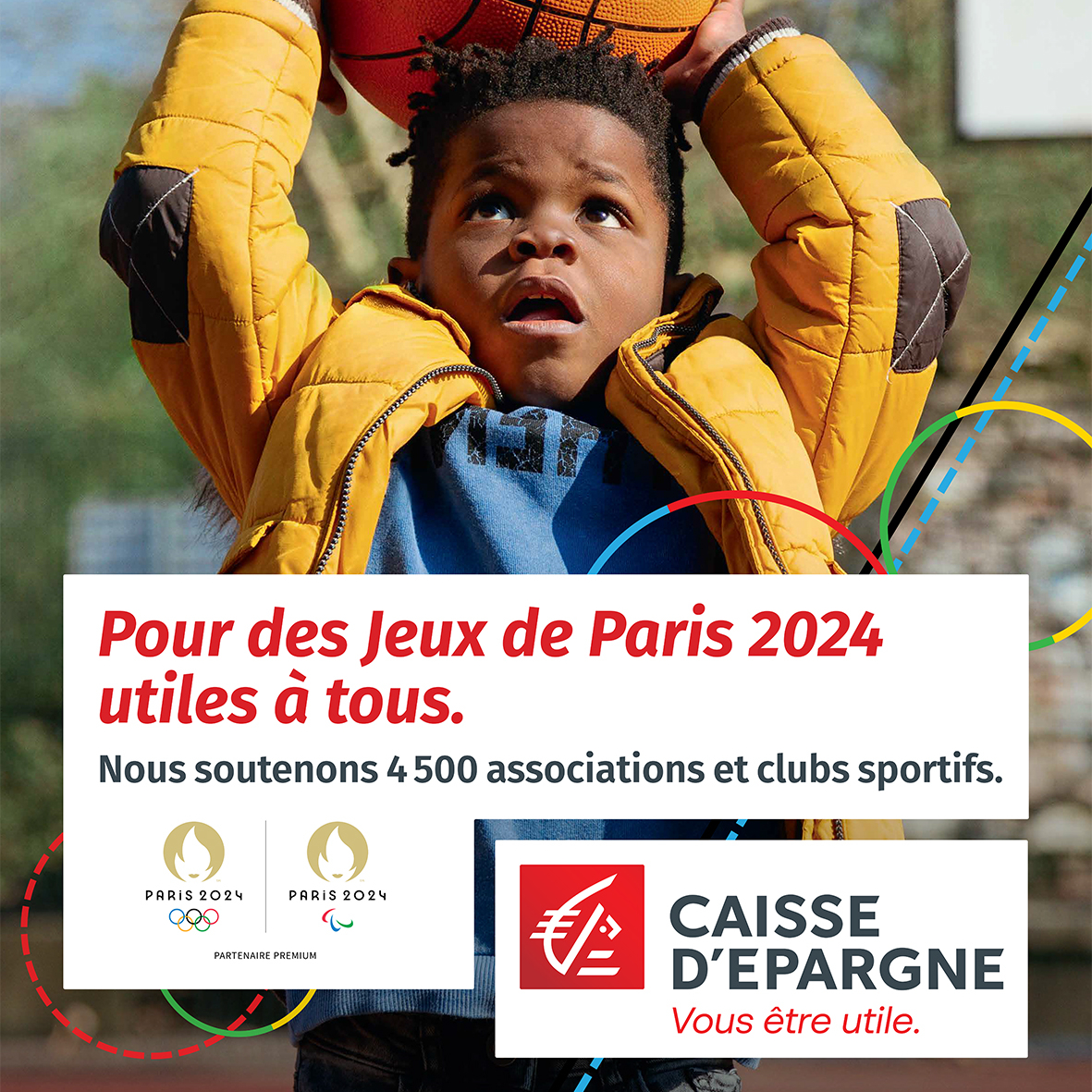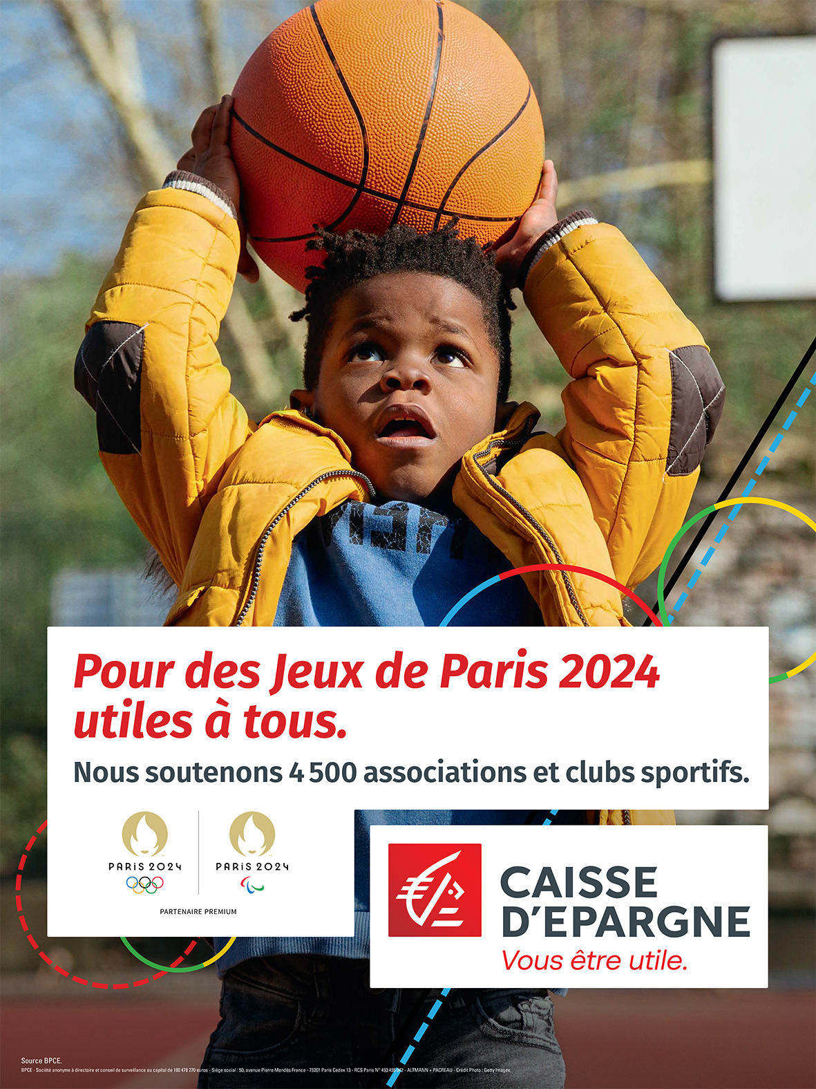Affiche promotionnelle de la Caisse d’Epargne pour Paris 2024 mettant en avant son soutien à 4 500 associations et clubs sportifs, avec un enfant tenant un ballon de basket.