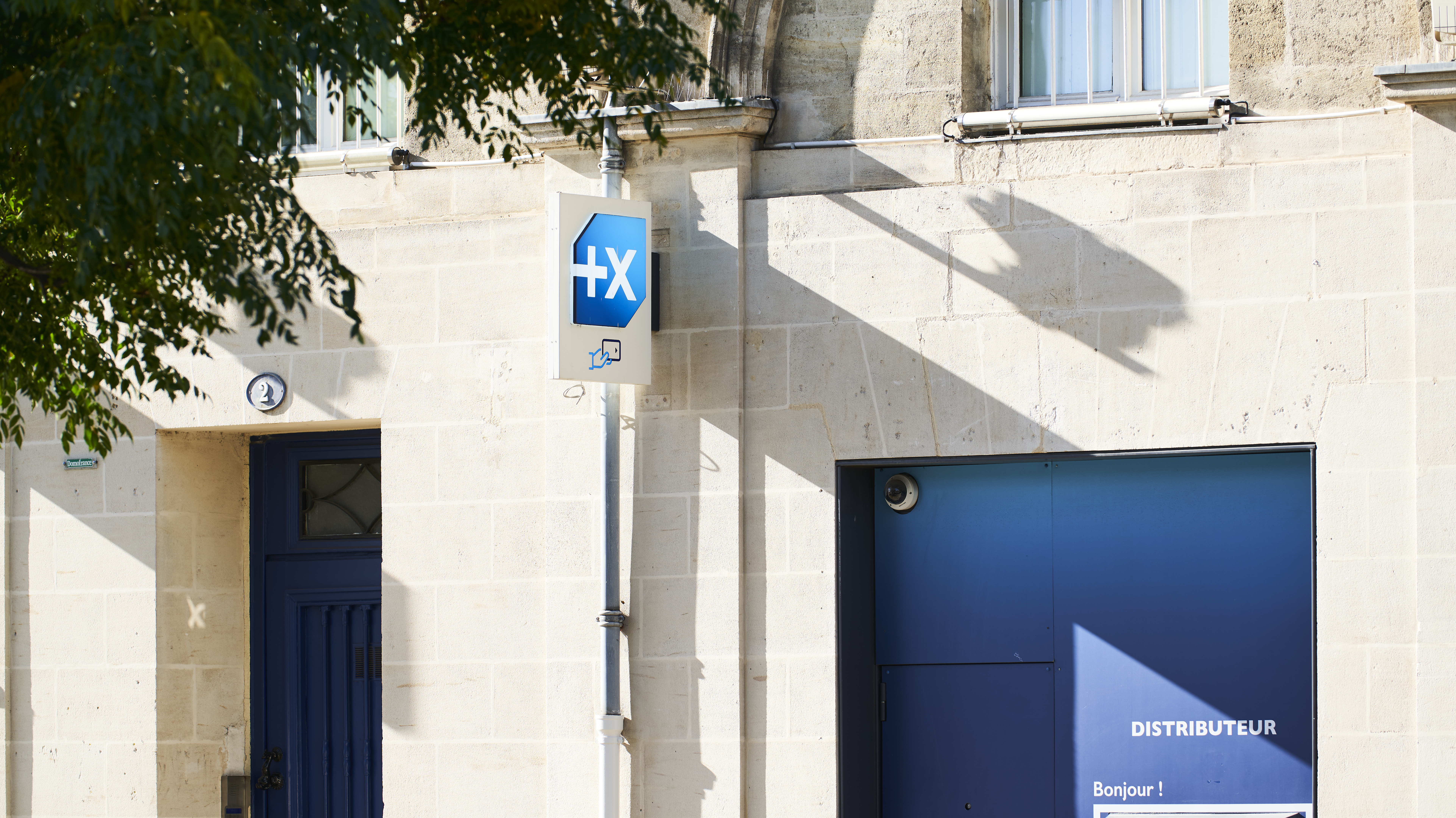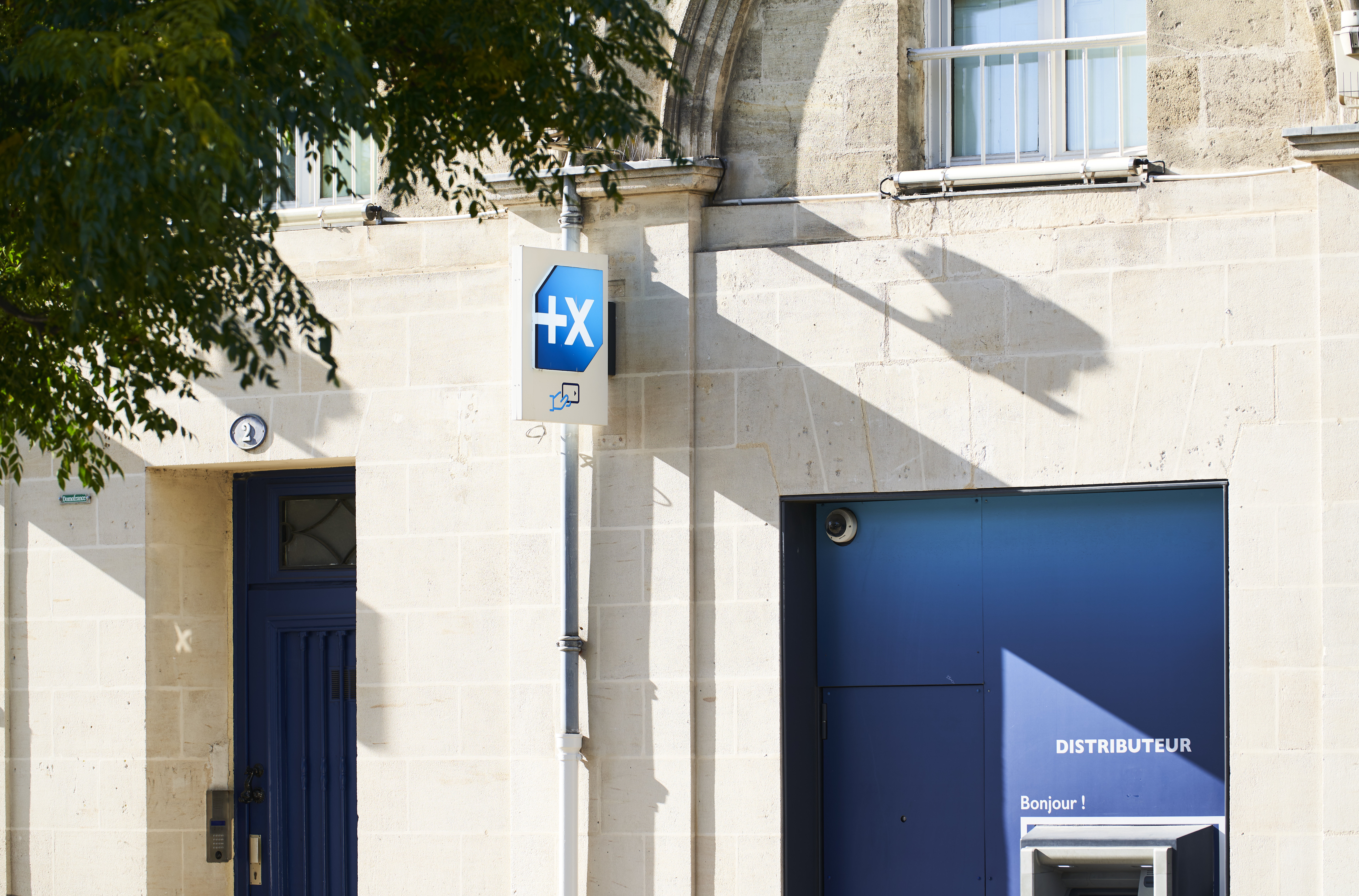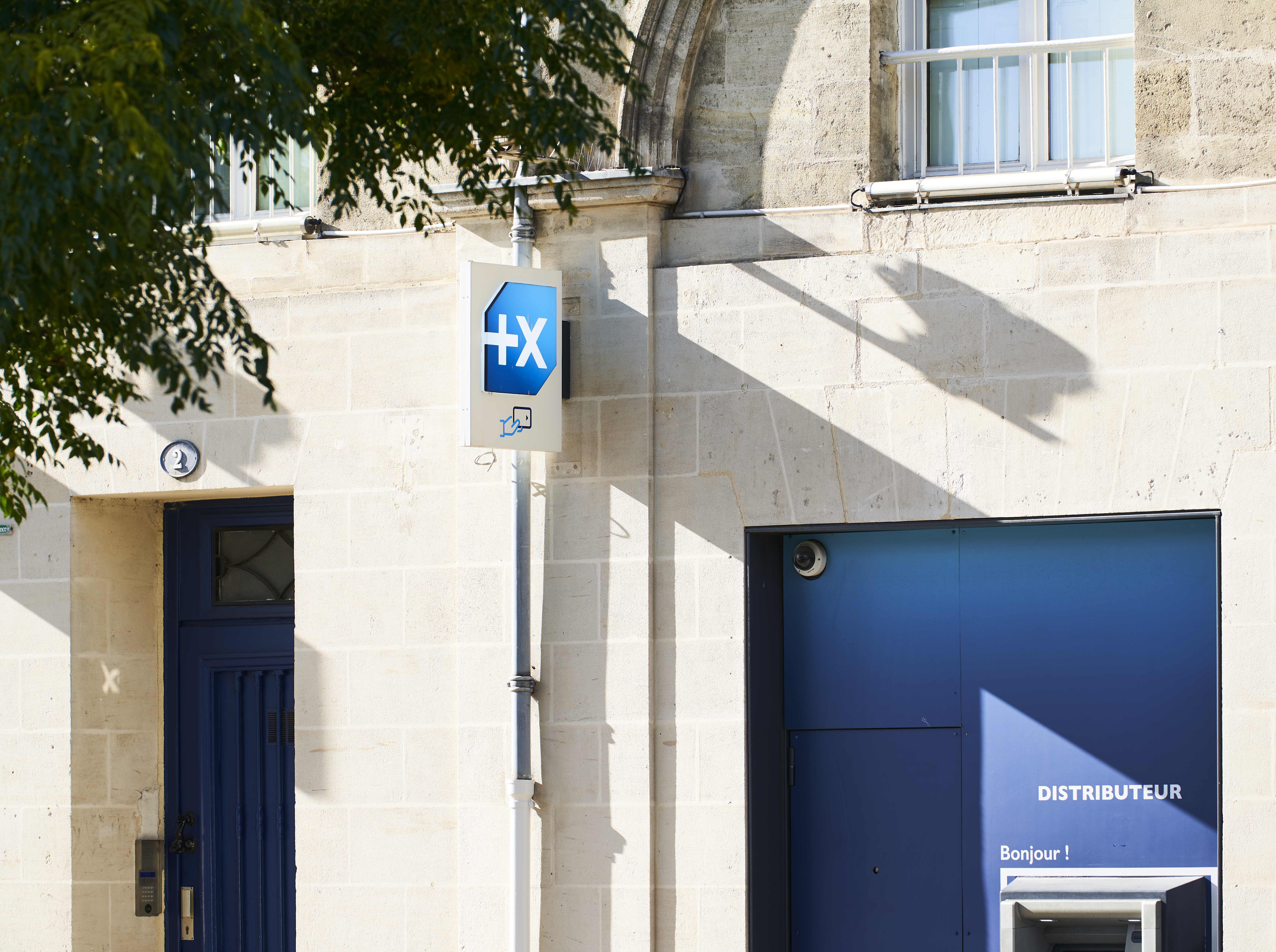 Distributeur automatique de billets (DAB) implanté sur la façade d’un bâtiment en pierre, indiquant un accès aux services bancaires en France.
