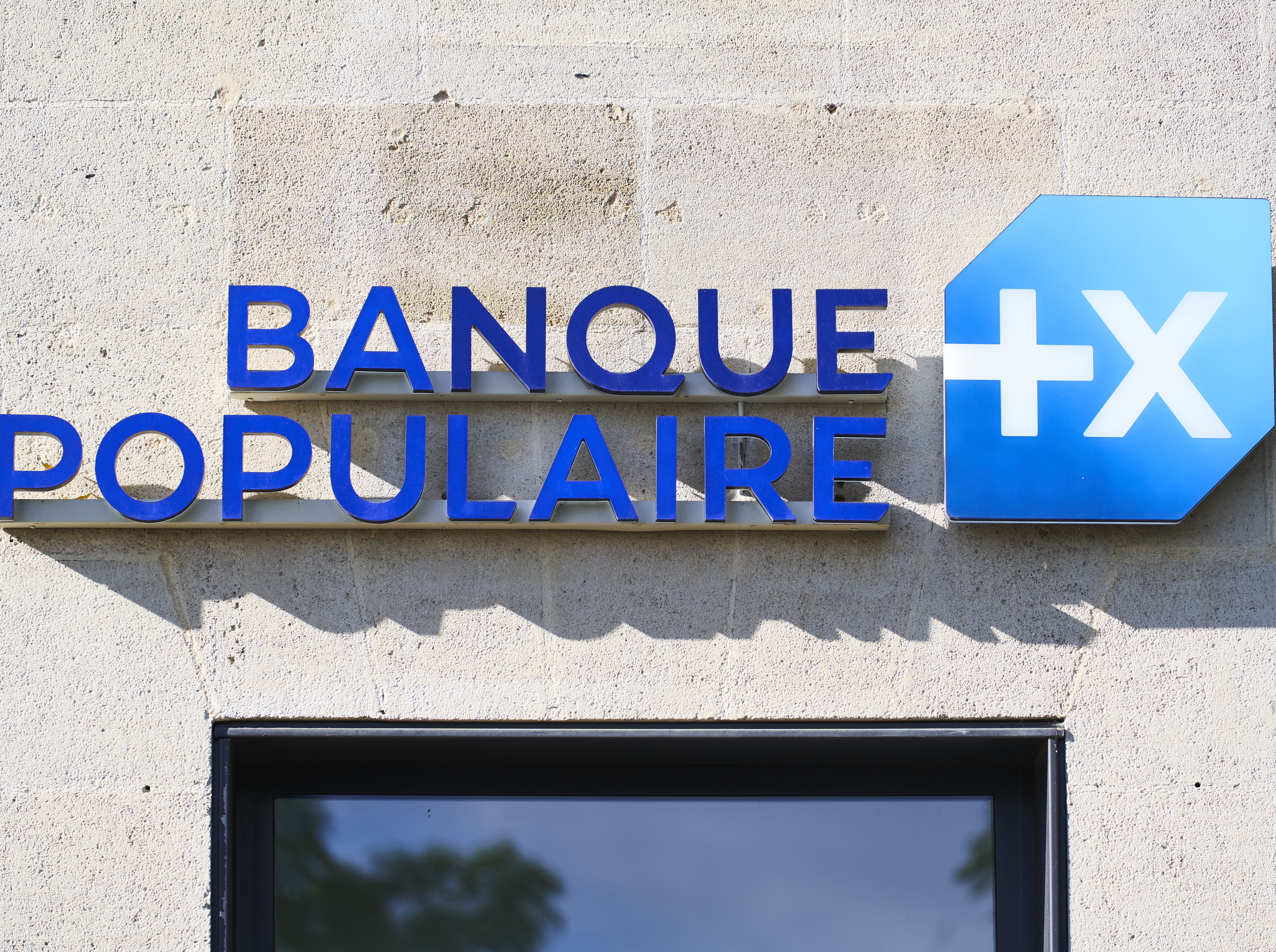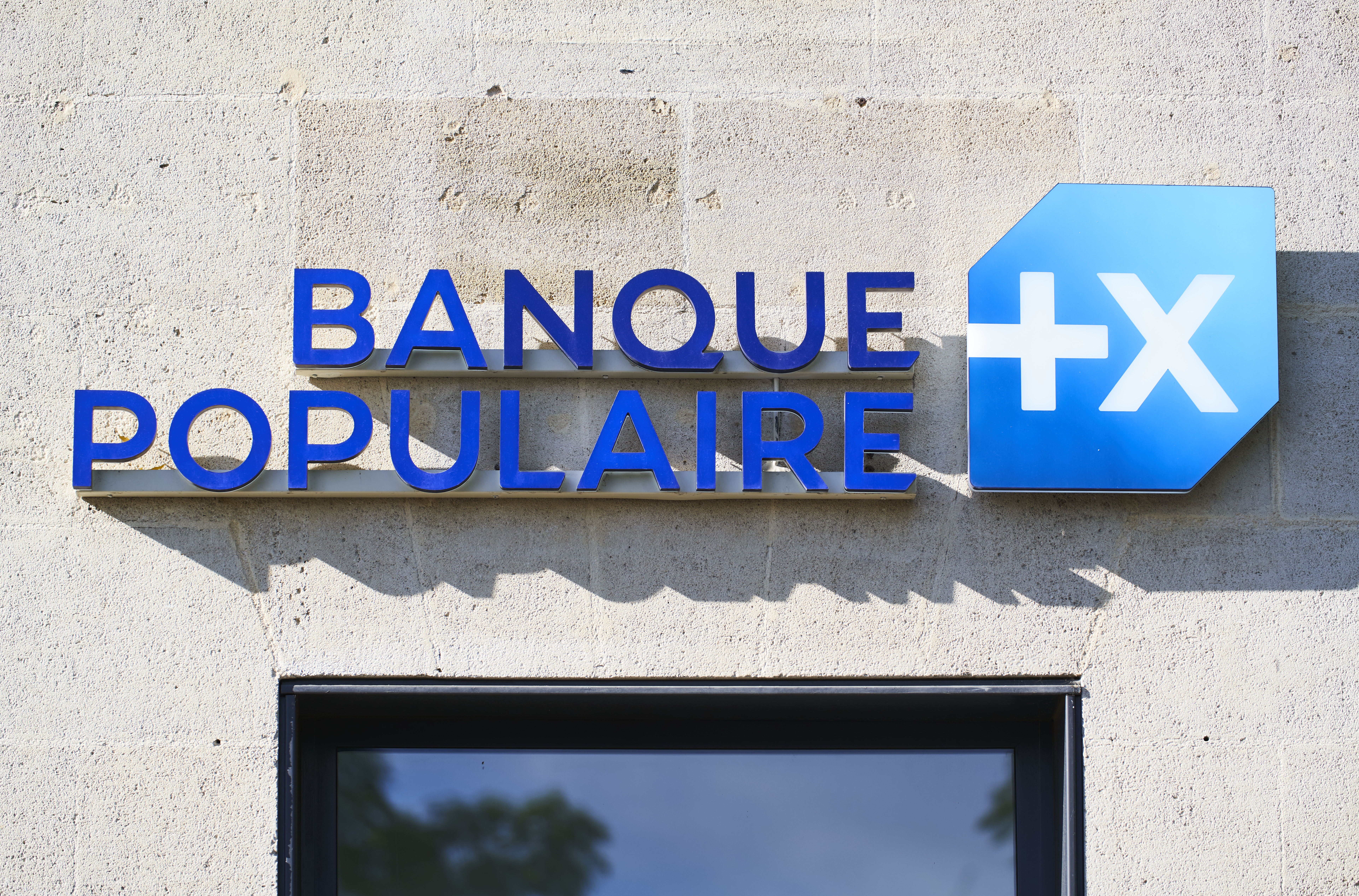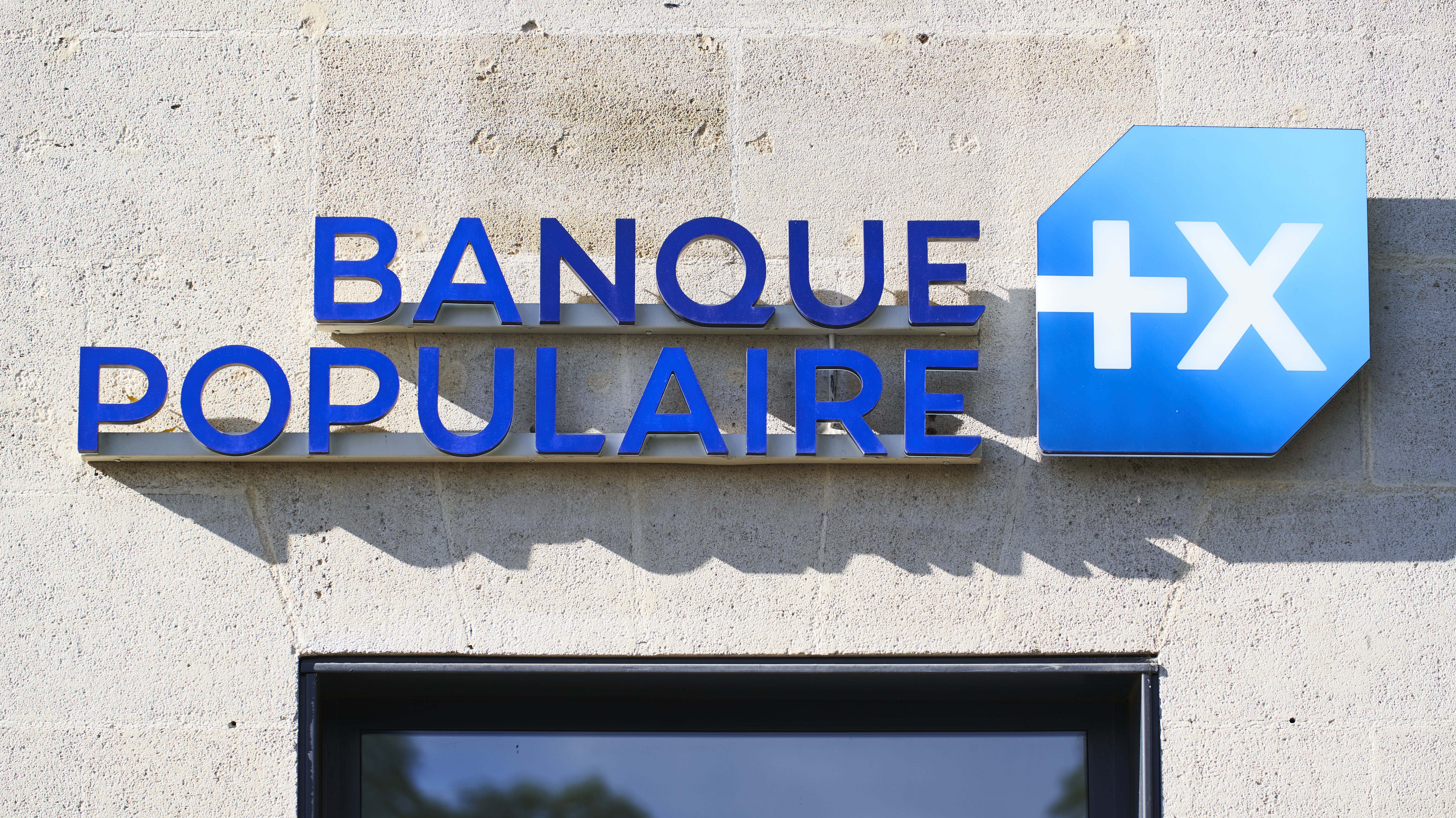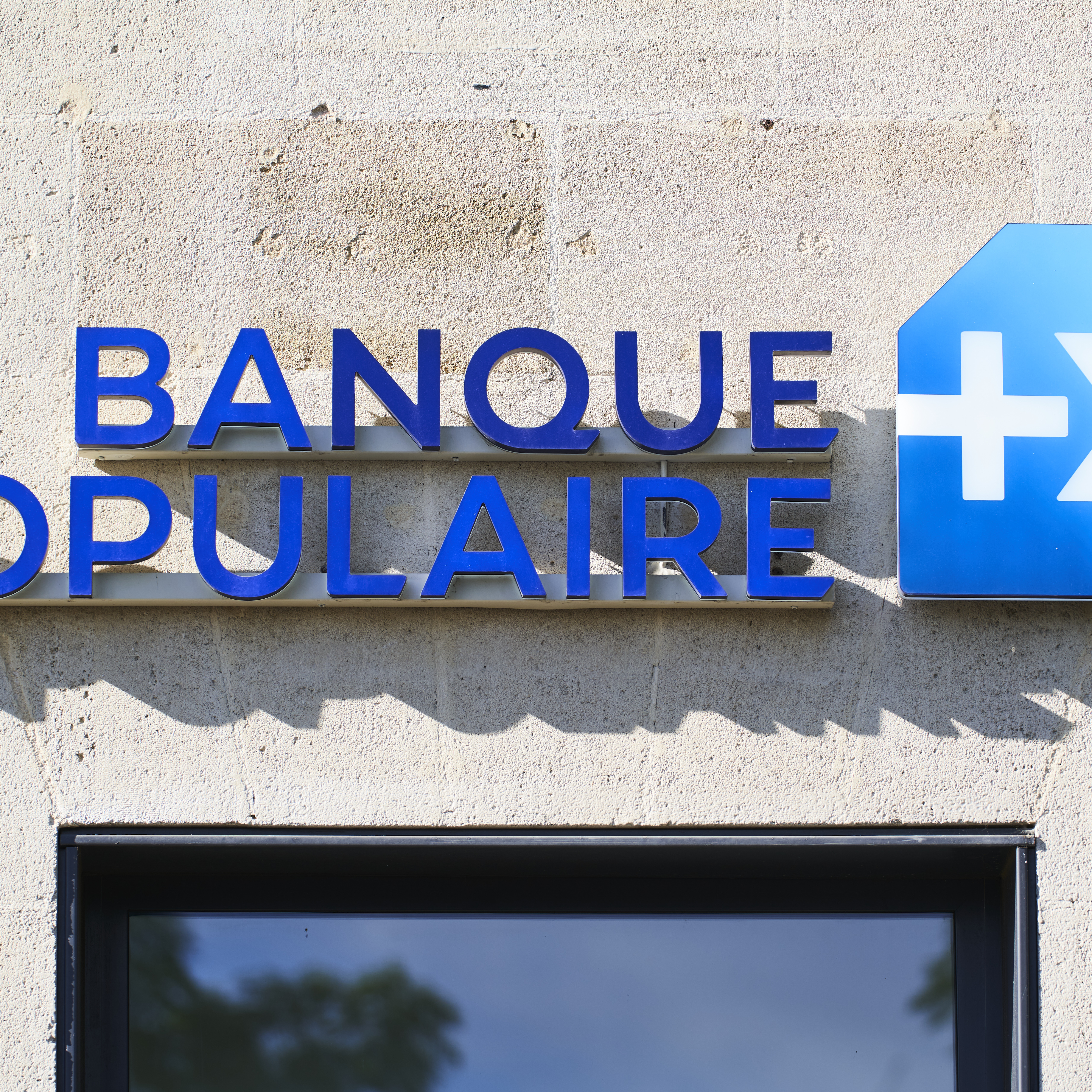 Logo éclairé de la Banque Populaire sur la façade d’une agence bancaire, illustrant l’identité visuelle du groupe coopératif français.