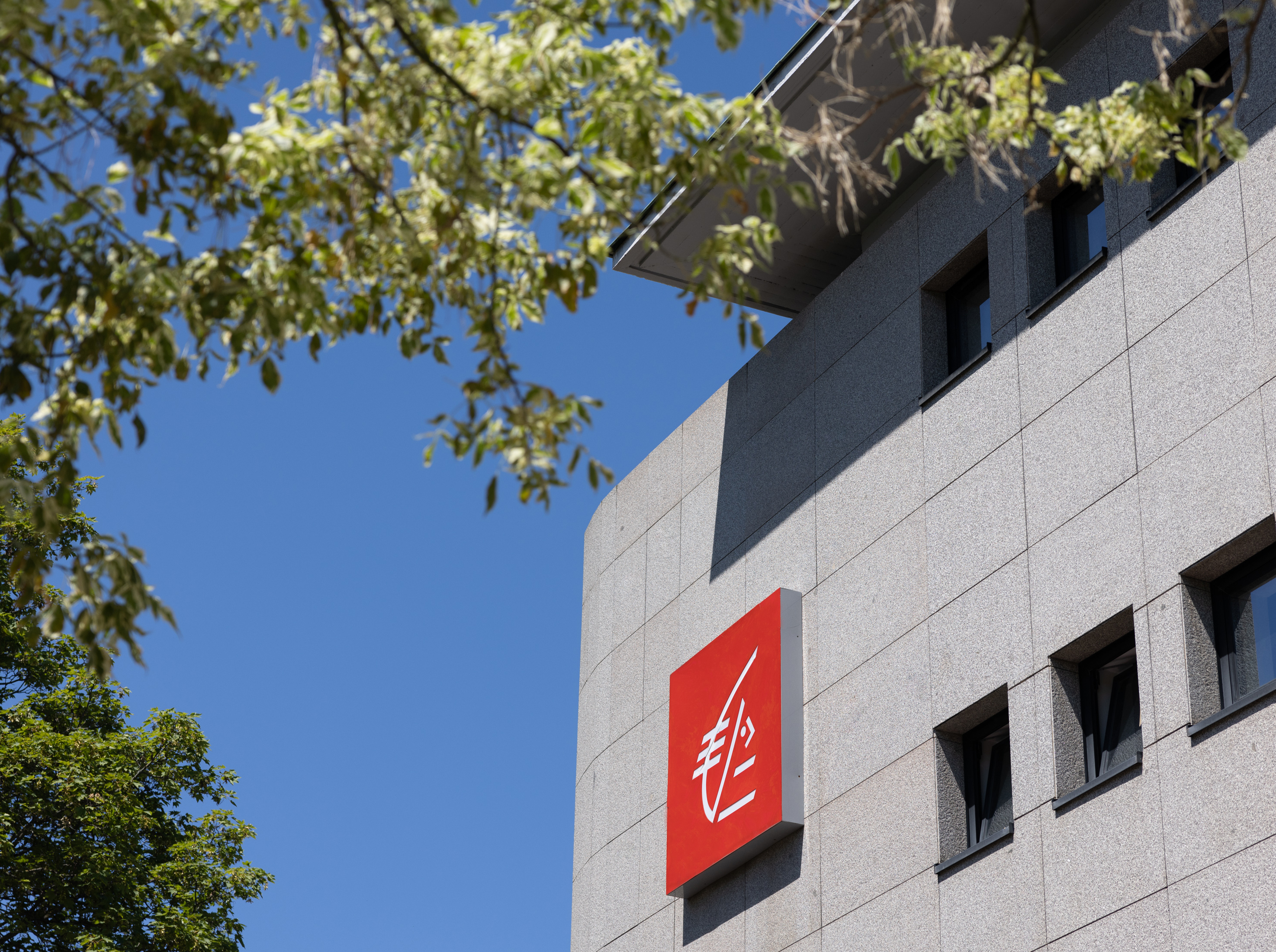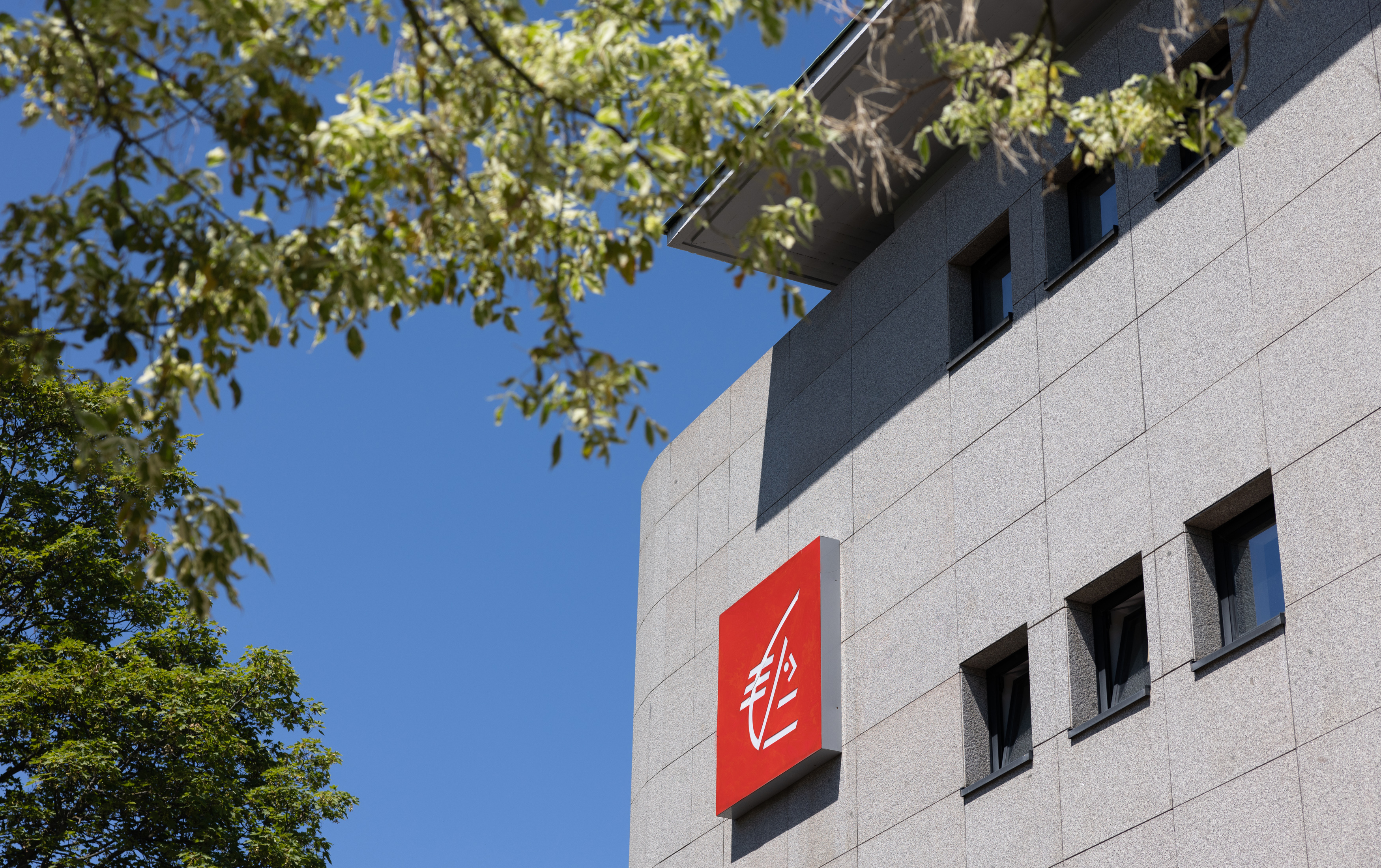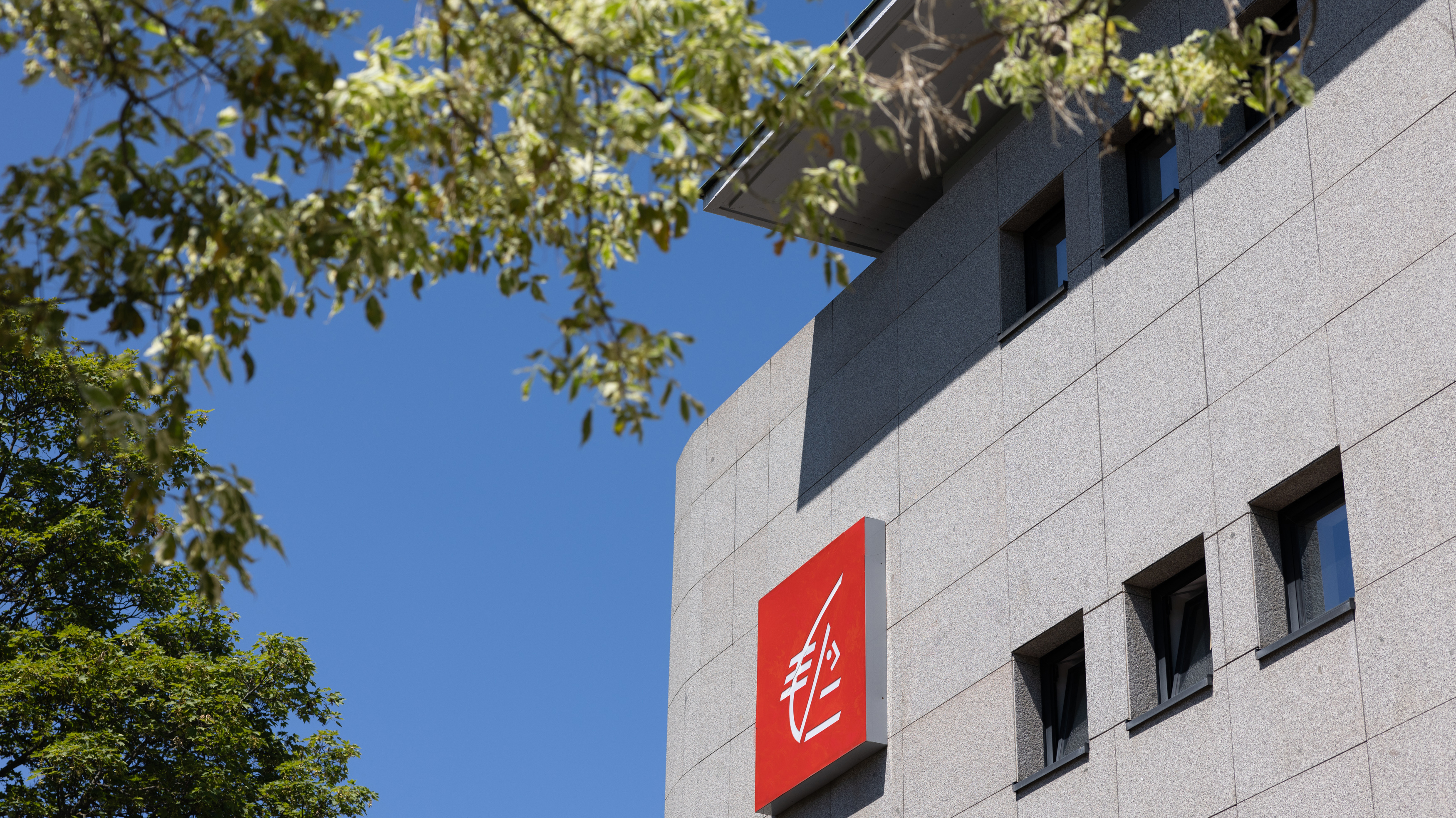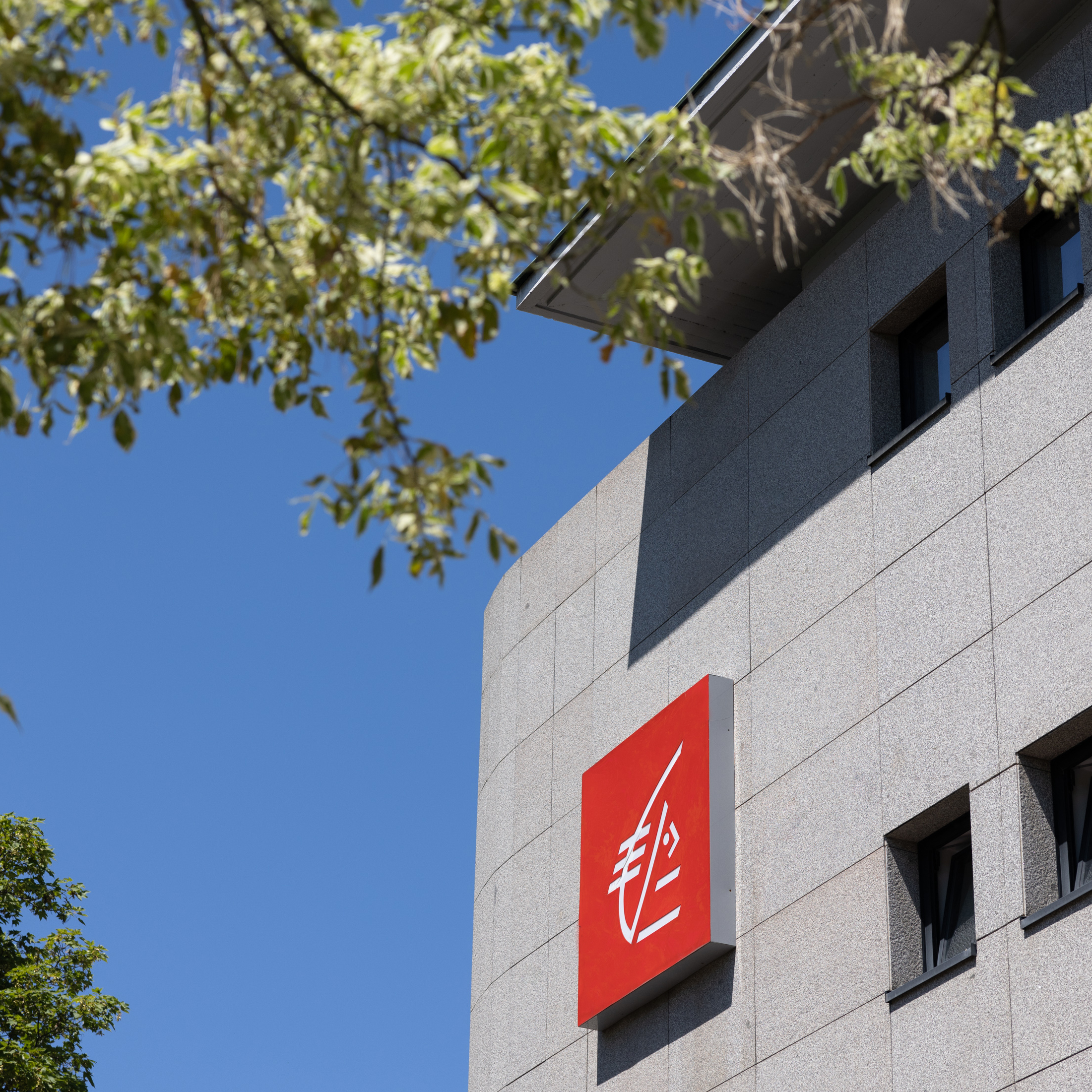 Façade d'un bâtiment moderne avec un logo rouge de Caisse d'Epargne, symbole de l'écureuil, sous un ciel bleu et entouré de feuillage.