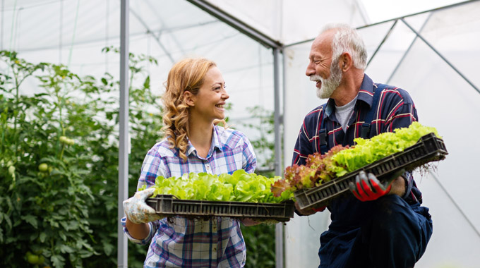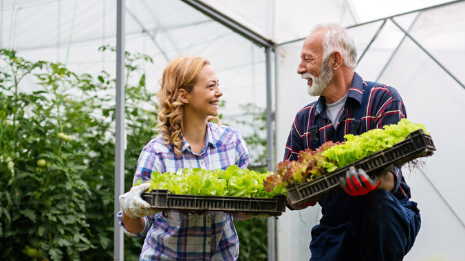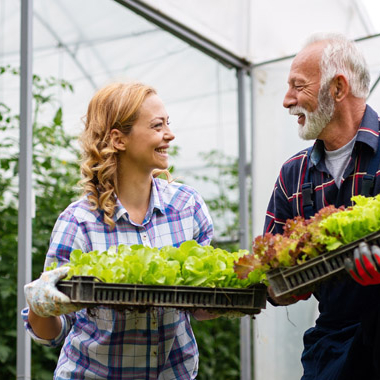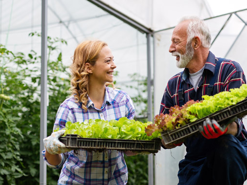 Deux personnes collaborent dans une serre moderne, tenant des cagettes pleines de jeunes légumes prêts à être plantés, illustrant l'agriculture innovante et la production maraîchère sous abri.