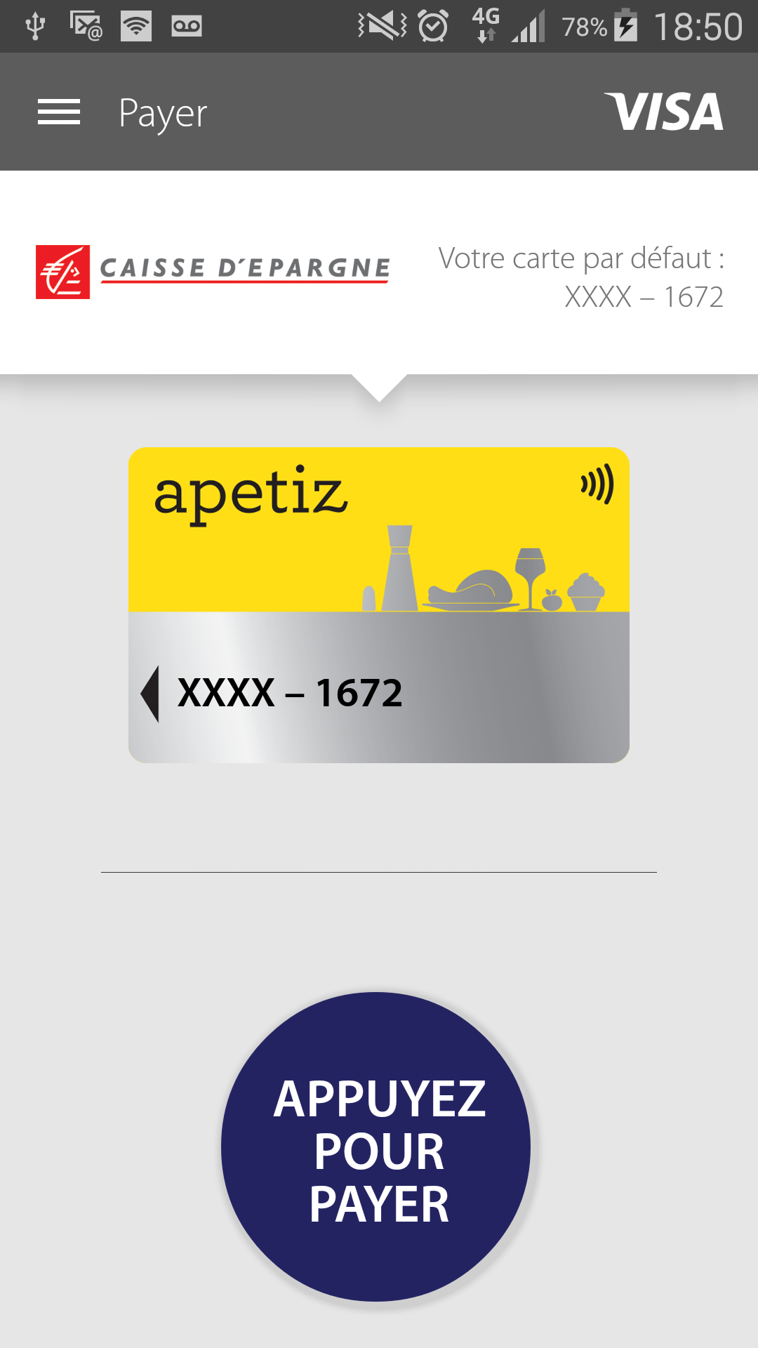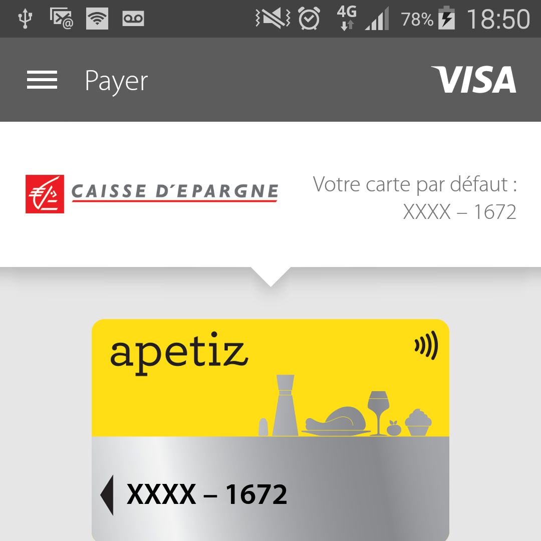 Capture d'écran de l'application mobile Caisse d'Epargne affichant une carte Apetiz pour paiement sans contact via VISA.