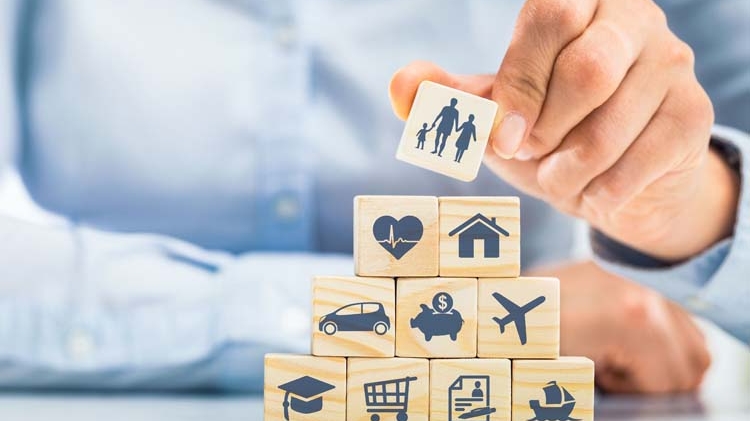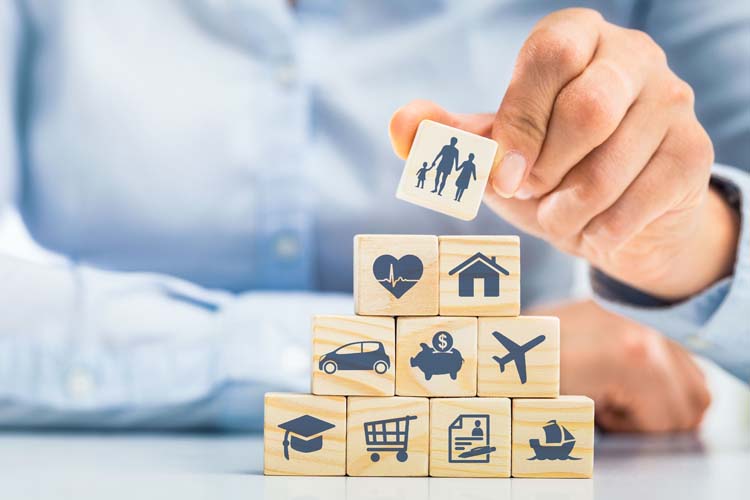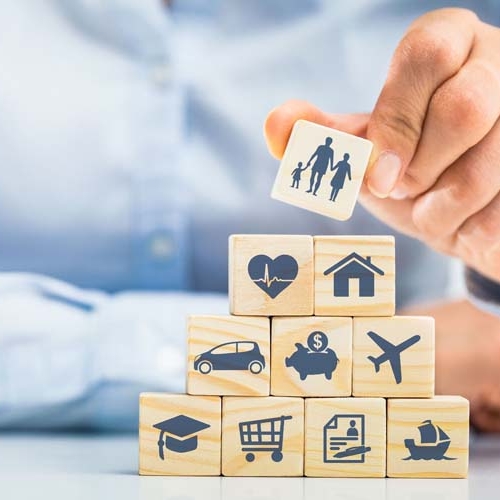 Image de cubes en bois illustrant différents concepts de l'assurance tels que la santé, la famille, la maison, l'automobile, l'épargne et les voyages.