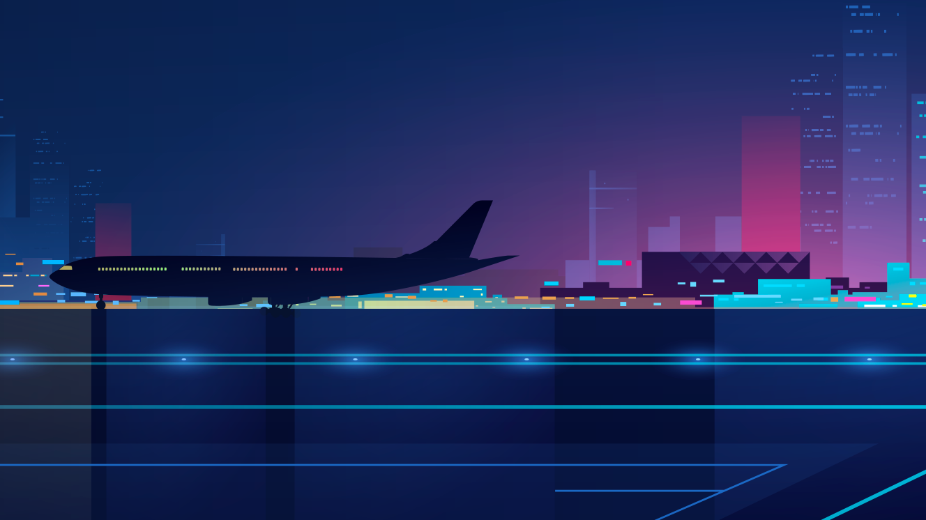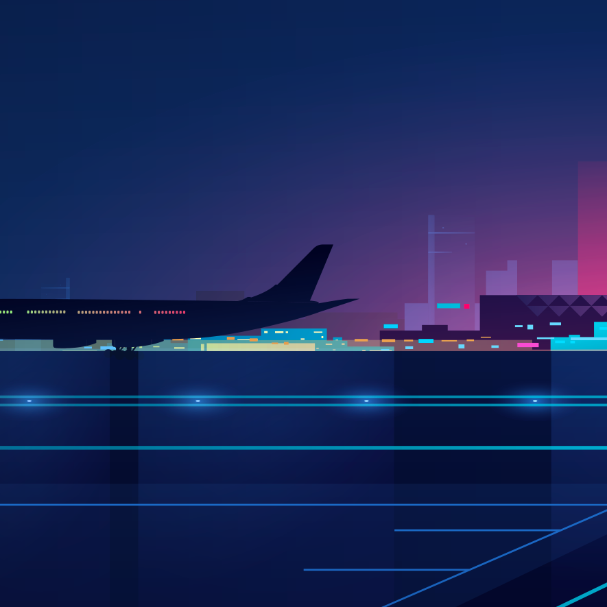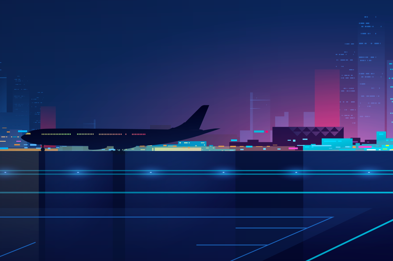 Illustration d'un avion de ligne sur le tarmac d’un aéroport, en silhouette devant une ville moderne éclairée la nuit.