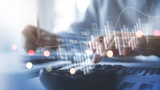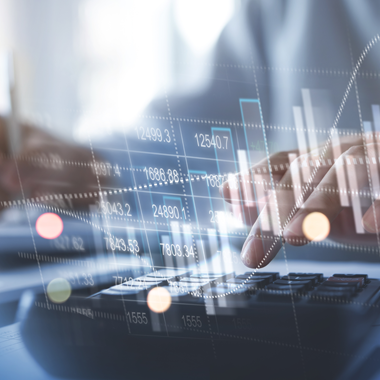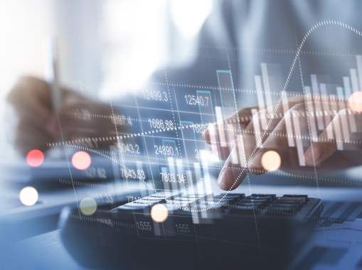 Gros plan sur des mains utilisant une calculatrice et écrivant sur un document financier, avec des graphiques et données boursières en surimpression, illustrant l'analyse financière en environnement professionnel.