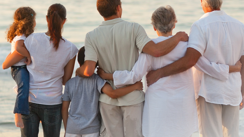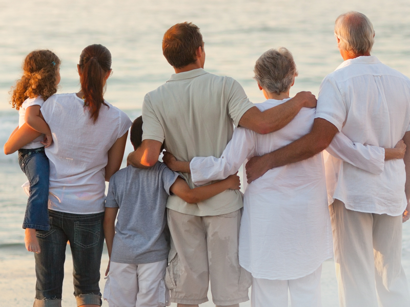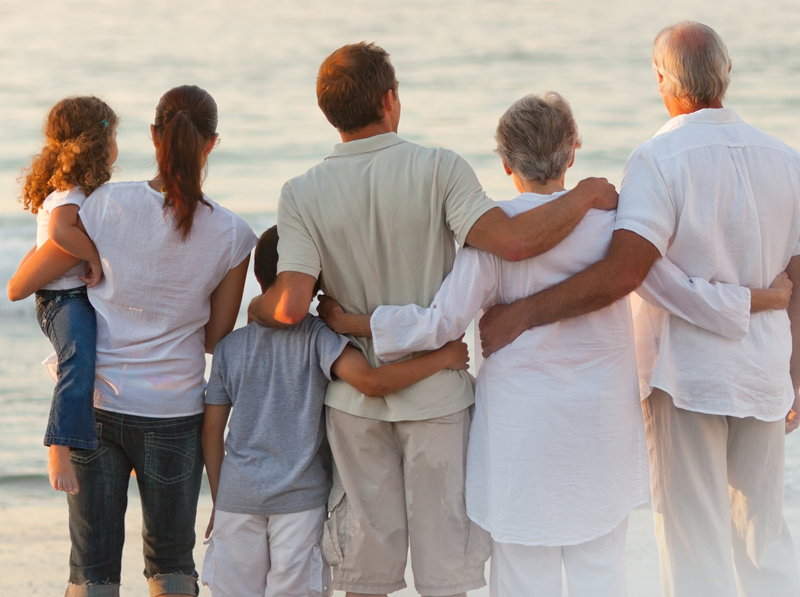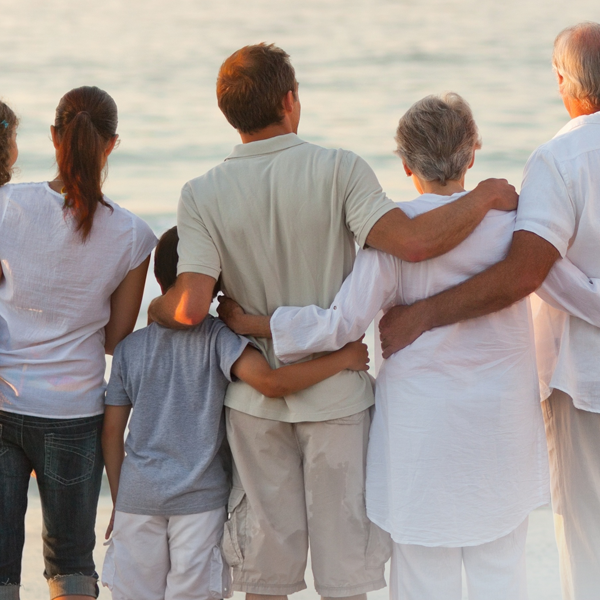 Trois générations d'une famille regardent la mer, illustrant les enjeux intergénérationnels liés à la retraite et à l'épargne en France.