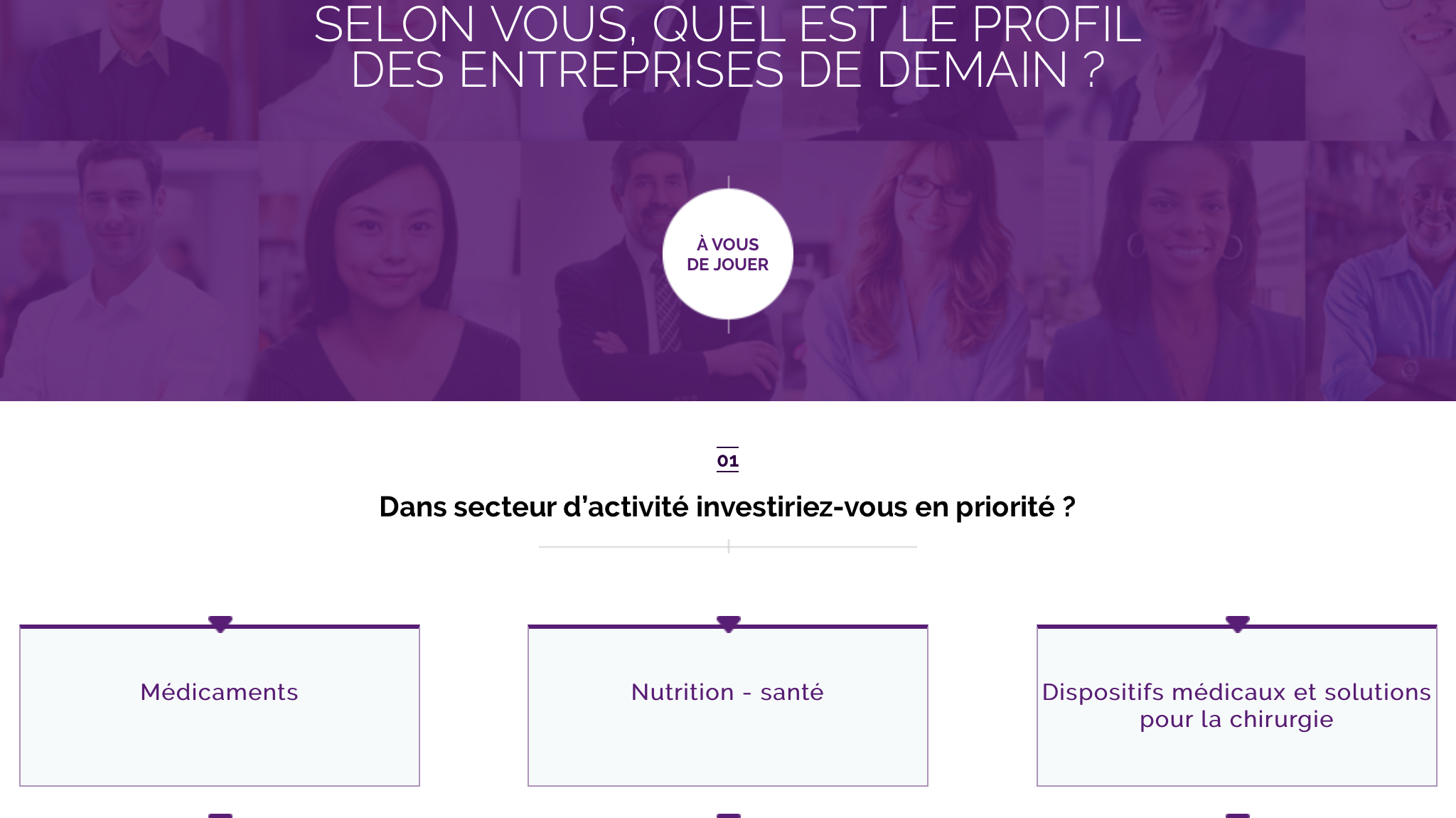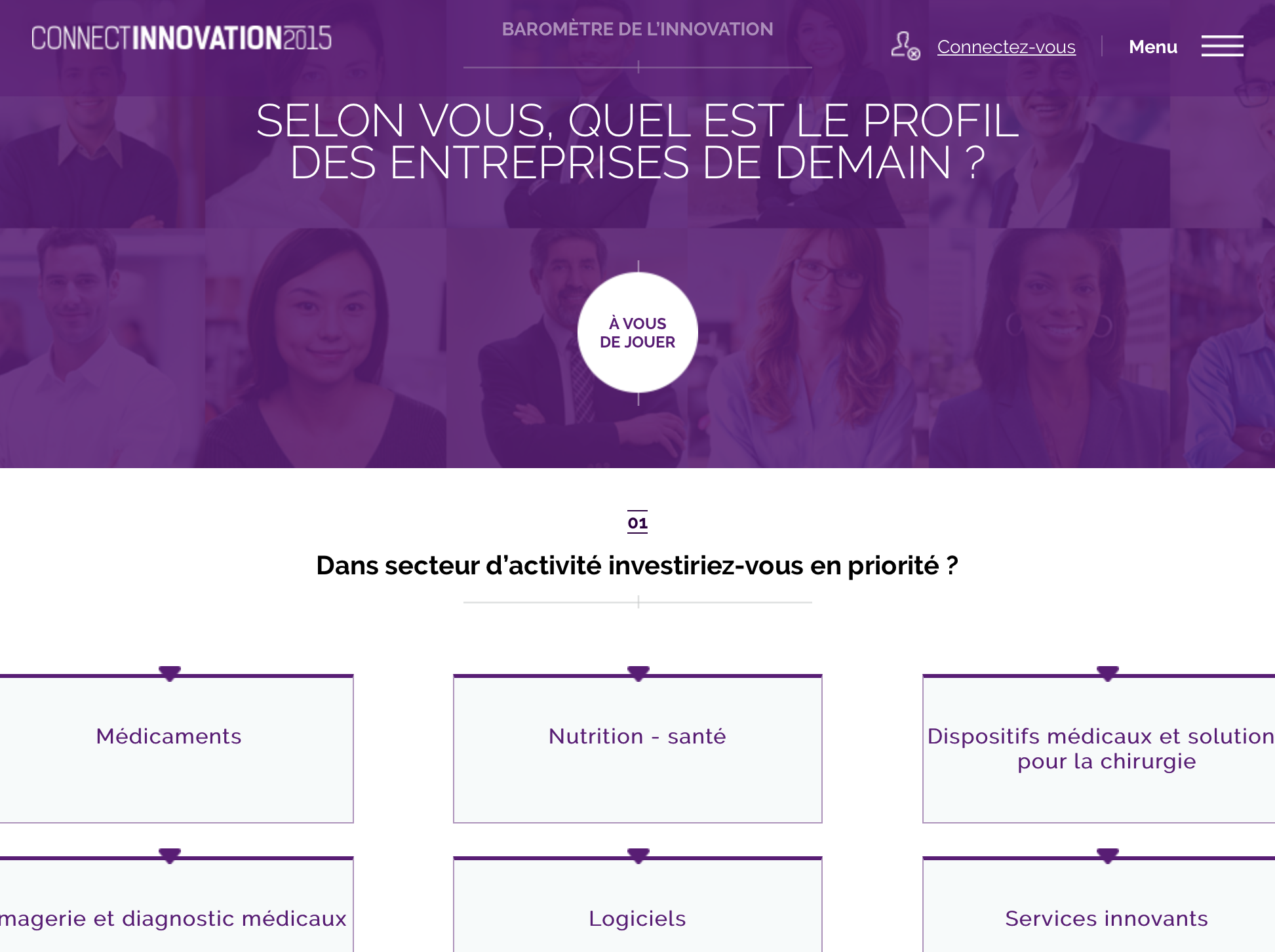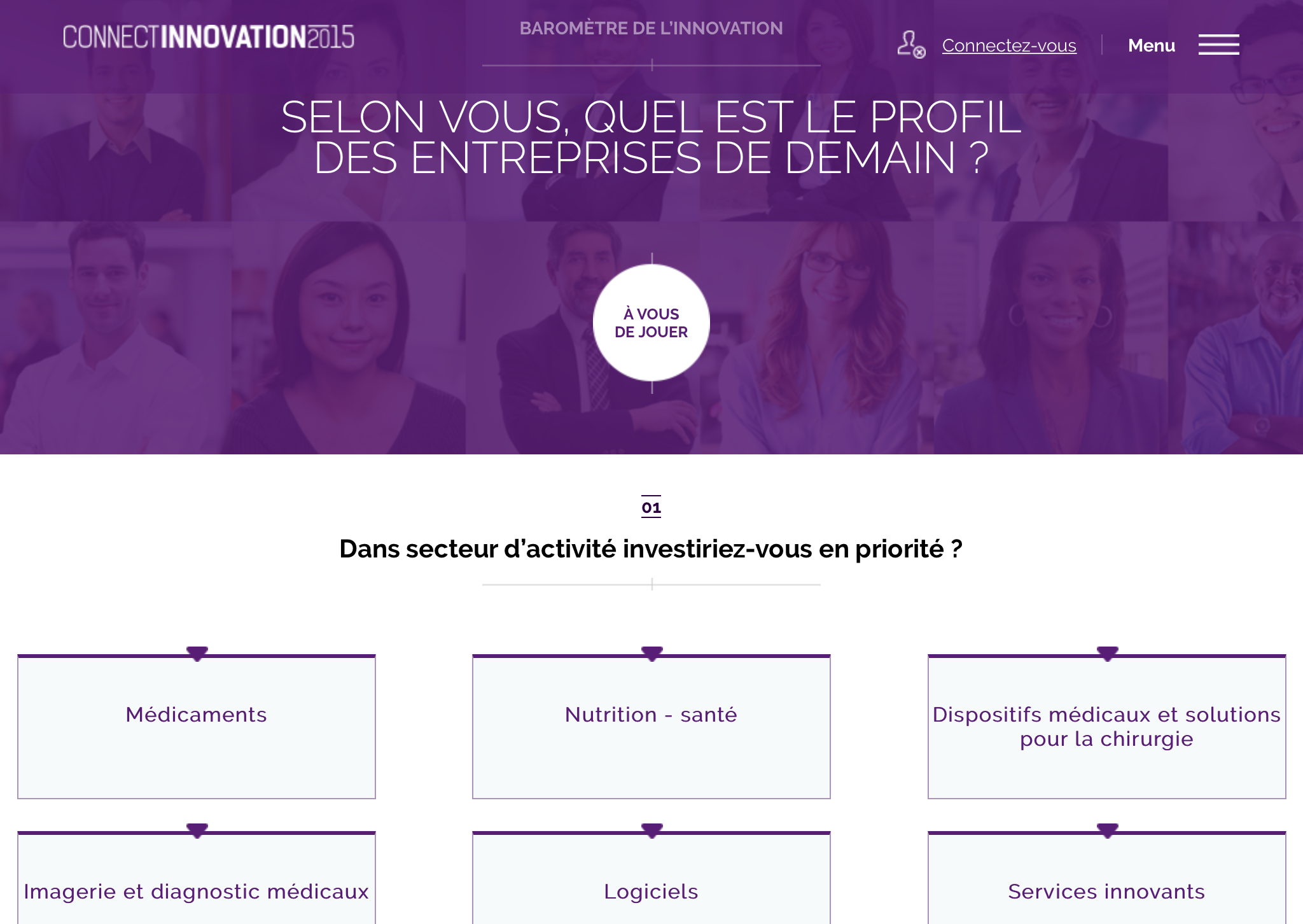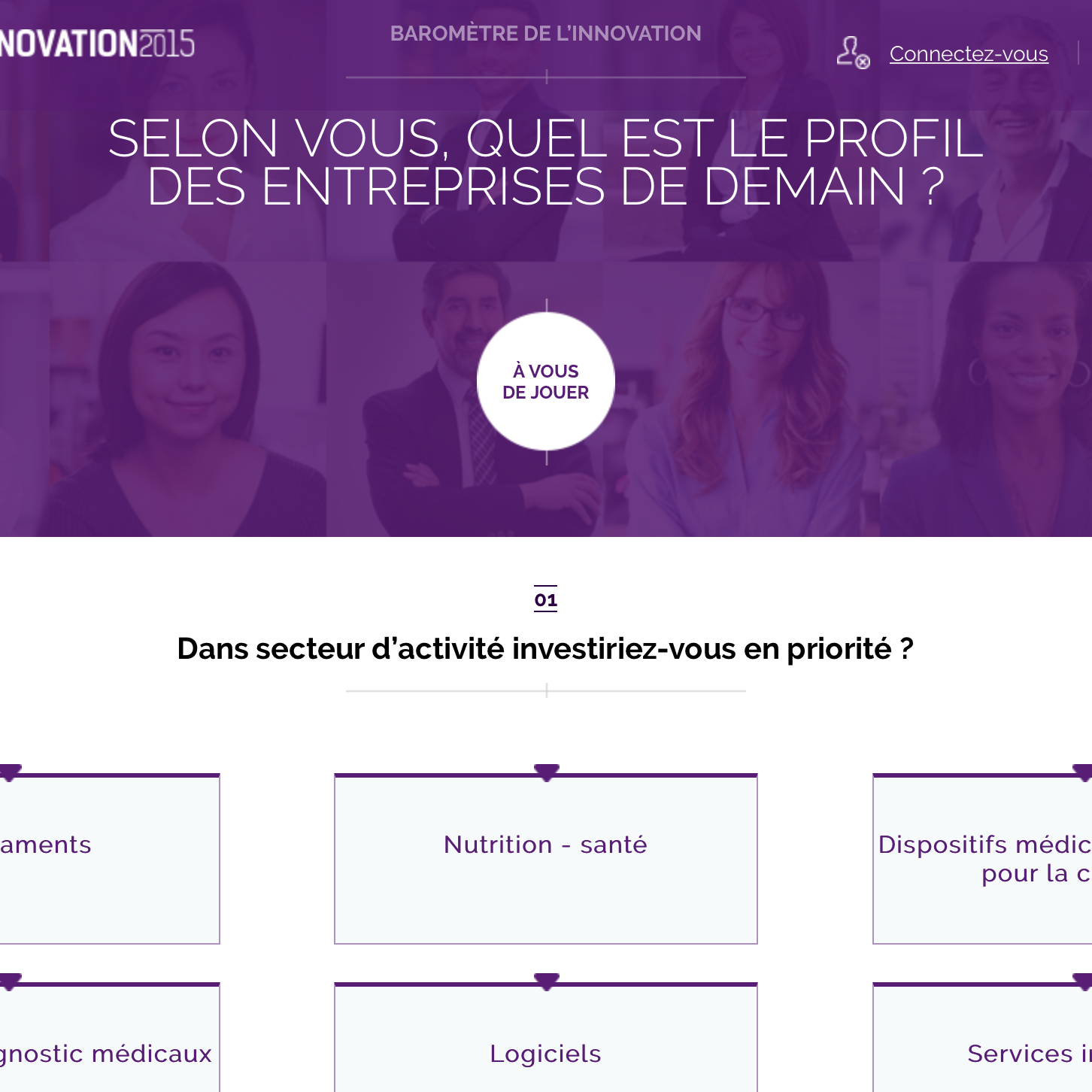 Page interactive du Baromètre de l'Innovation 2015 proposant aux utilisateurs de choisir le secteur d'activité dans lequel investir en priorité, parmi des choix comme médicaments, nutrition-santé ou logiciels.