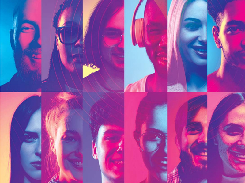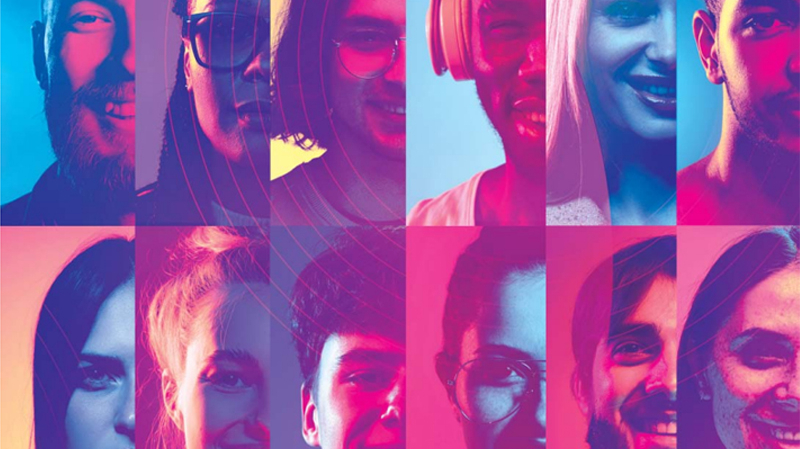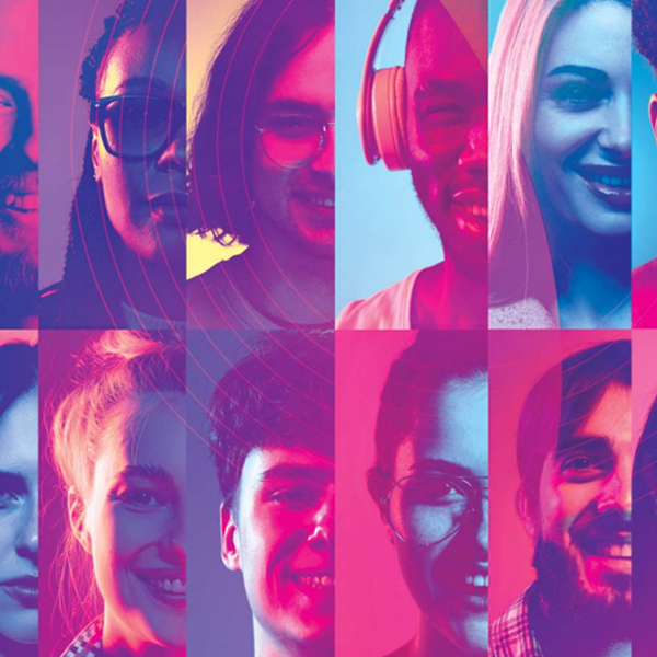 Mosaïque de portraits de jeunes adultes d'origines diverses sur fond coloré, illustrant la diversité générationnelle et culturelle.