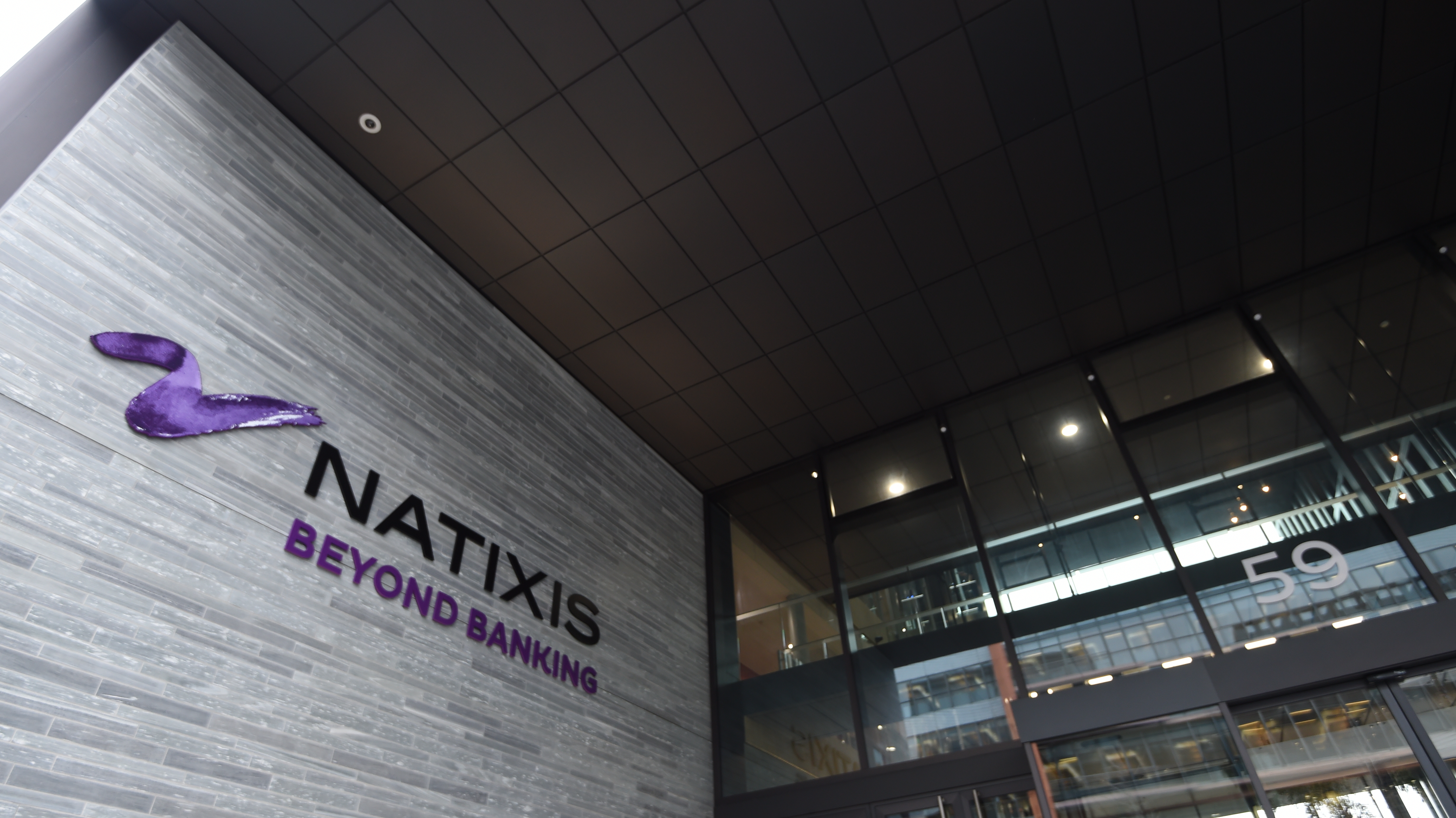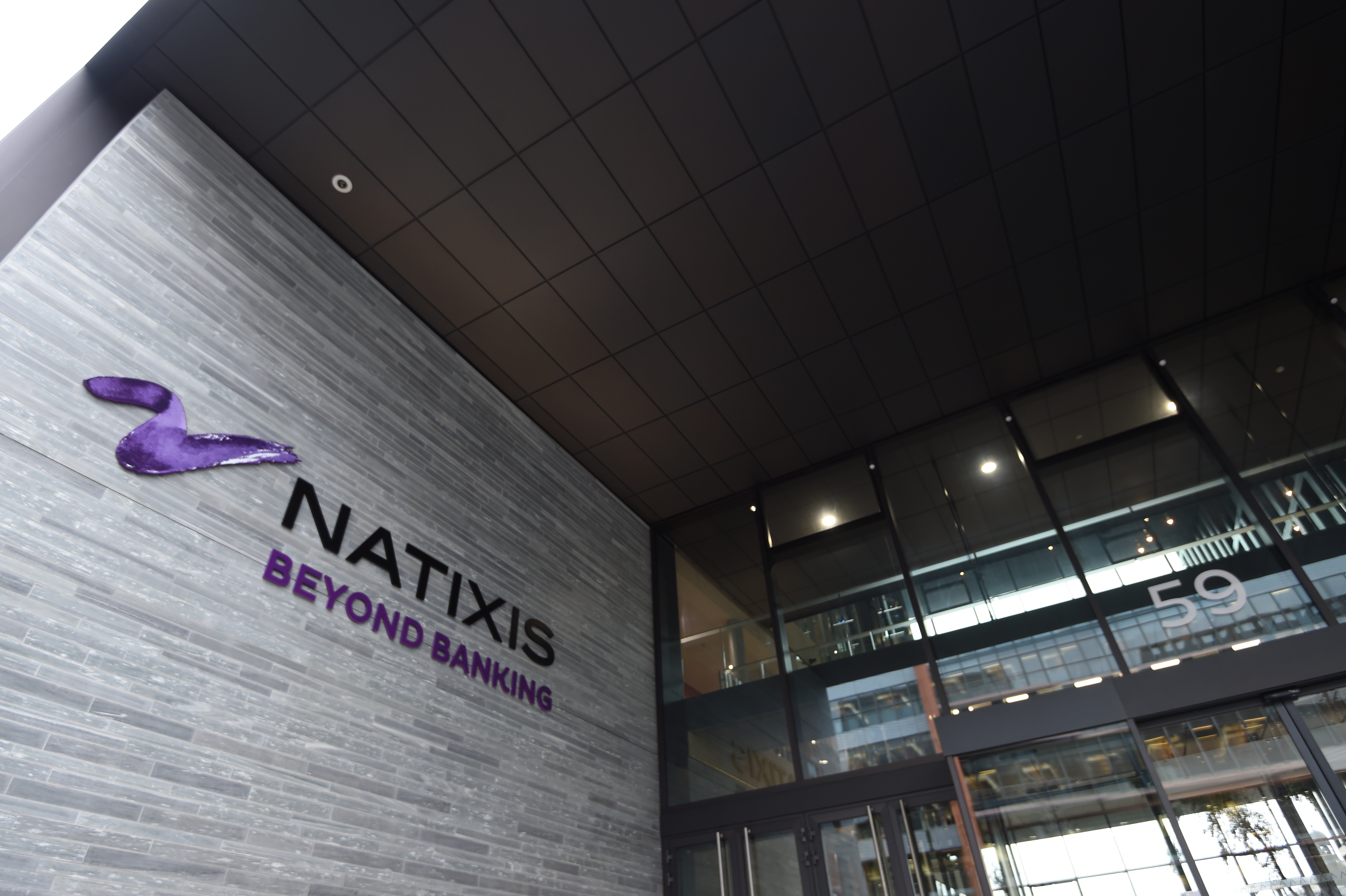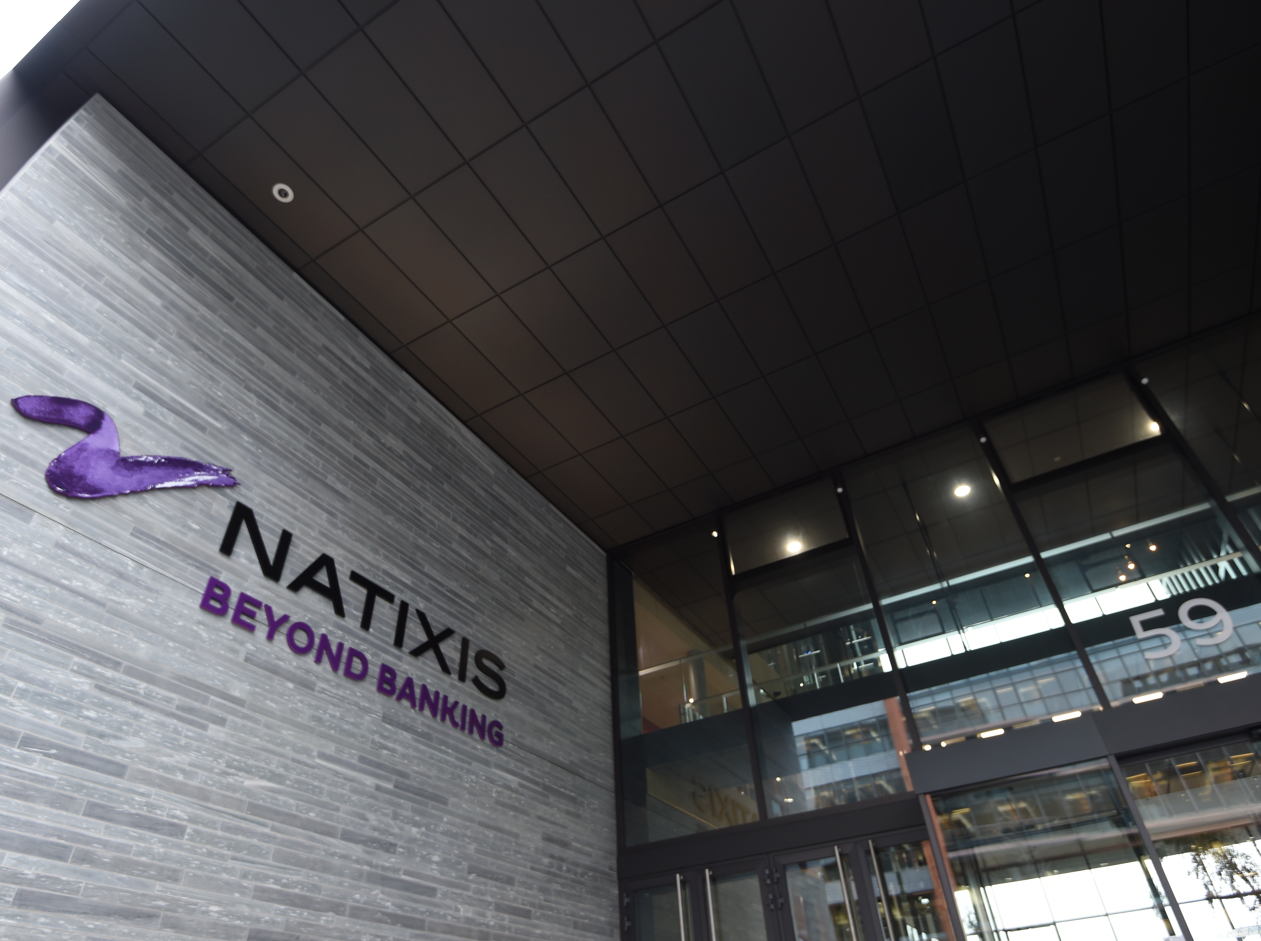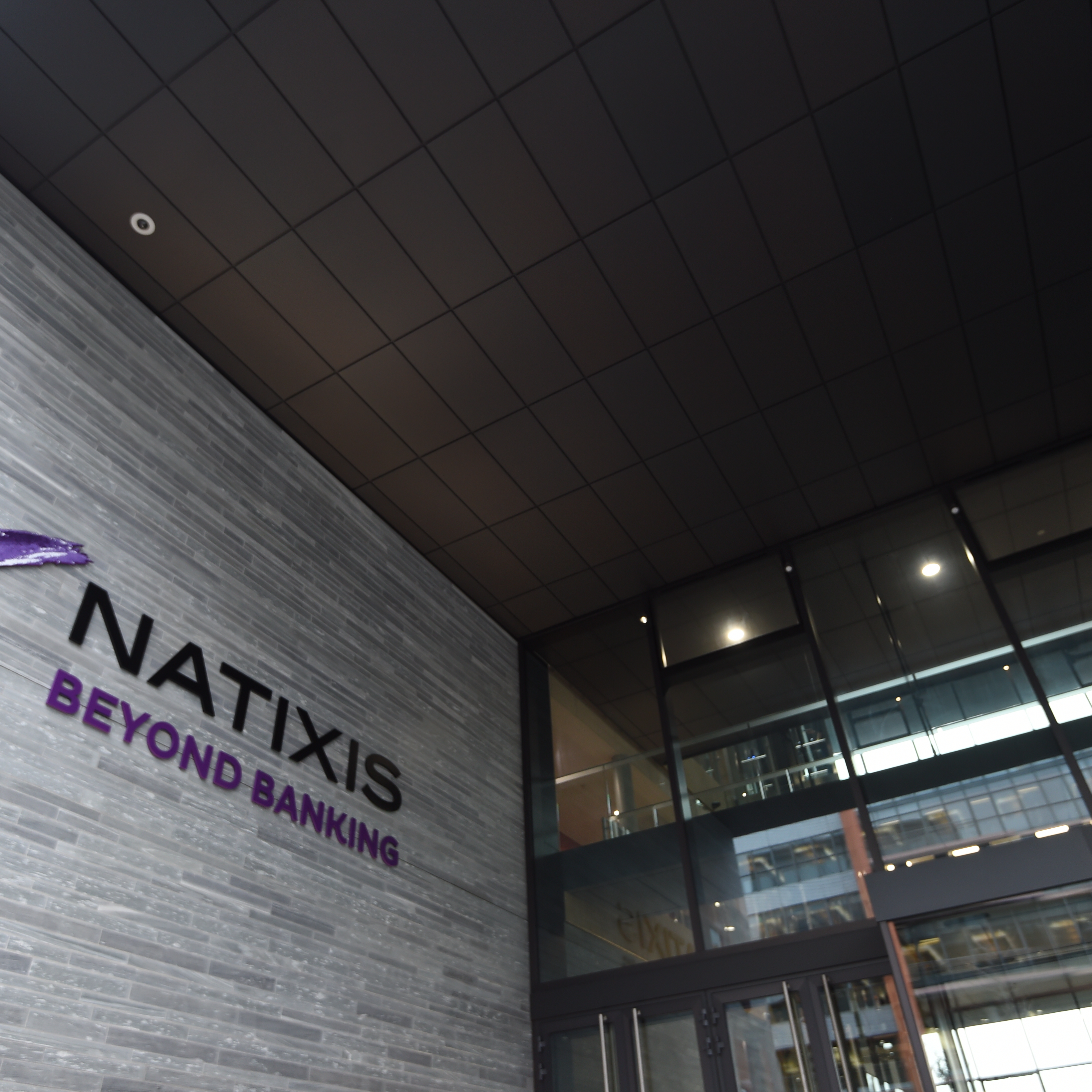 Façade du siège de Natixis avec logo et slogan Beyond Banking, illustrant l'entrée principale d'un bâtiment moderne situé au 59.