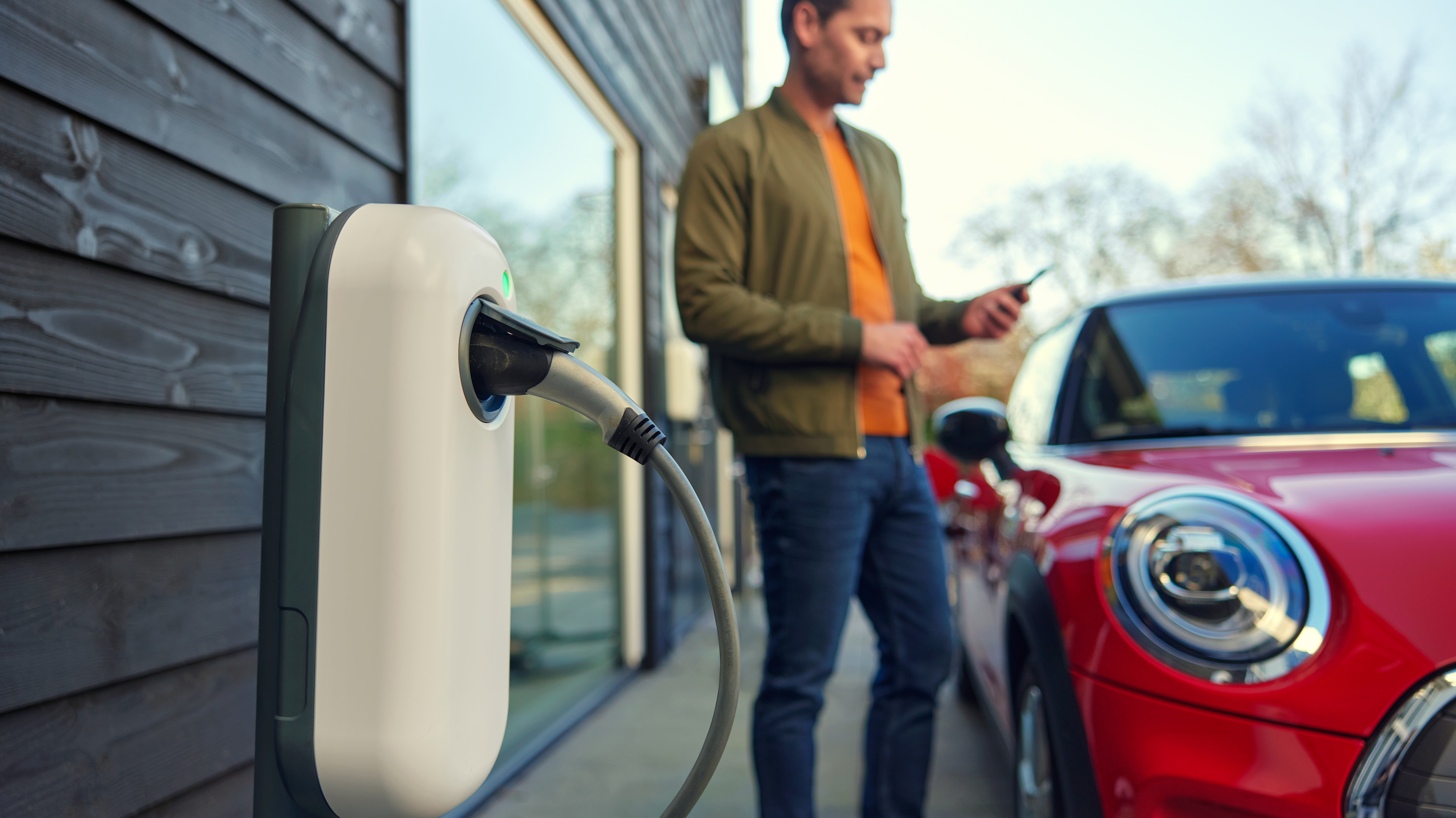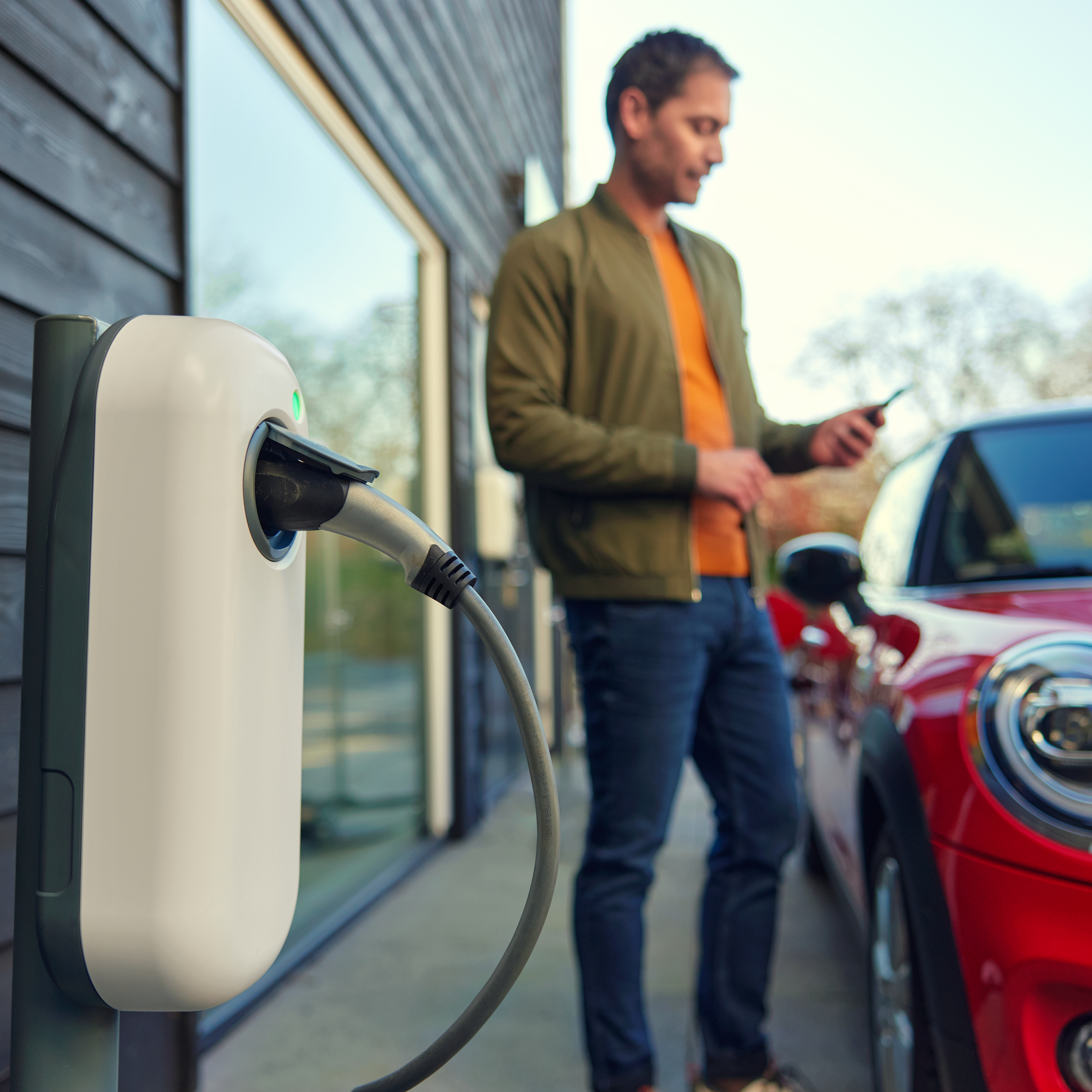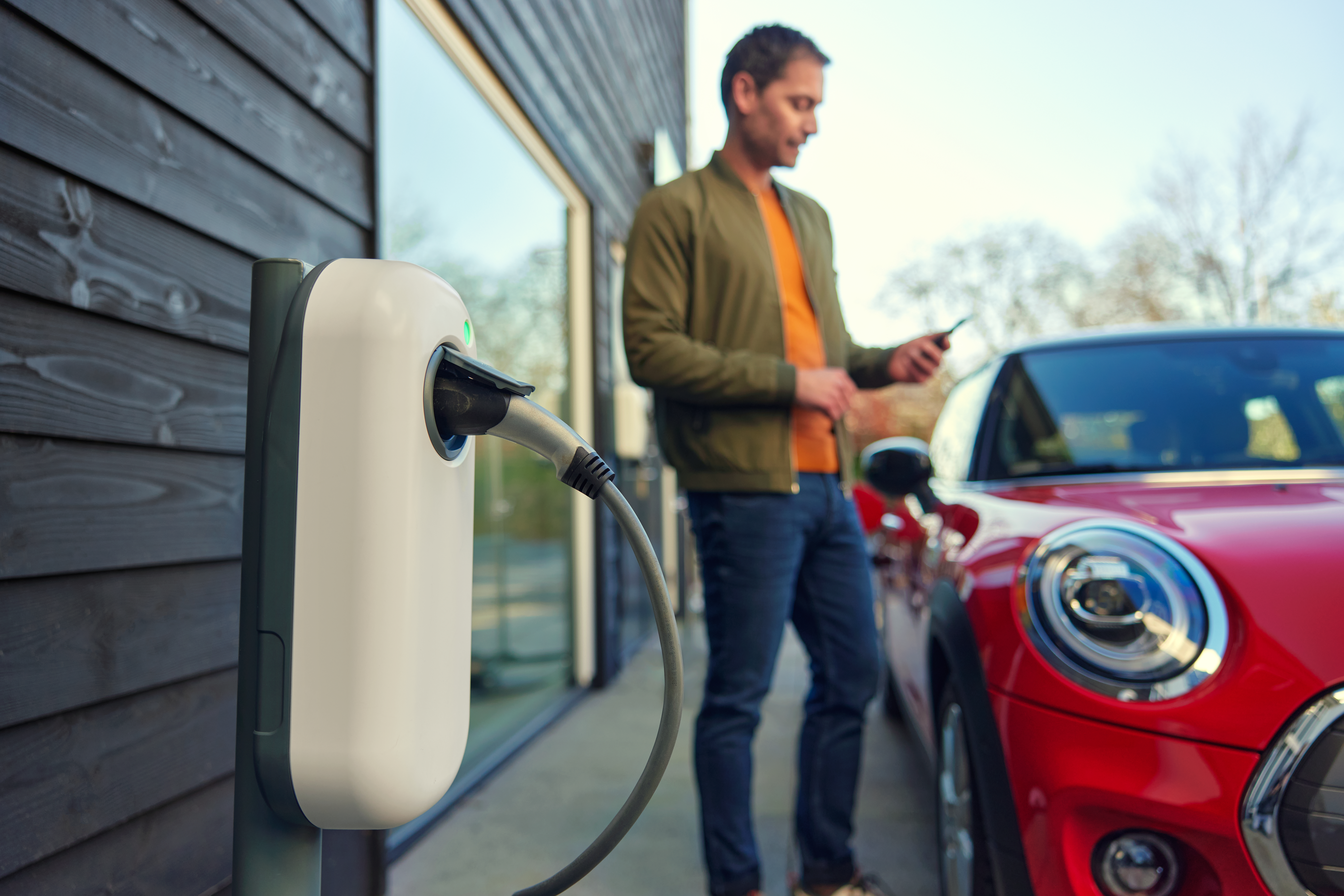 Une borne de recharge pour voiture électrique connectée, avec un homme debout à côté d'une voiture électrique rouge, utilisant son téléphone près d'un bâtiment moderne.