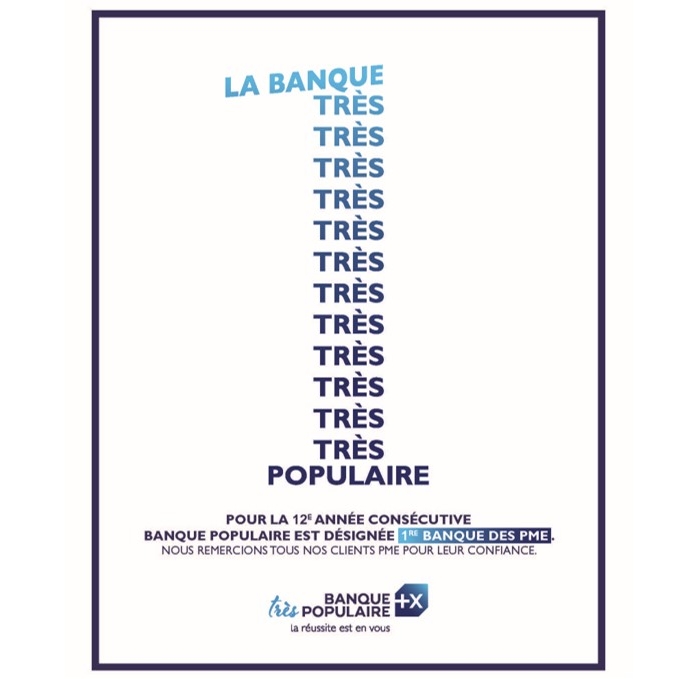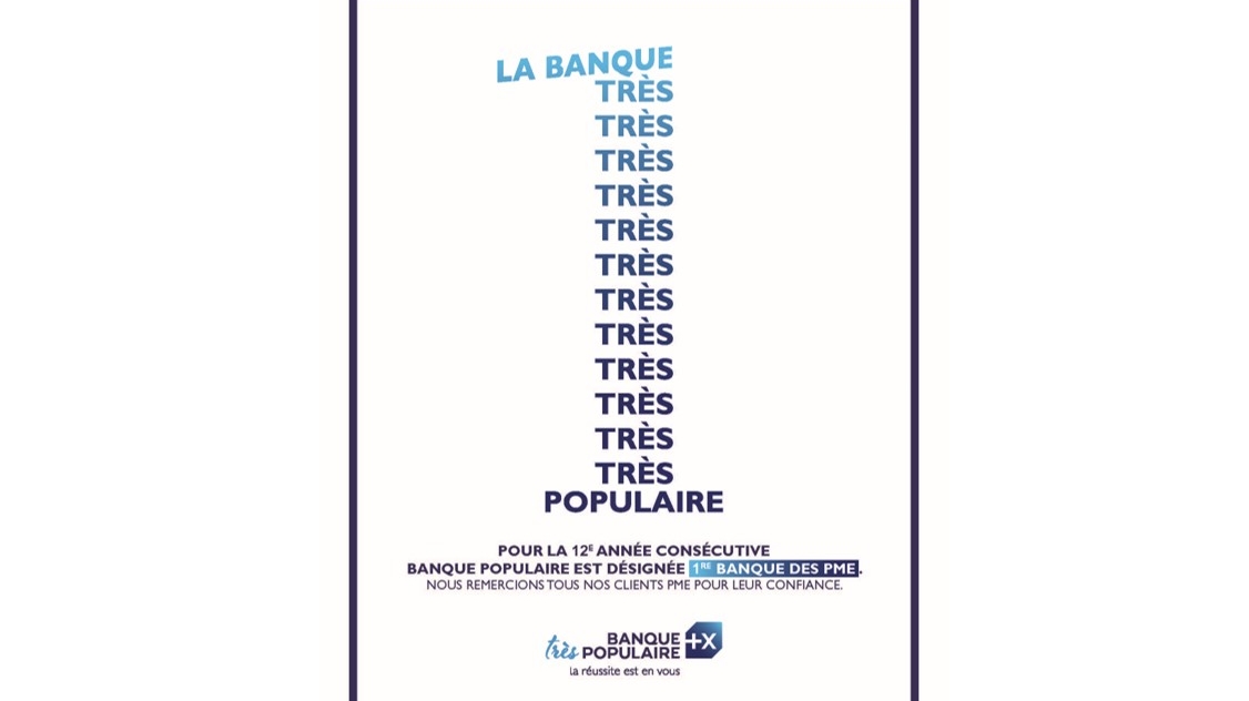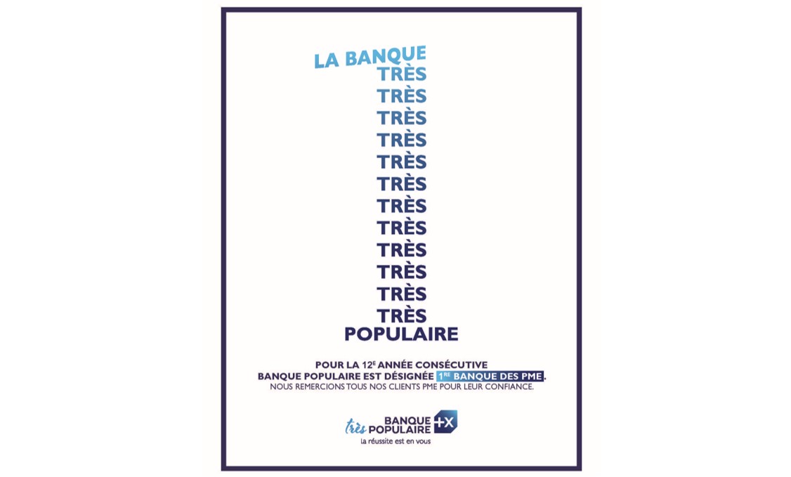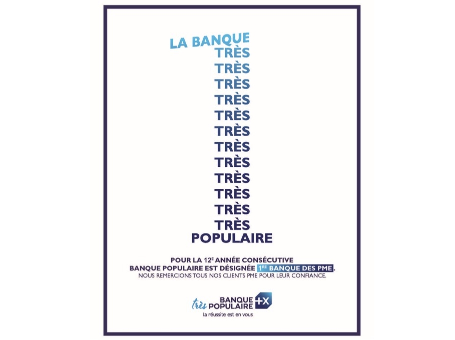 Affiche publicitaire Banque Populaire célébrant sa distinction comme 1re banque des PME pour la 12e année consécutive, avec le slogan « La banque très très populaire ».
