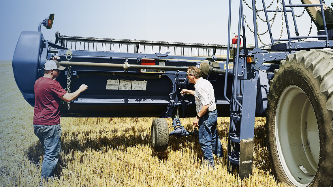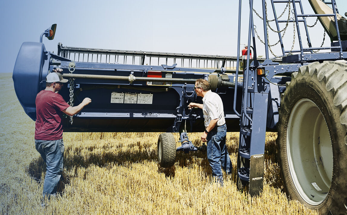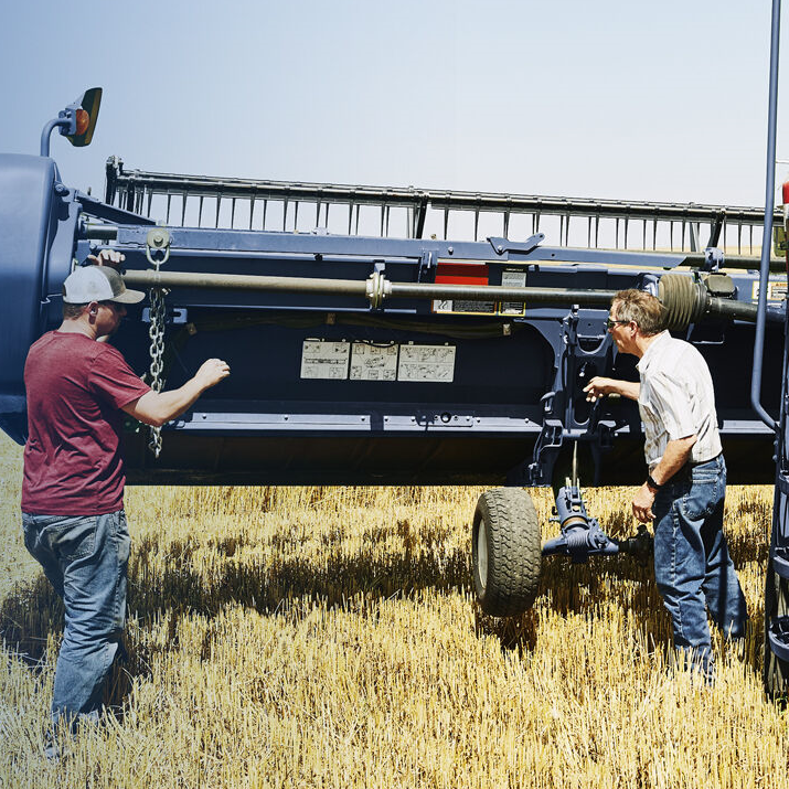 Deux agriculteurs inspectent une moissonneuse-batteuse moderne stationnée dans un champ, illustrant la maintenance et le contrôle technique du matériel agricole après la récolte.