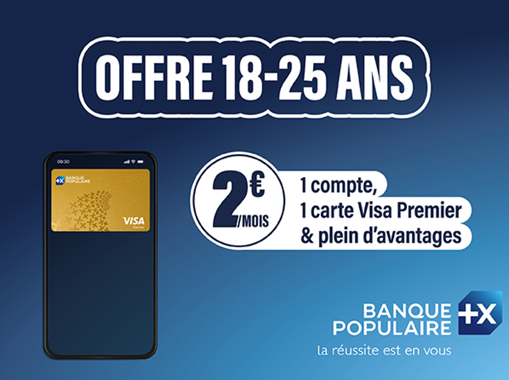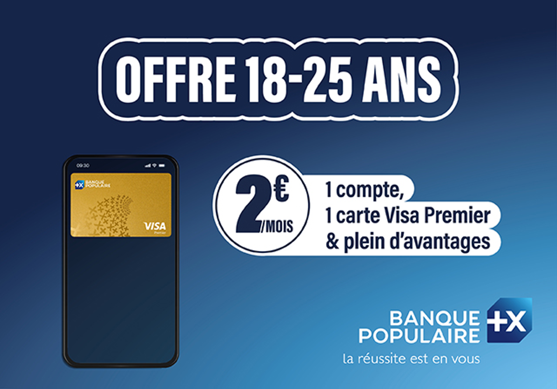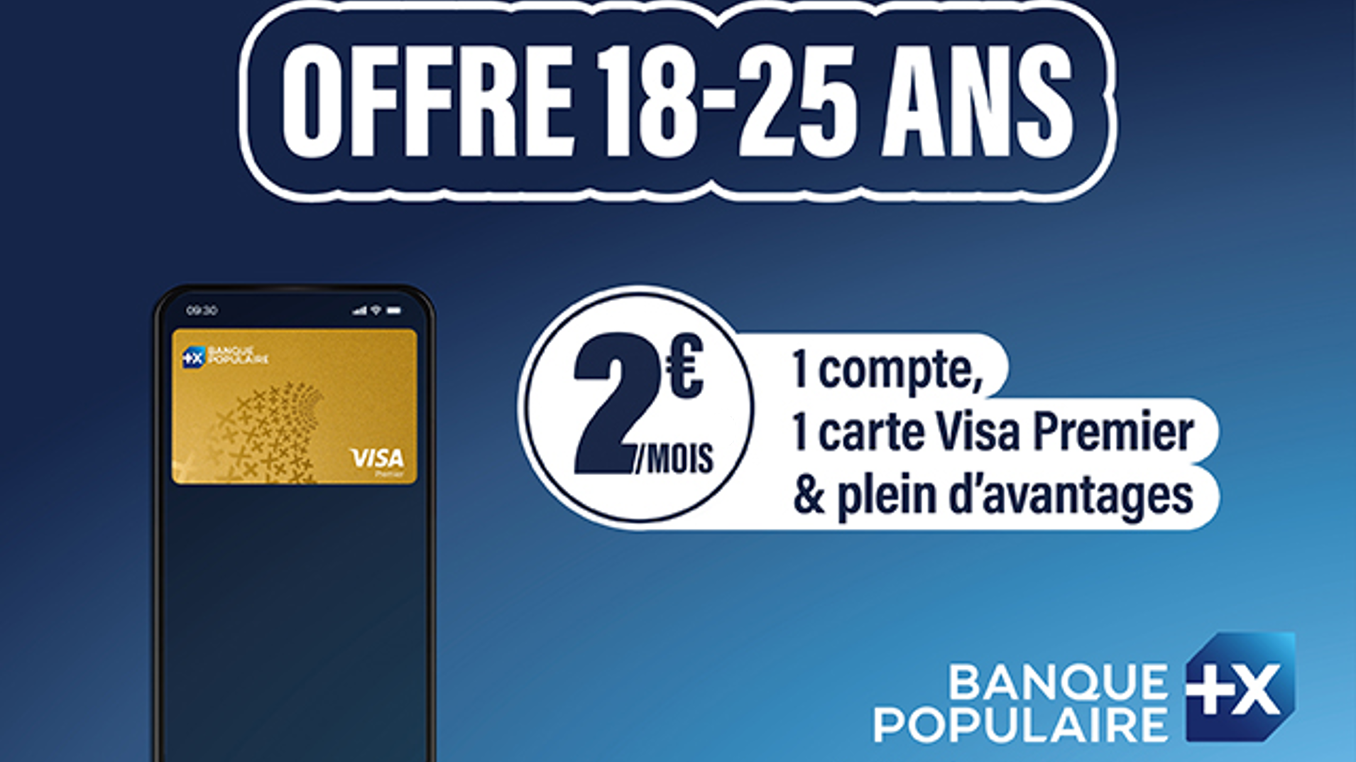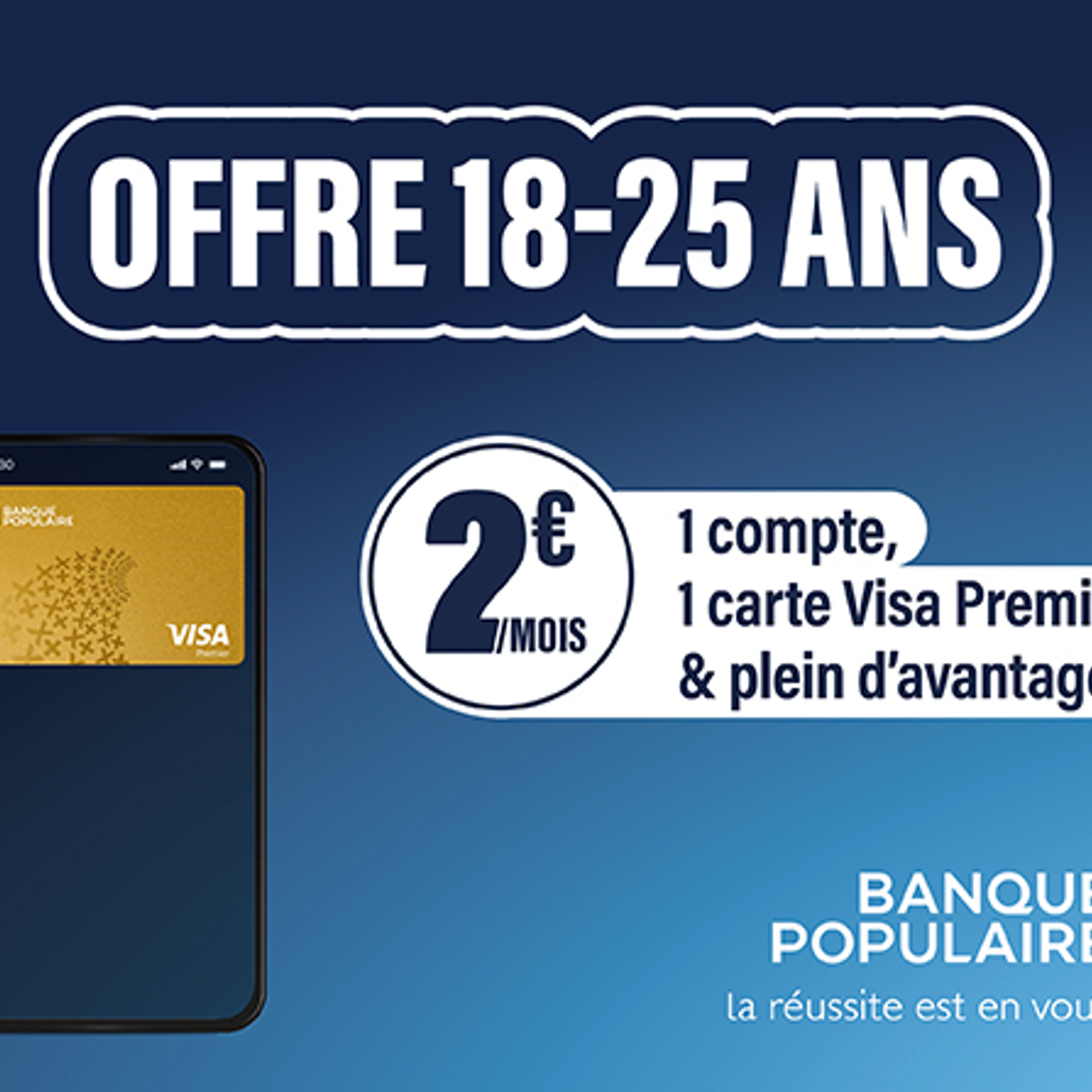 Campagne de publicité Banque Populaire présentant les atouts de la nouvelle offre dédiée aux 18-25 ans : 2 €/mois pour 1 compte, 1 carte Visa Premier et plein d'avantages.