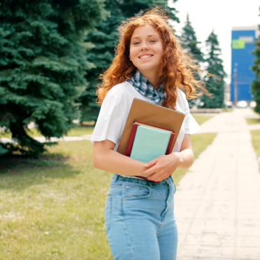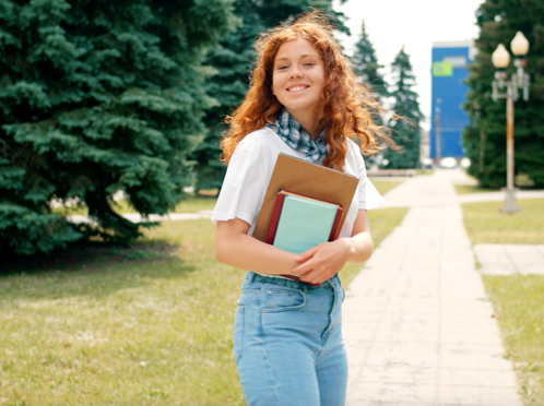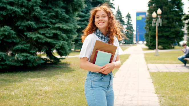 Jeune femme souriante tenant des cahiers et un classeur, marchant dans un parc universitaire verdoyant, illustrant le soutien aux étudiants en France.