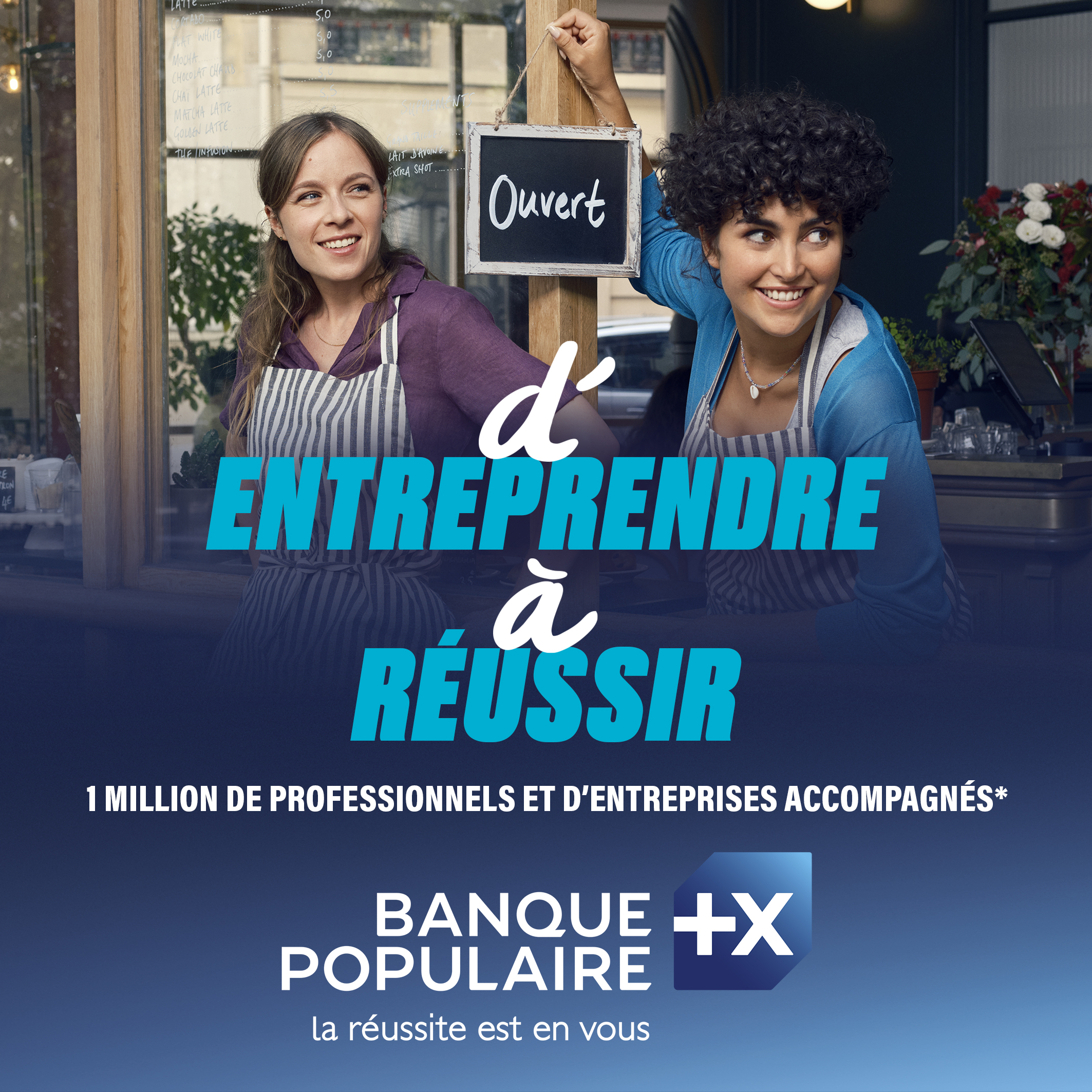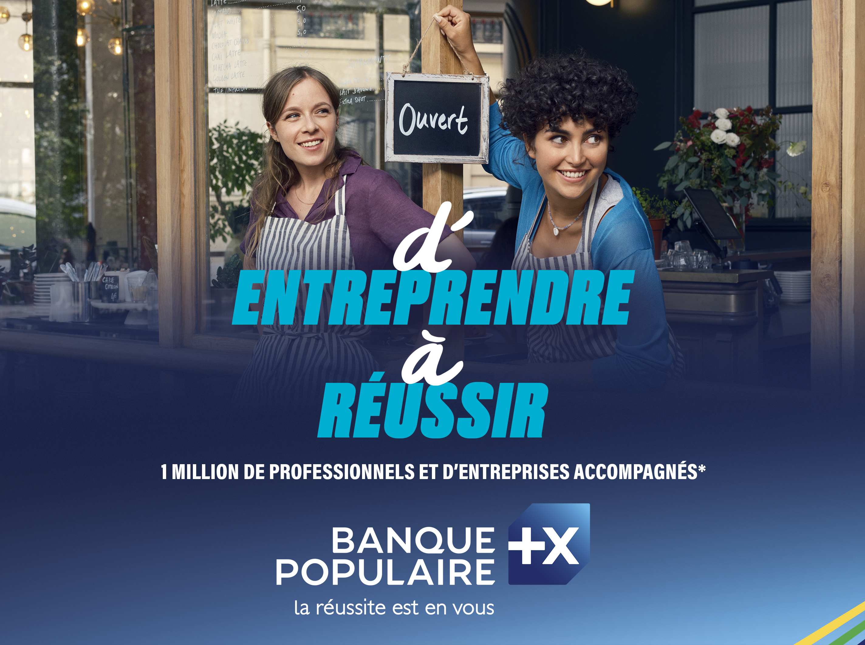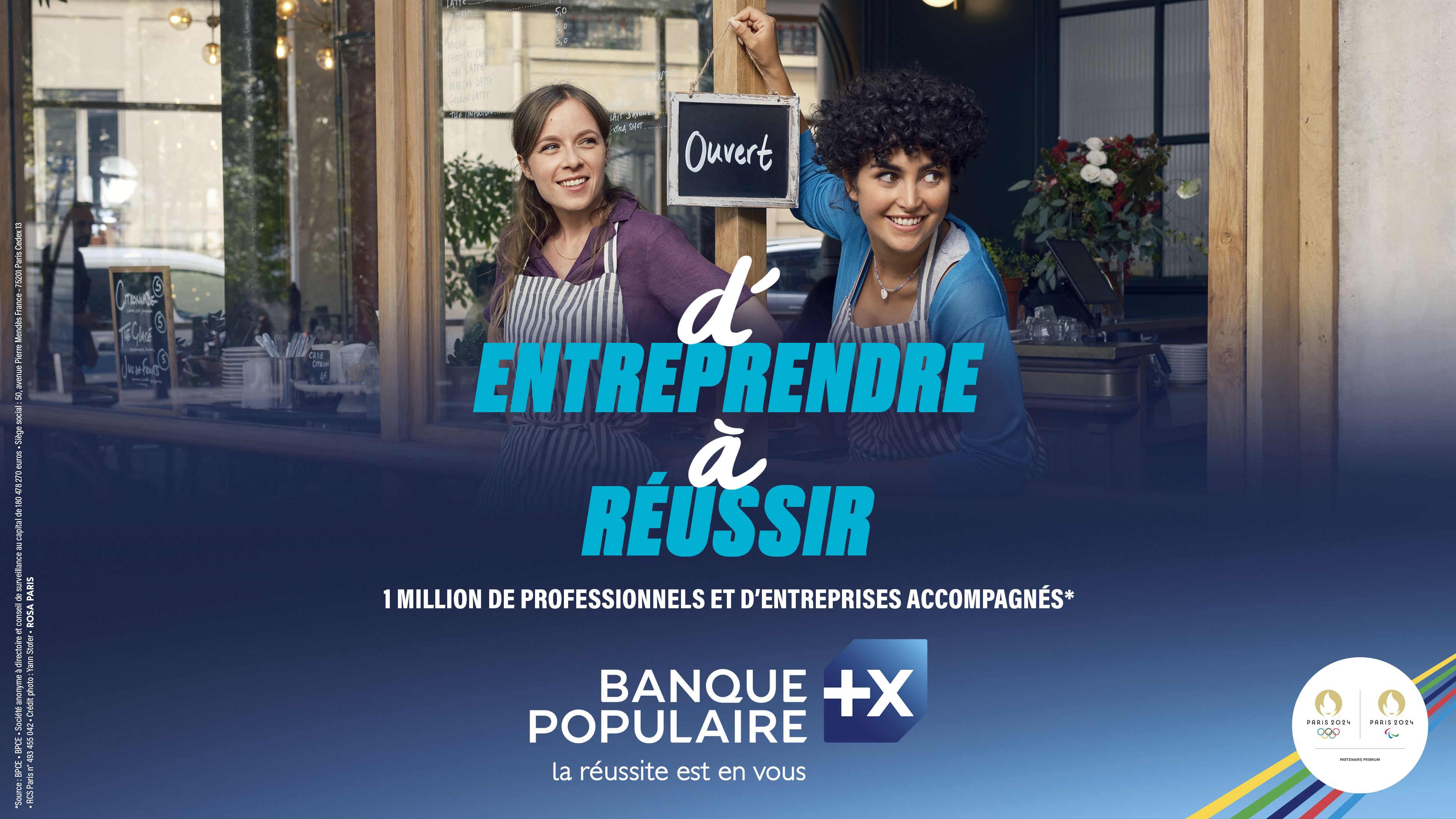 Visuel publicitaire Banque Populaire mettant en avant deux entrepreneures souriantes devant leur établissement avec le message « d'entreprendre à réussir » et la signature « la réussite est en vous ». Mention du partenariat avec Paris 2024.