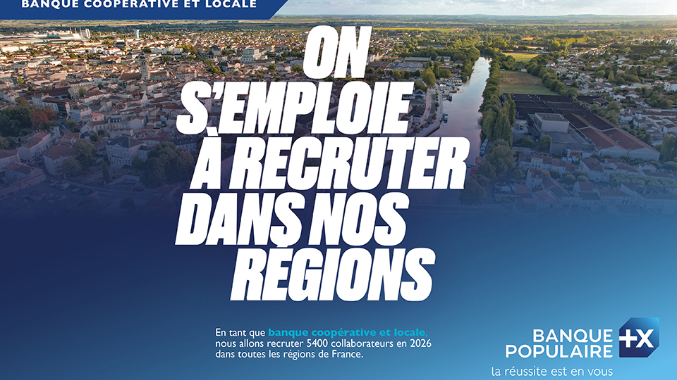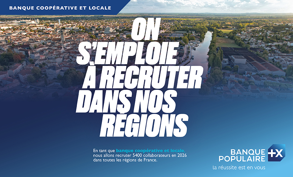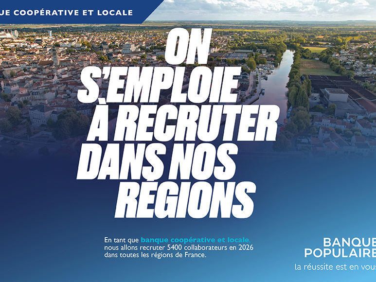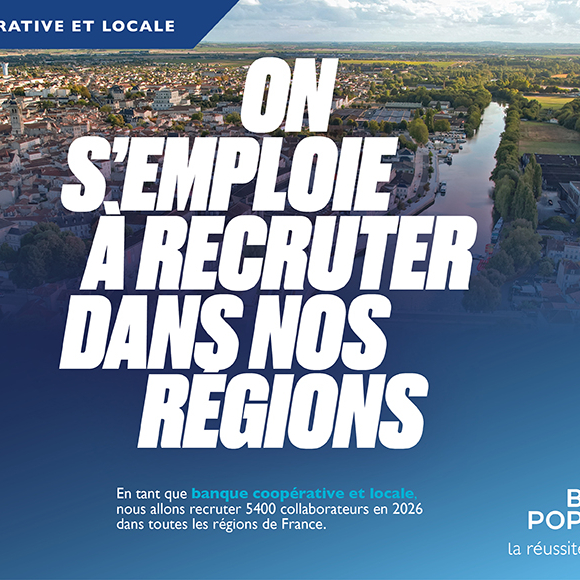 Affiche de recrutement Banque Populaire indiquant 5400 collaborateurs à recruter en 2026 dans toutes les régions de France, avec paysage urbain et slogan sur l'emploi.
