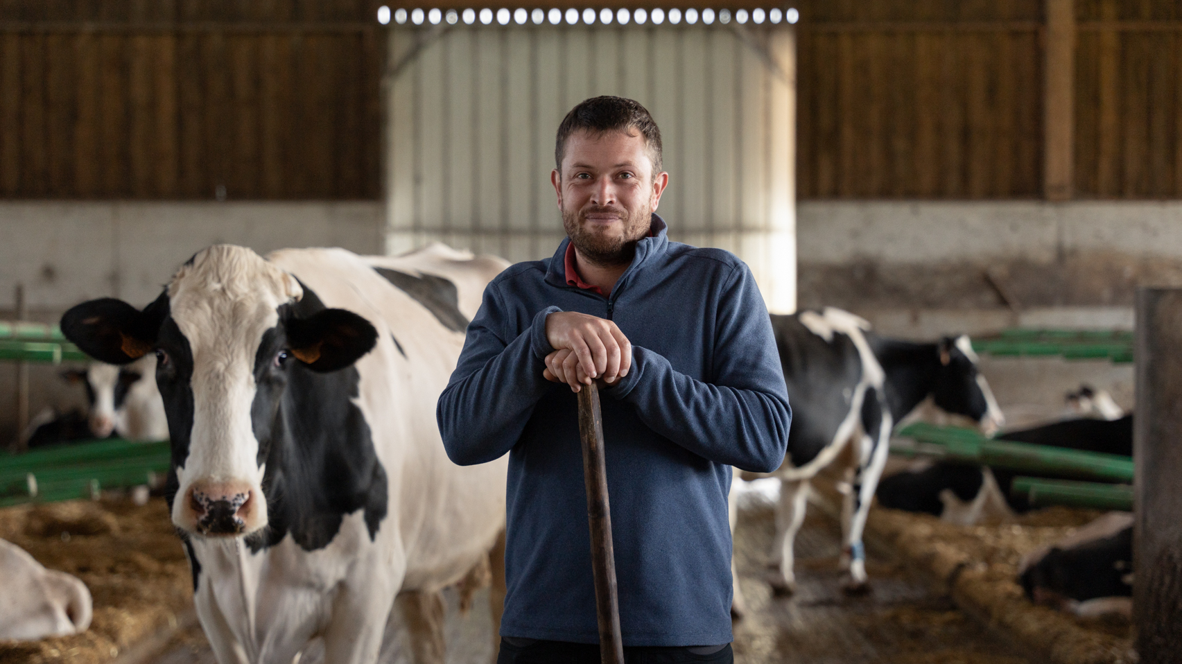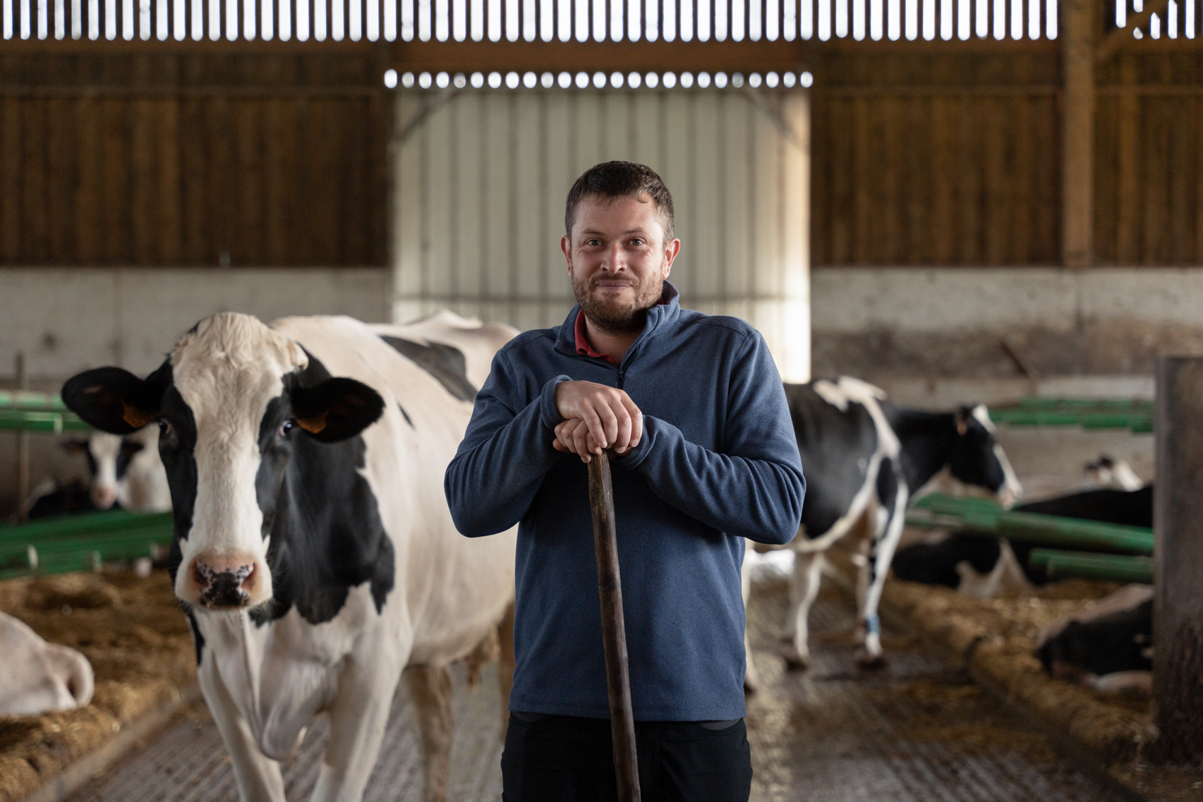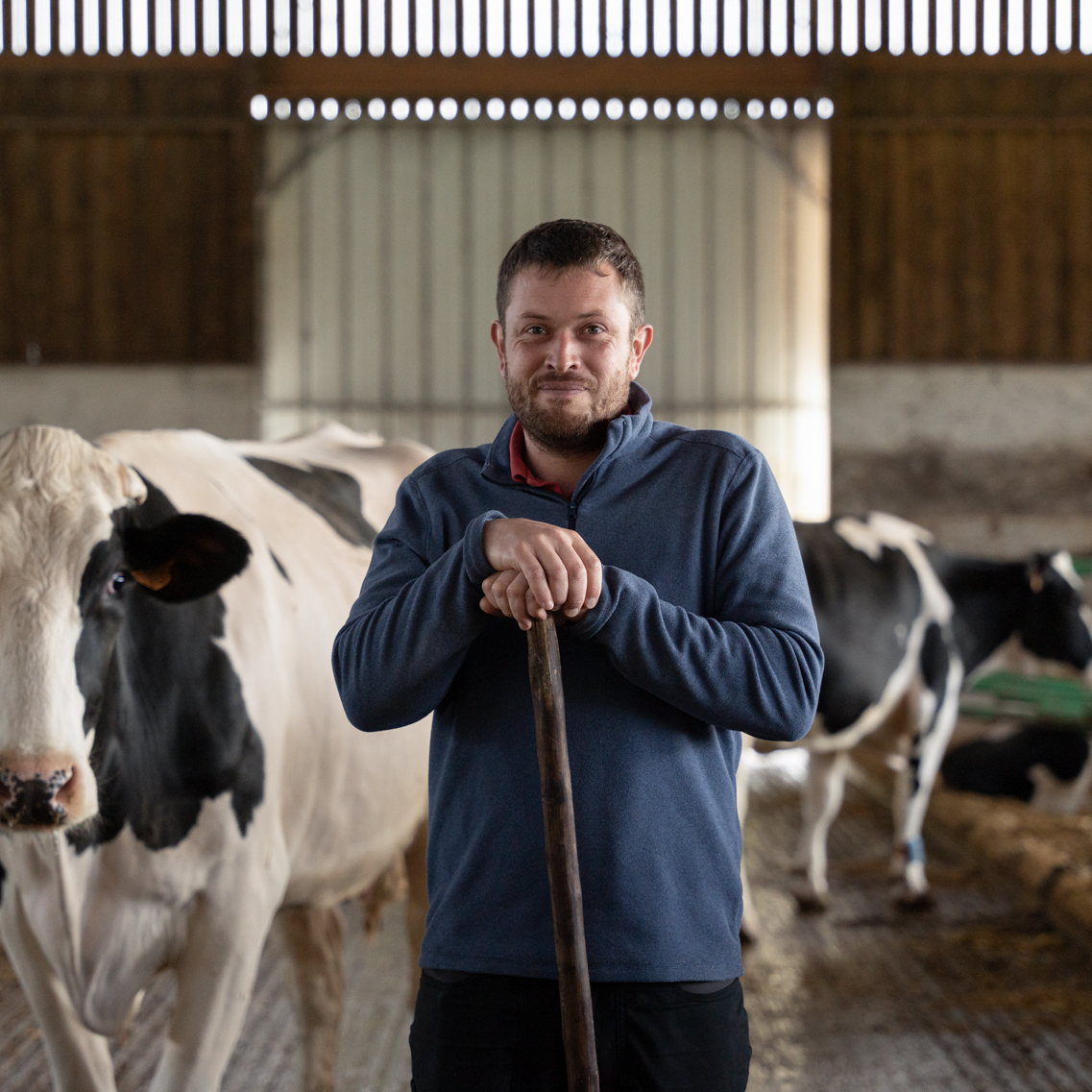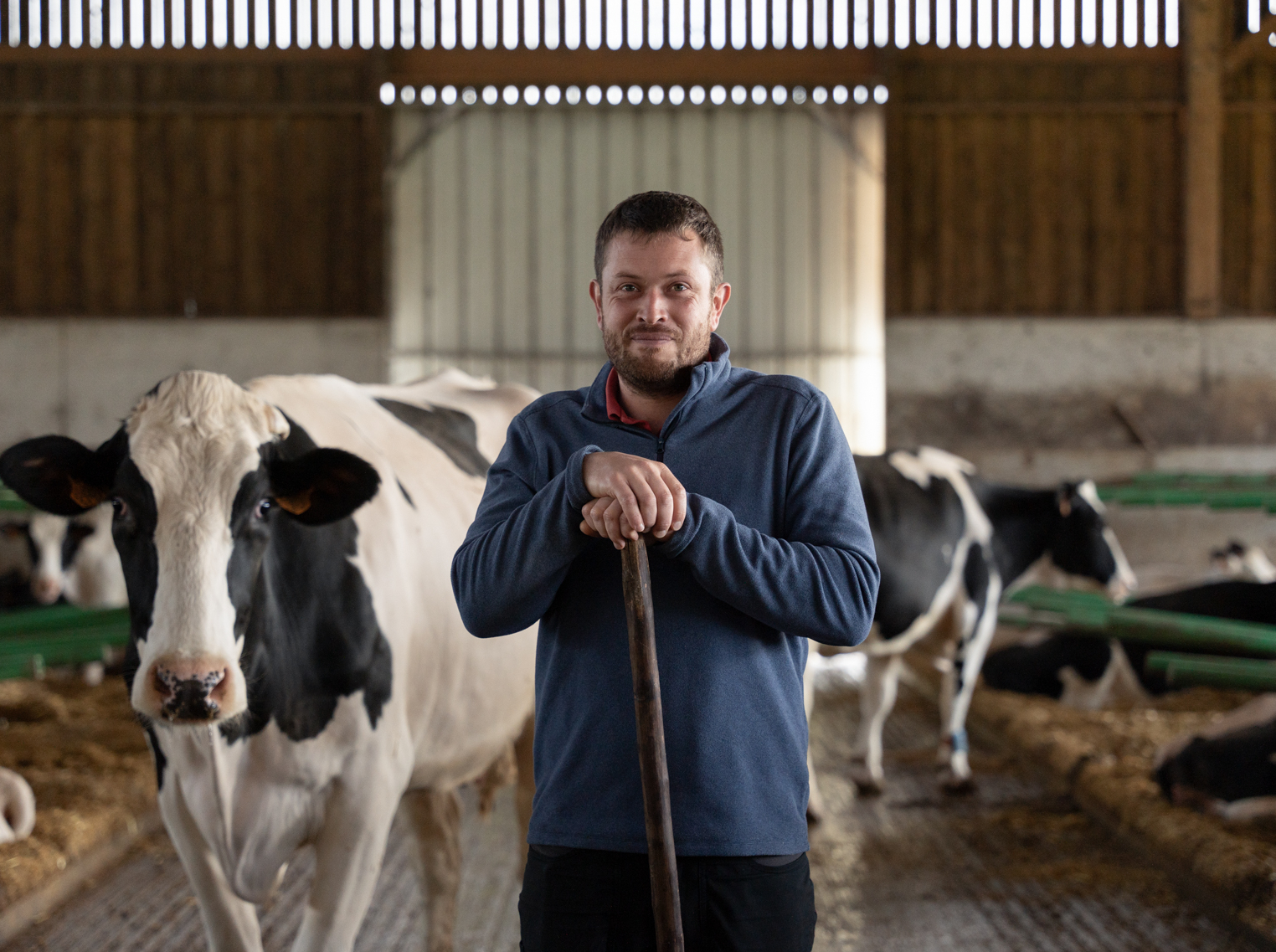 Portrait d'un agriculteur dans une stabulation avec un troupeau de vaches laitières, illustrant l'élevage bovin en environnement agricole.