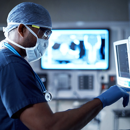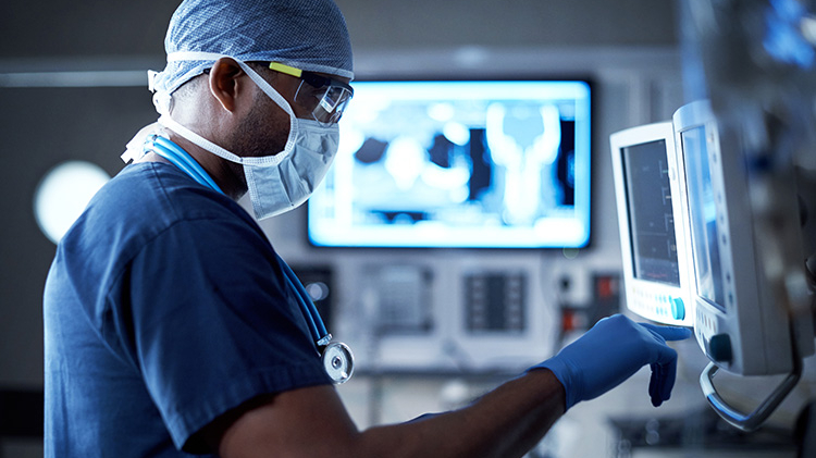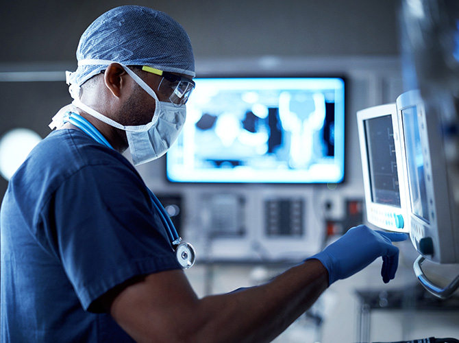 Médecin en bloc opératoire utilisant un moniteur médical avancé pour surveiller en temps réel l’état d’un patient, équipement de santé de haute technologie à l’arrière-plan.