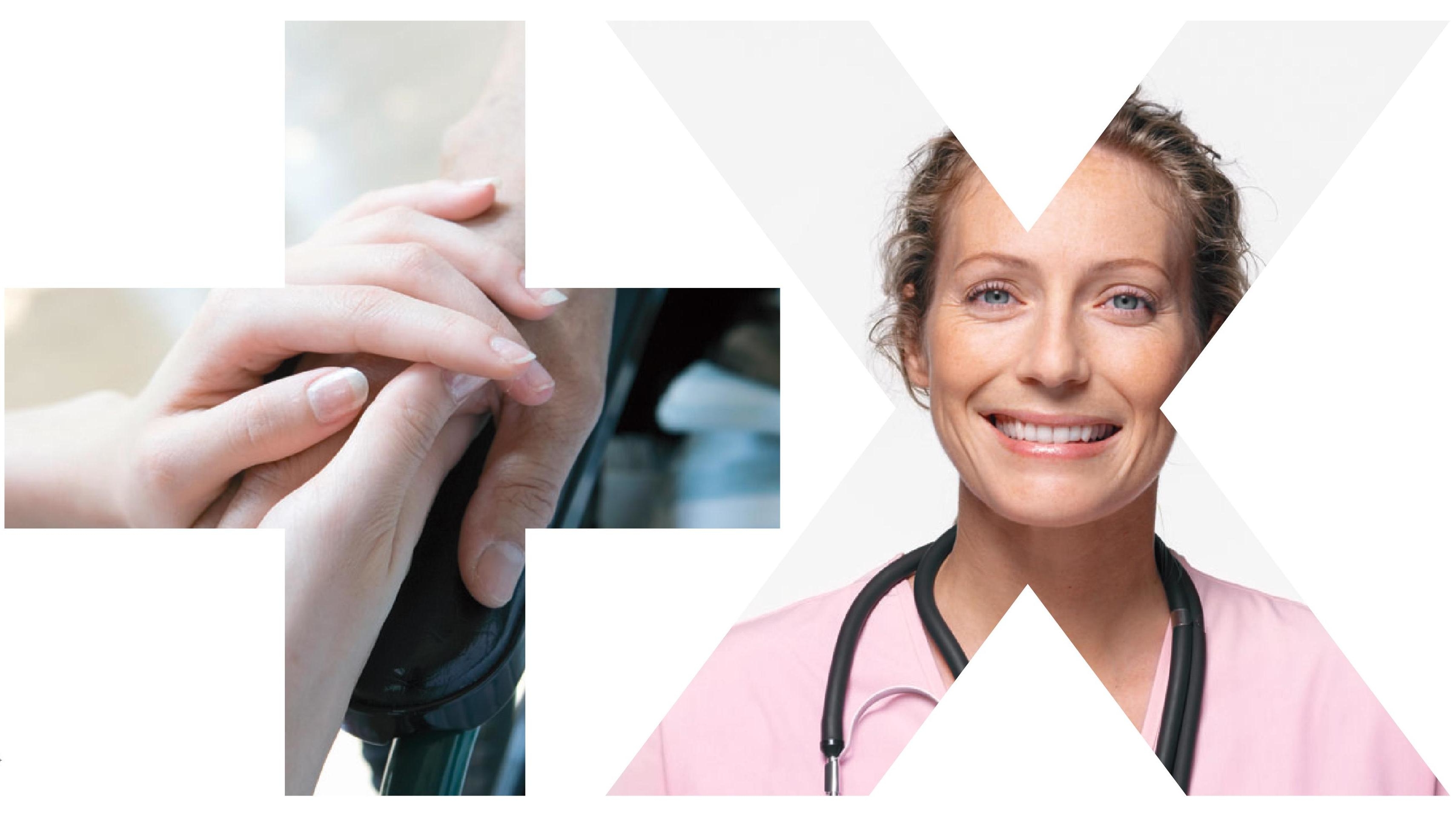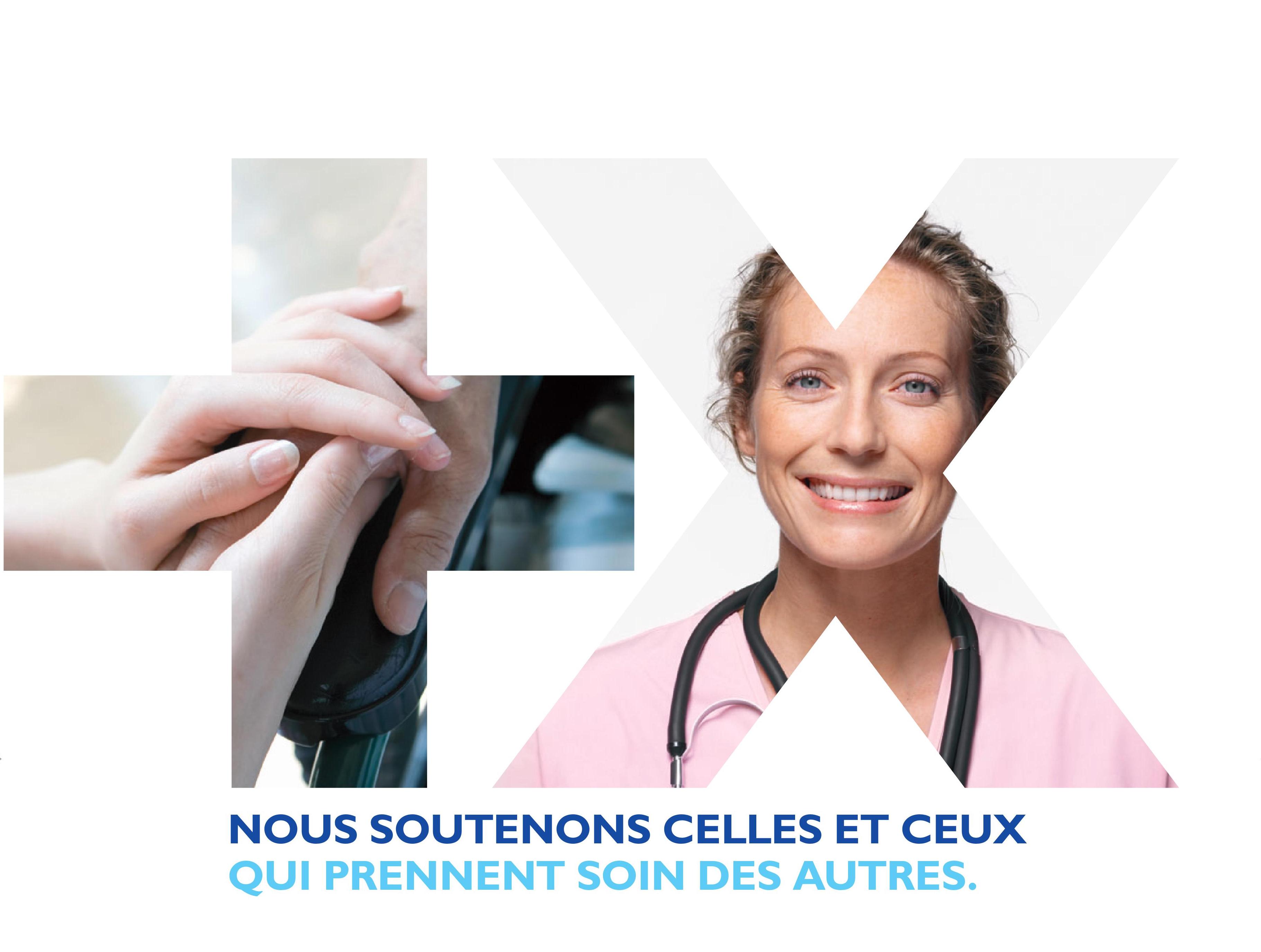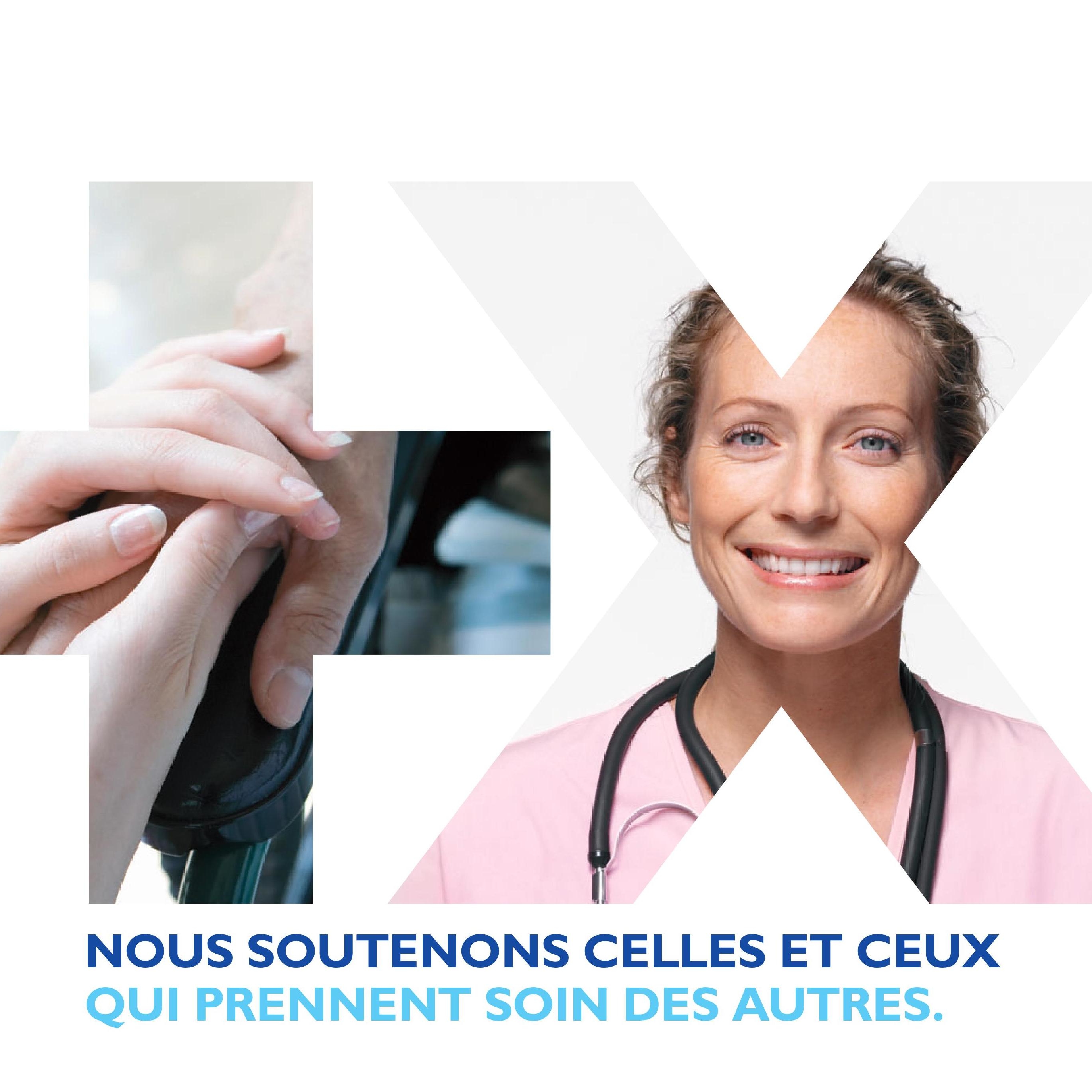 Visuel de la campagne Banque Populaire valorisant le métier d'infirmier avec un portrait d'infirmière souriante et une main réconfortant un patient, accompagné du slogan : Nous soutenons celles et ceux qui prennent soin des autres.