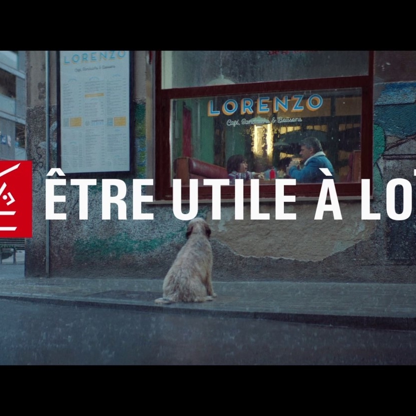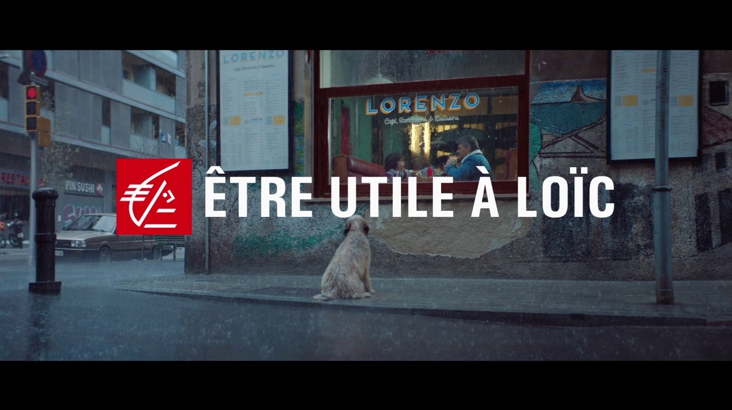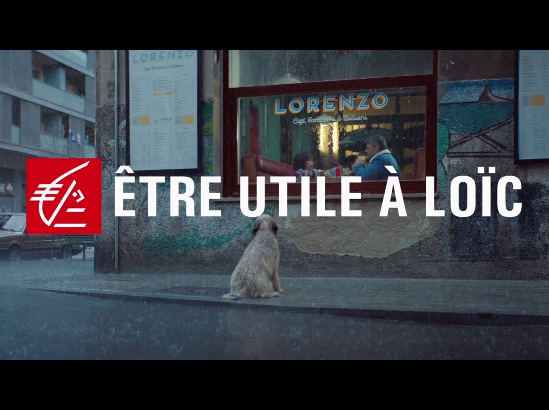 Image extraite de la campagne publicitaire de la Caisse d’Epargne « Être utile à Loïc », montrant un chien devant la vitrine d’un café sous la pluie.