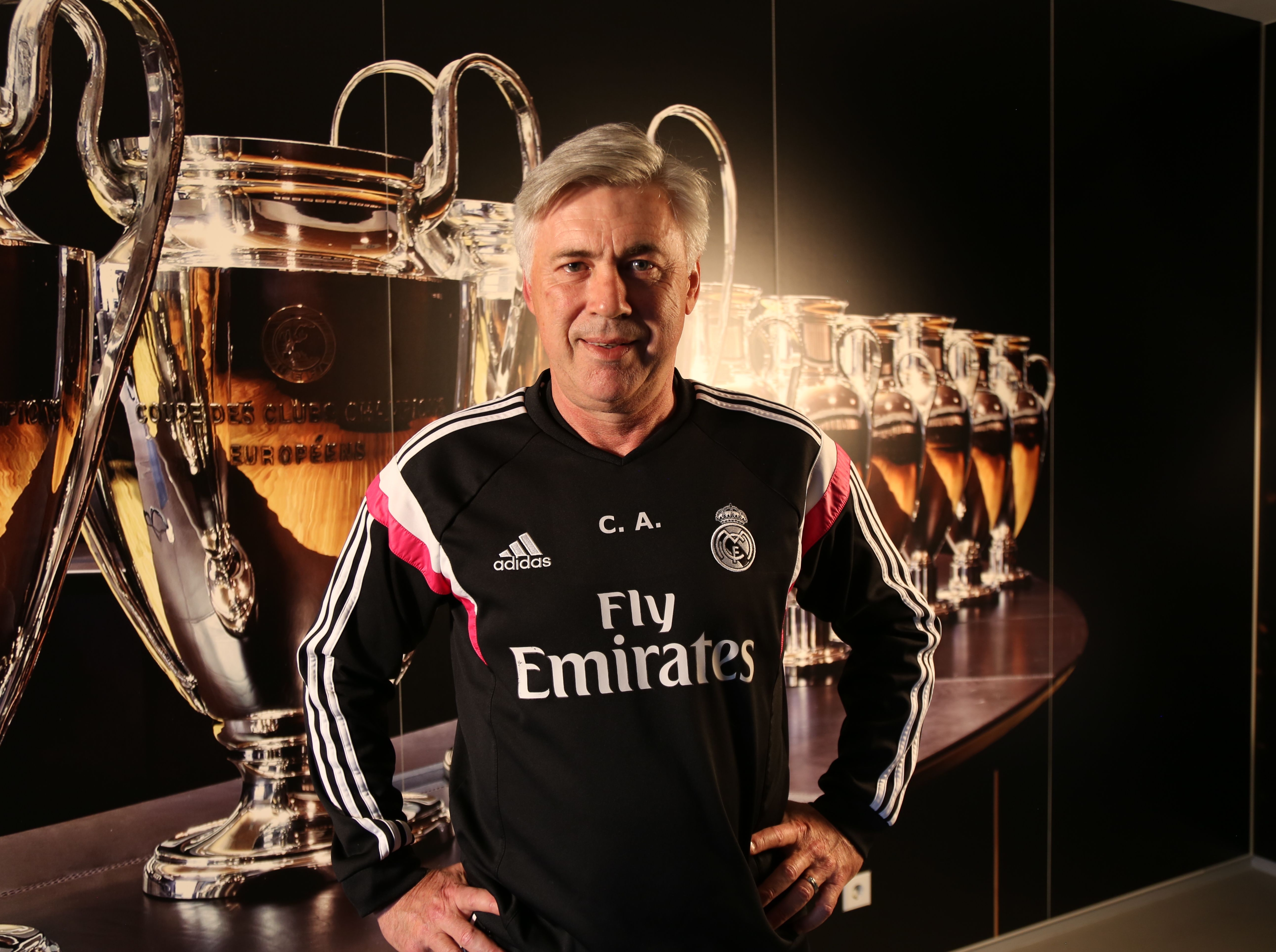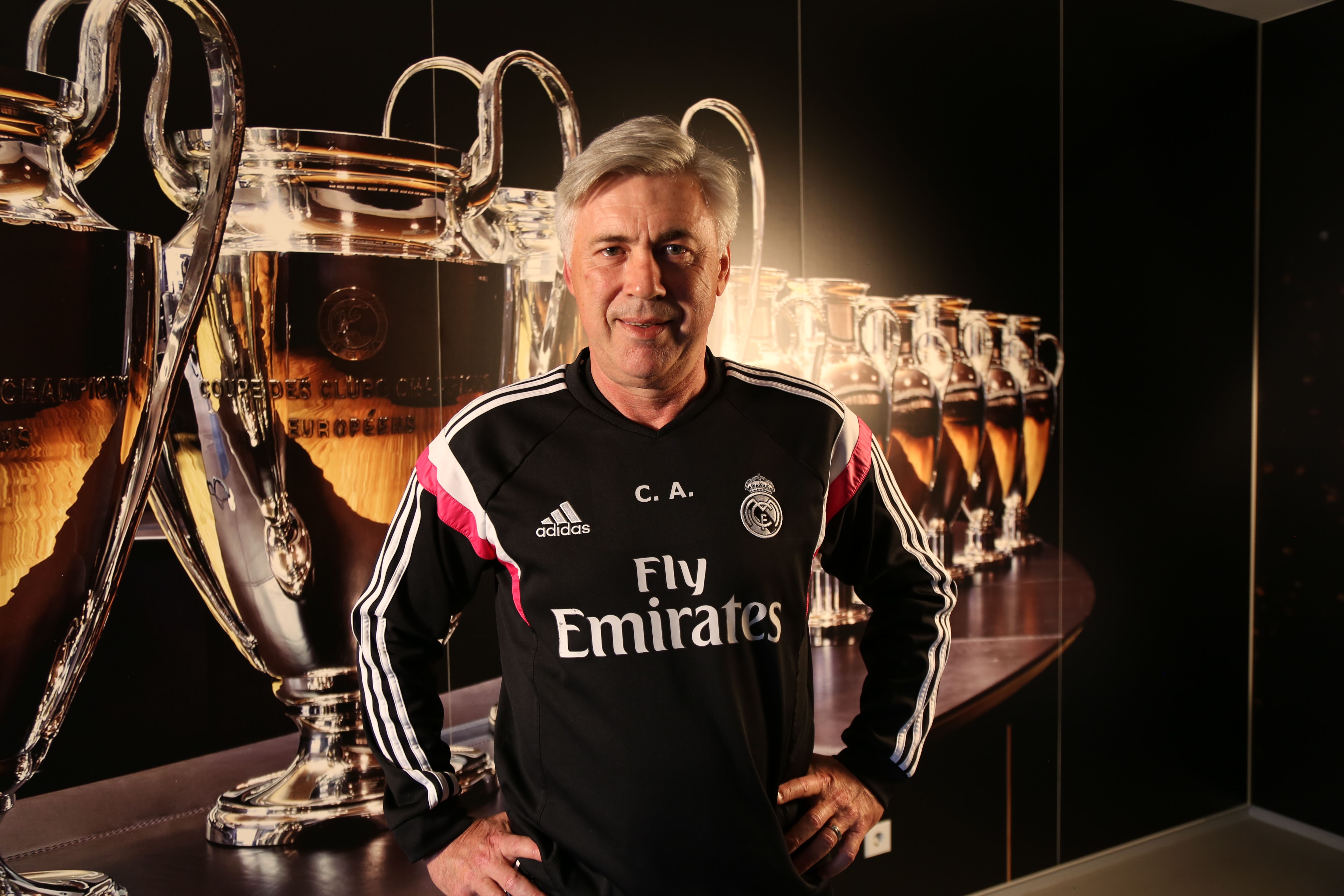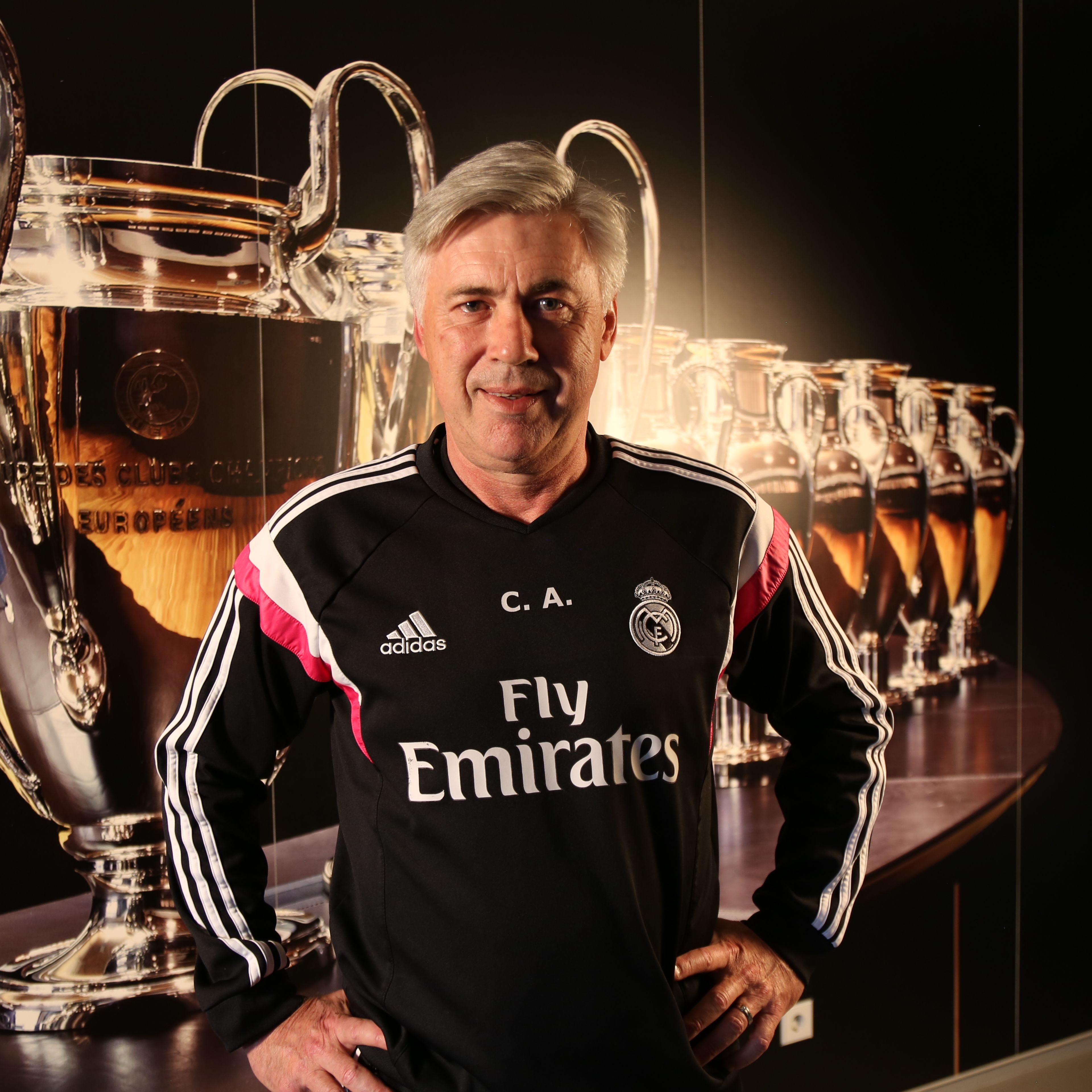 Portrait de Carlo Ancelotti, entraîneur du Real Madrid, devant une rangée de trophées de la Ligue des champions.