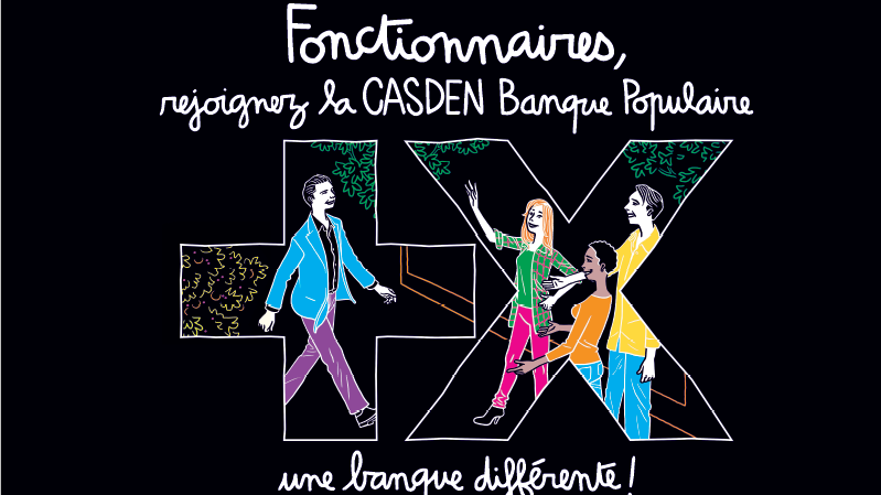 Affiche de campagne CASDEN invitant les fonctionnaires à rejoindre la banque coopérative CASDEN Banque Populaire, partenaire des Banques Populaires.