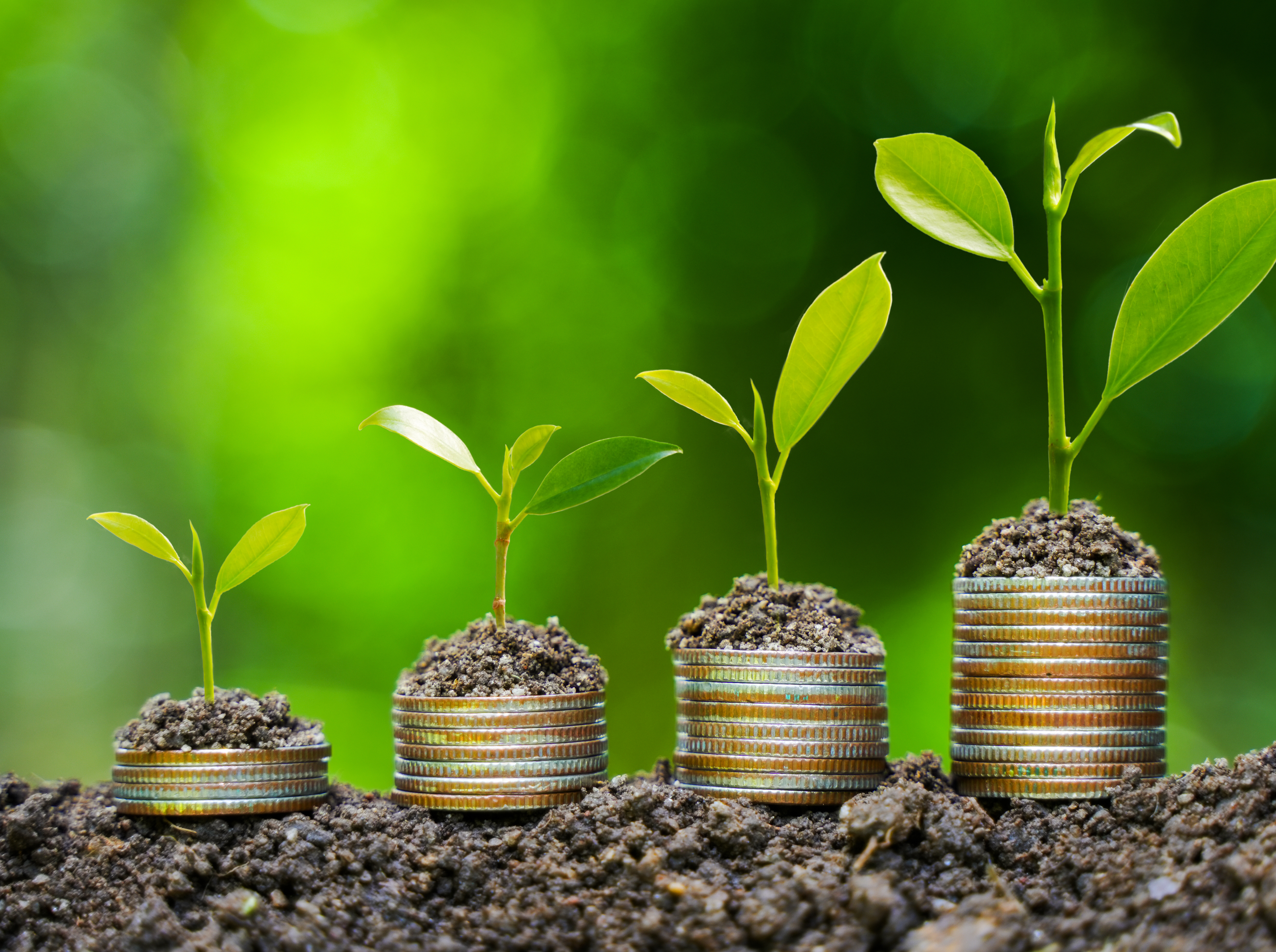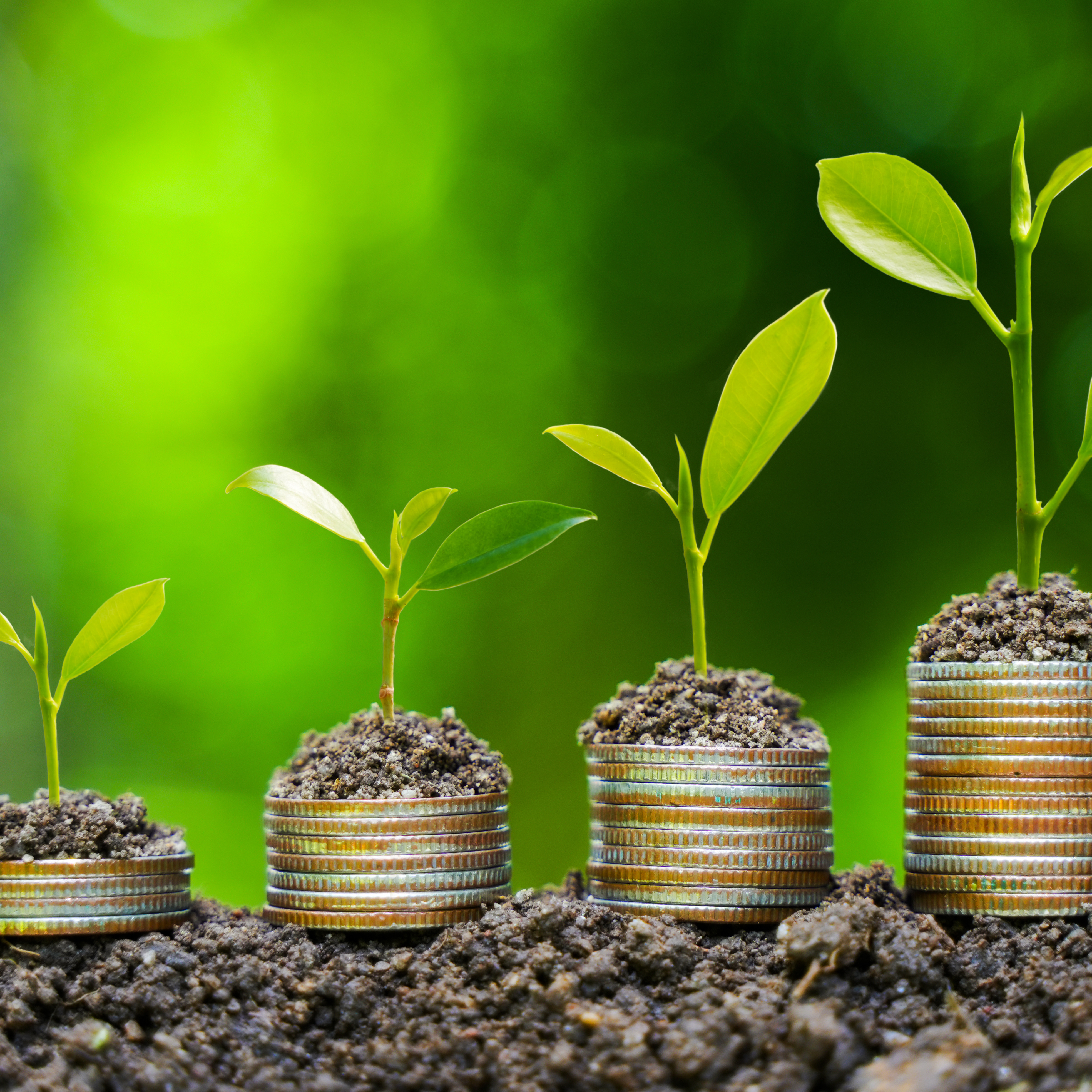 Des piles de pièces de monnaie de taille croissante surmontées de jeunes pousses illustrent la croissance de l’investissement financier et le développement durable sur un fond naturel verdoyant.