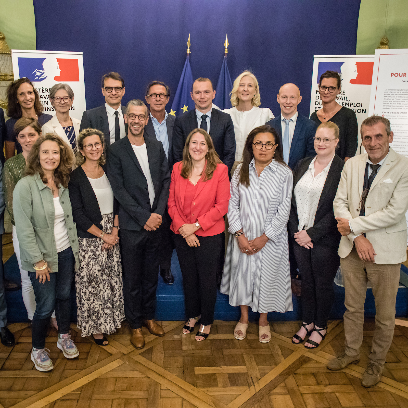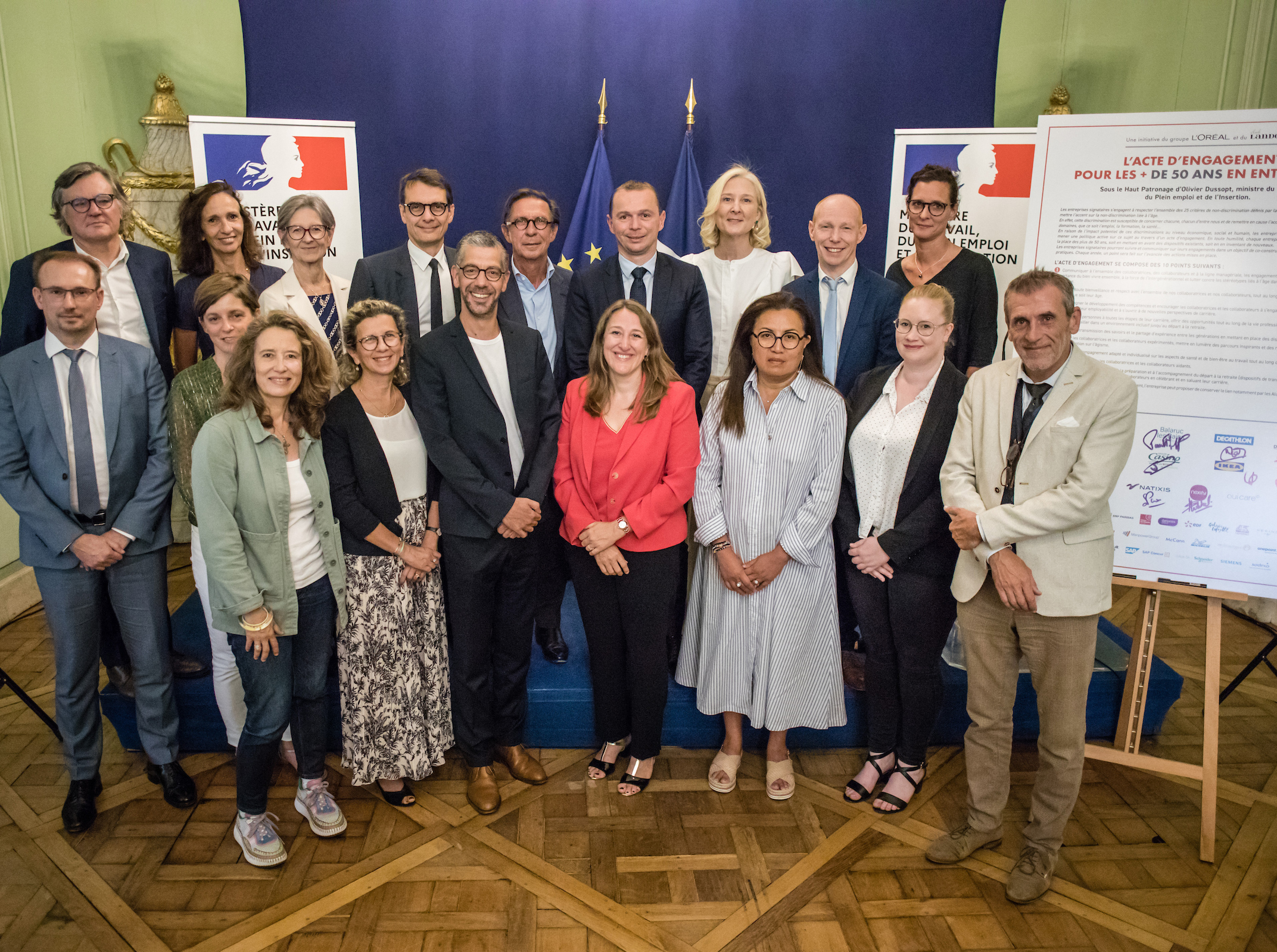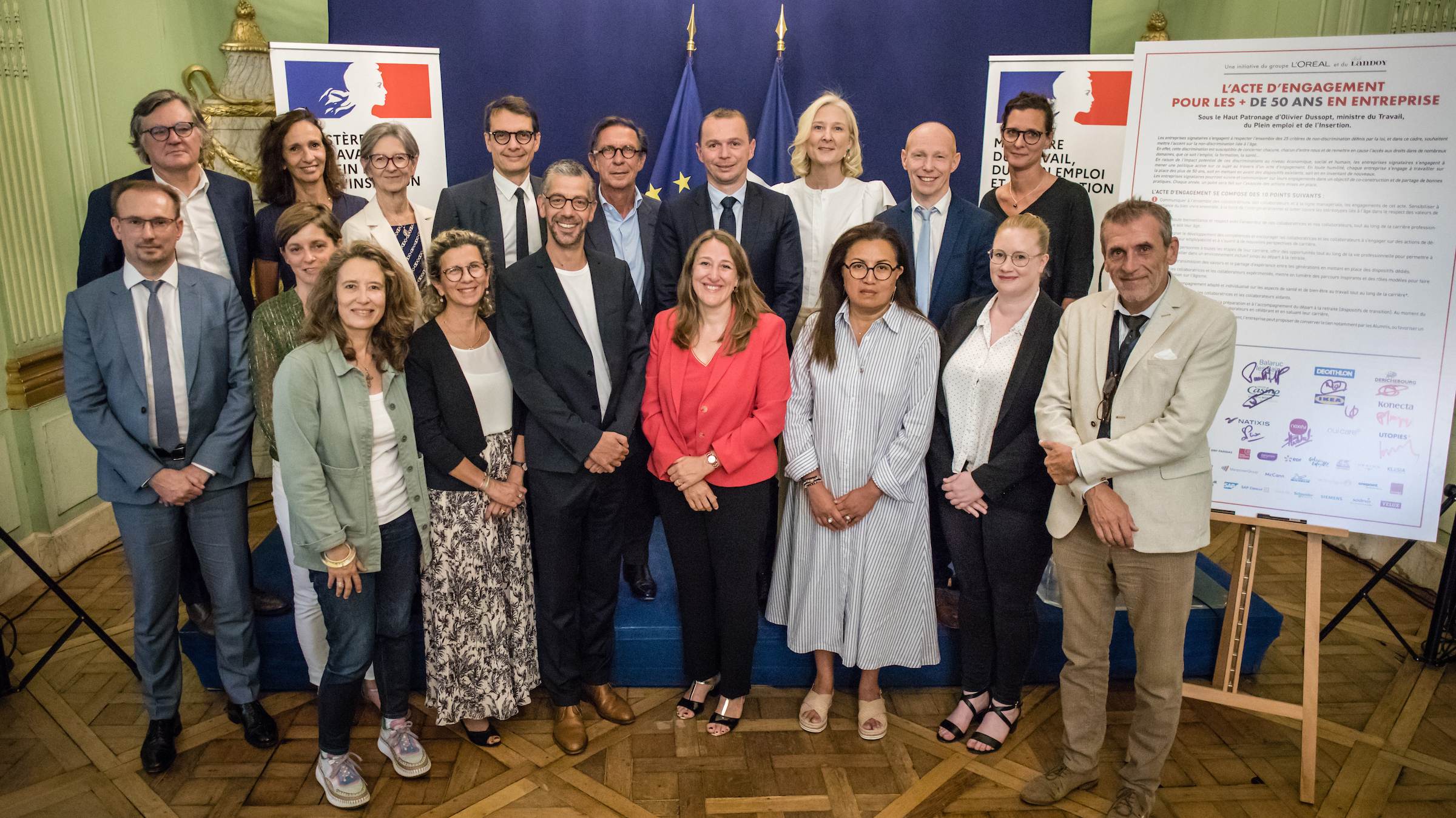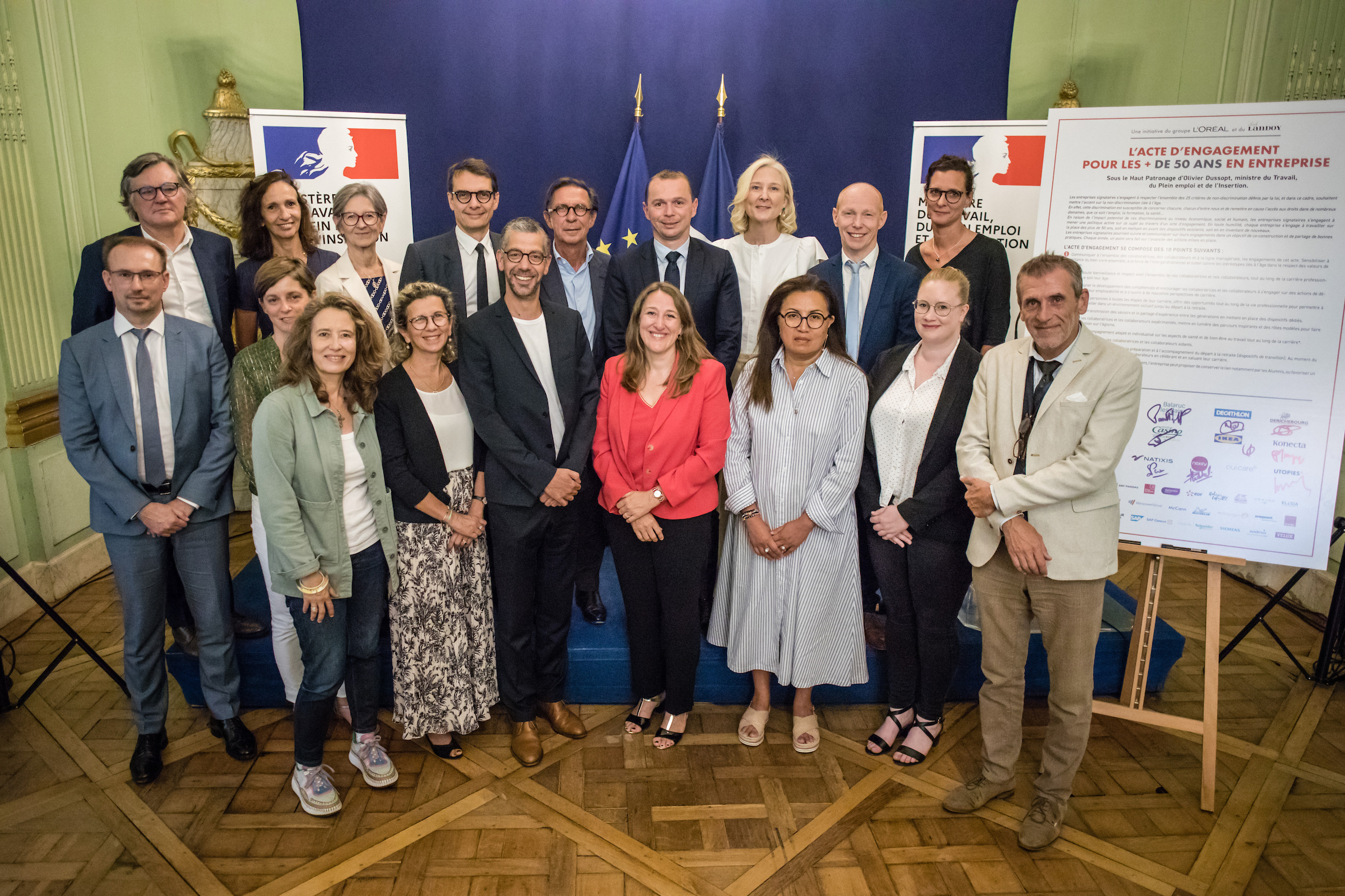 Photographie de groupe lors de la signature par Natixis de la charte en faveur de l’emploi des plus de 50 ans, avec des représentants des entreprises et des partenaires devant les panneaux officiels.