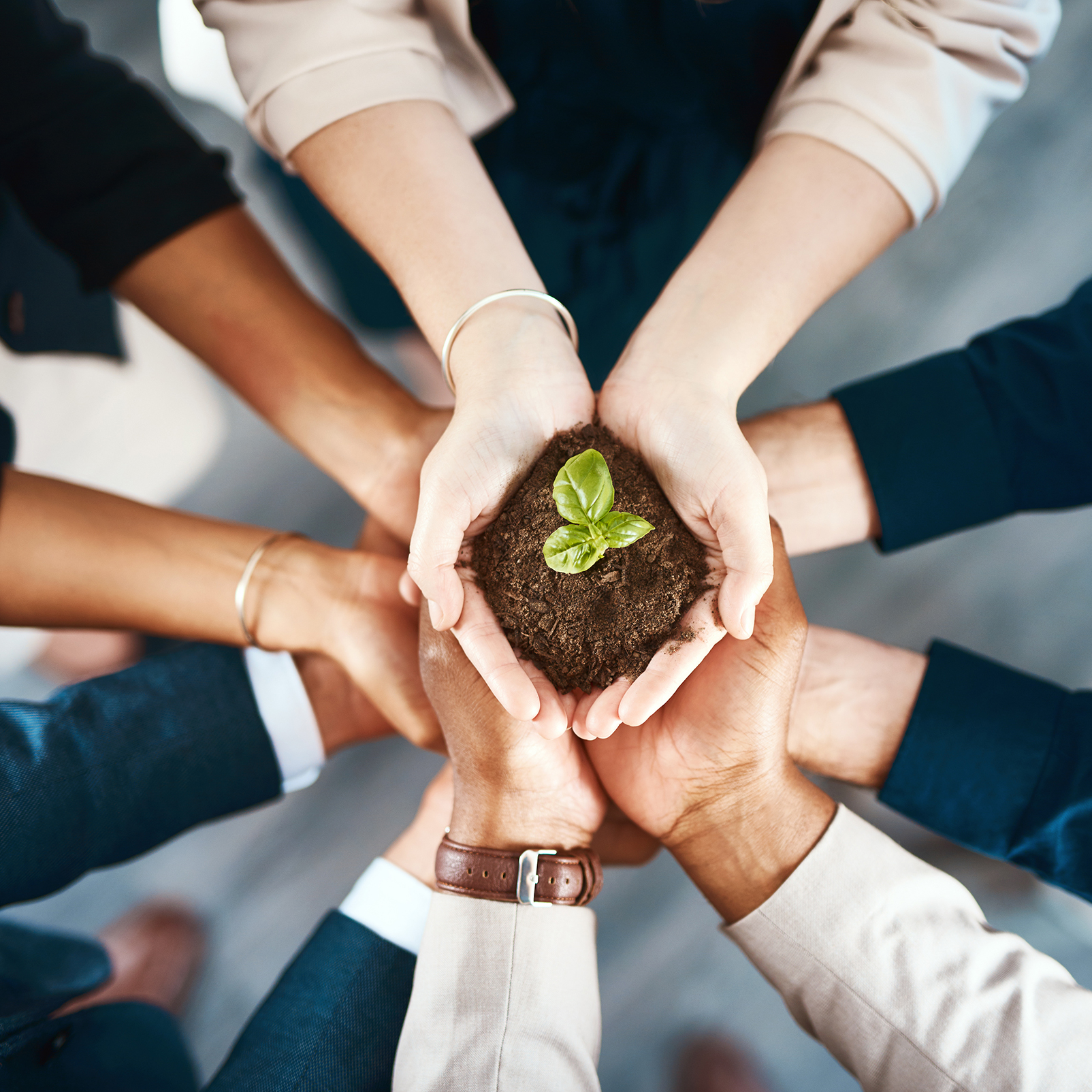 Des mains de plusieurs personnes unies autour d'une jeune pousse dans la terre, symbolisant la collaboration et l'engagement collectif pour le développement durable.