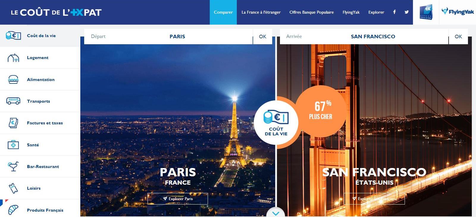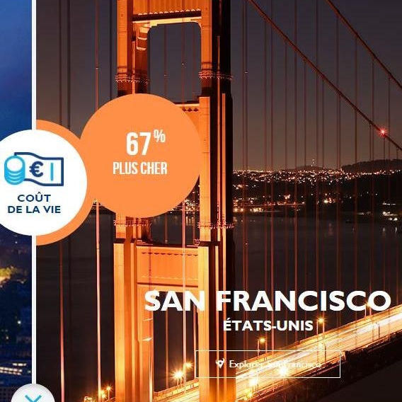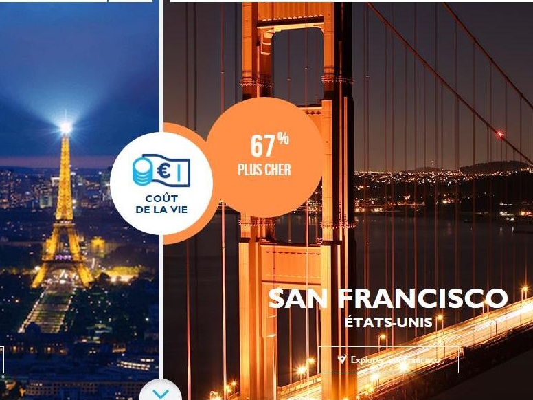 Comparatif du coût de la vie entre Paris et San Francisco, montrant que San Francisco est 67 % plus cher que Paris.