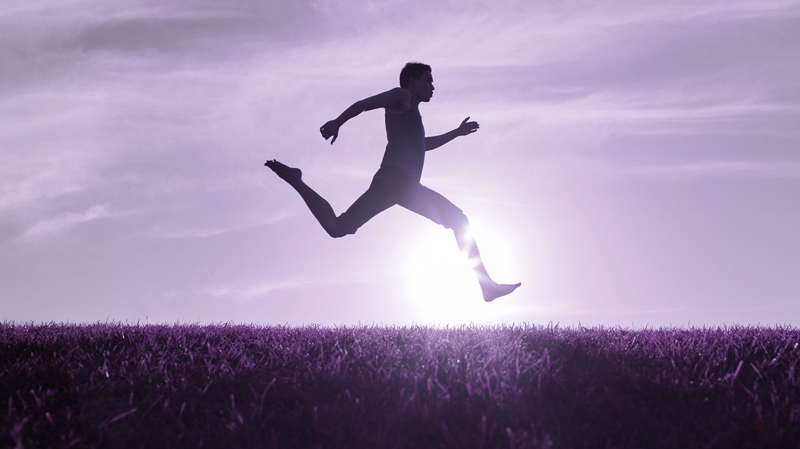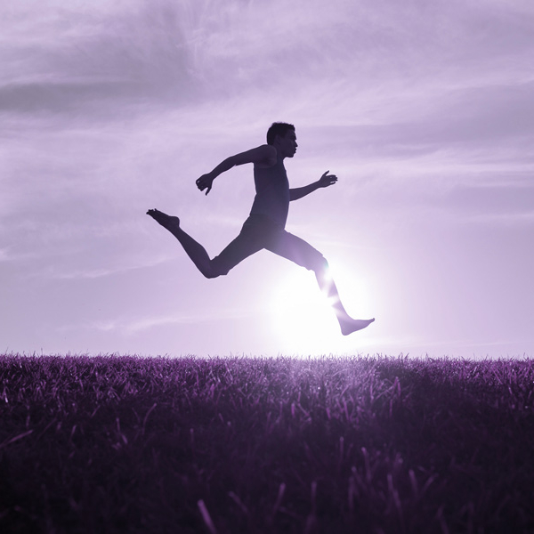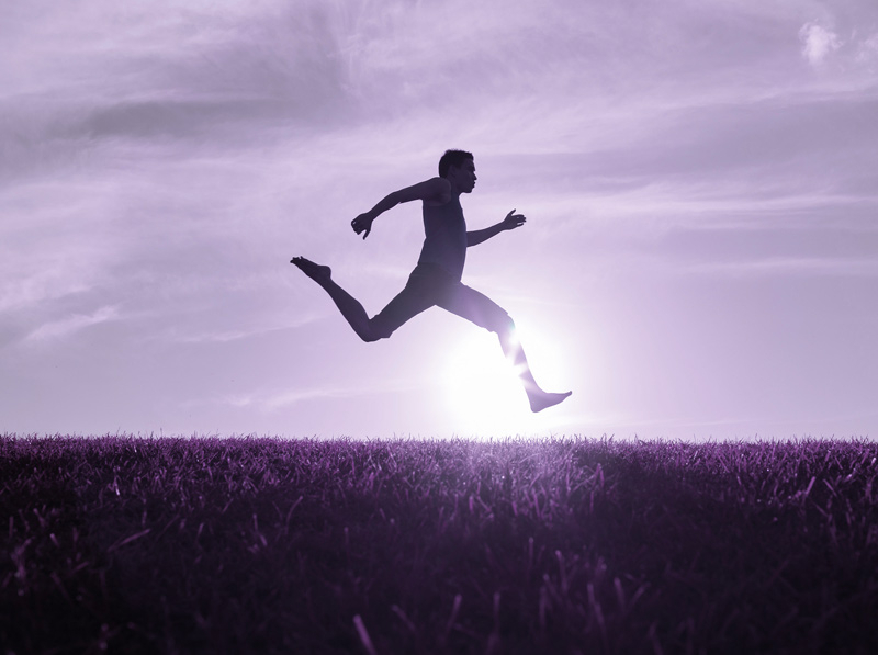 Silhouette d'une personne sautant en plein air au-dessus d'un champ, avec le soleil couchant en arrière-plan, illustrant l'énergie, la condition physique et le bien-être dans le cadre d'une thématique sport-santé.