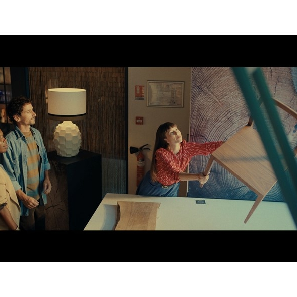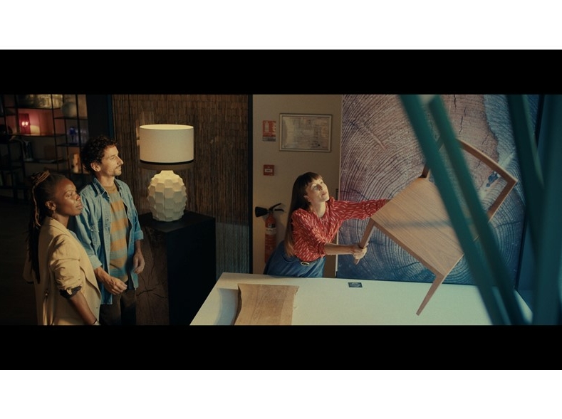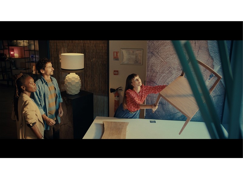Trois personnes en réunion dans un espace professionnel, une femme manipulant une chaise autour d'une table, illustrant la collaboration et l’esprit collectif.