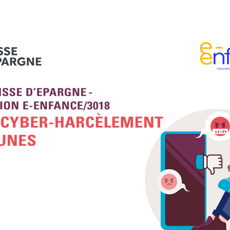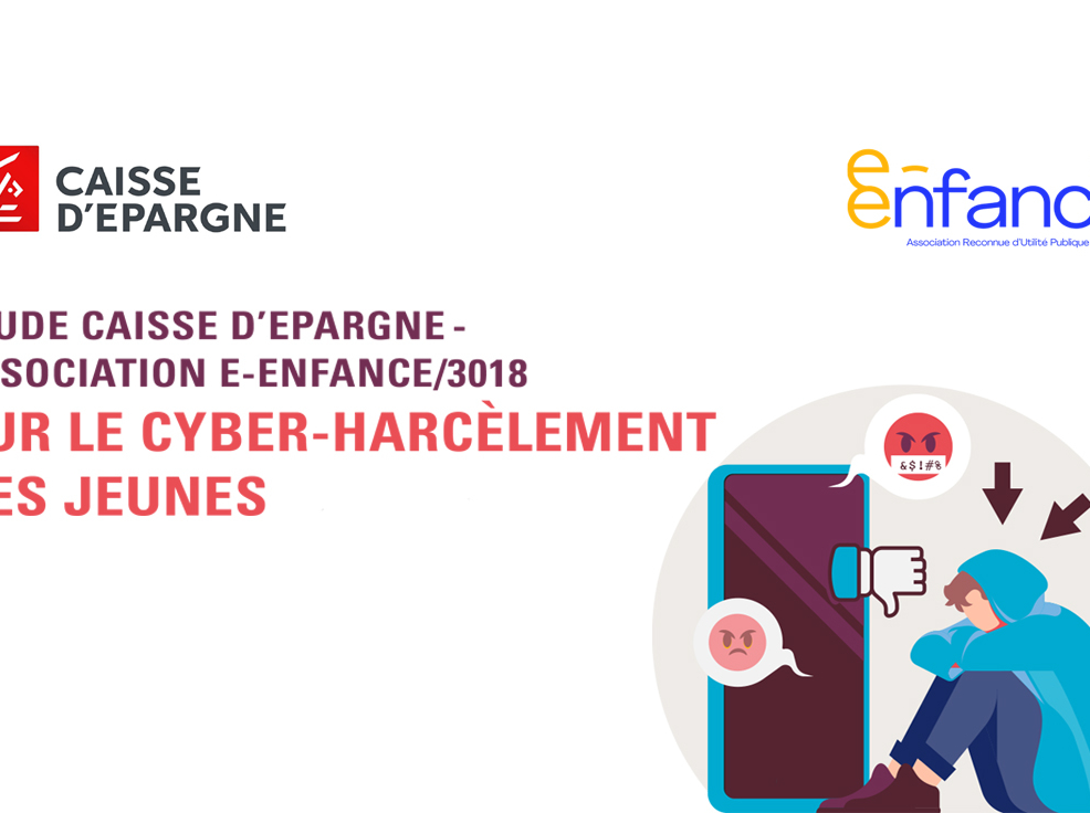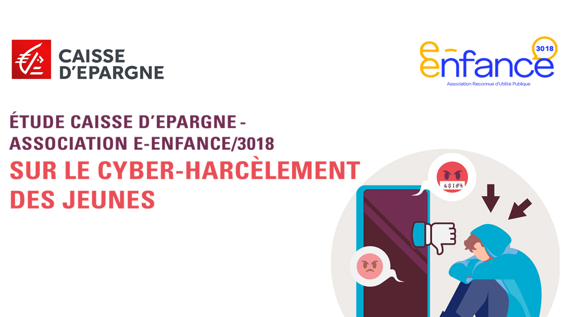 Visuel de l'étude Caisse d’Epargne et Association e-Enfance sur le cyber-harcèlement des jeunes, avec illustration d'un adolescent victime et logos des partenaires.