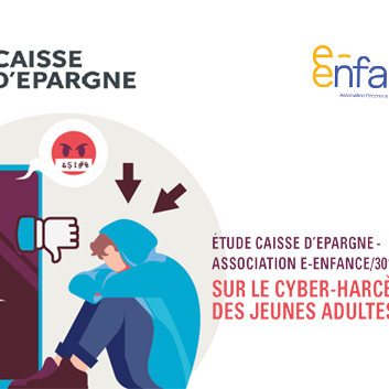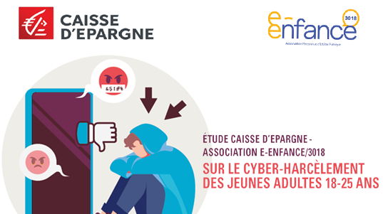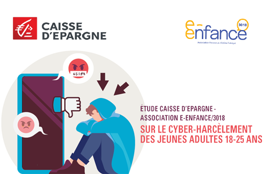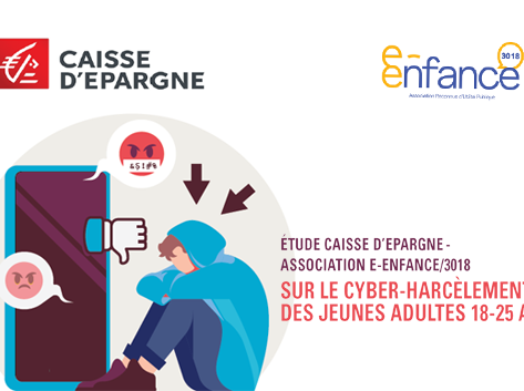 Visuel de l'étude Caisse d'Epargne et Association e-Enfance sur le cyber-harcèlement ciblant les jeunes adultes de 18 à 25 ans, illustrant l'impact du harcèlement en ligne.