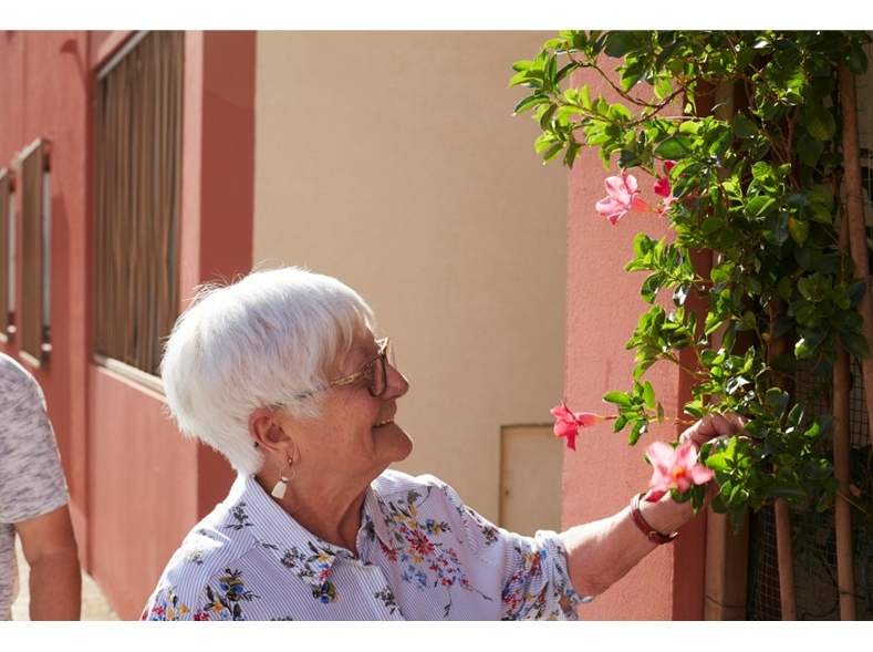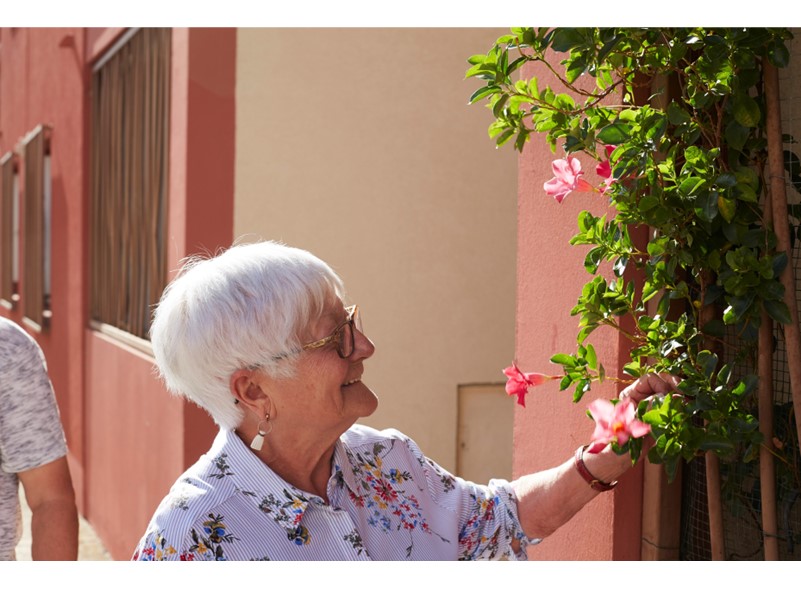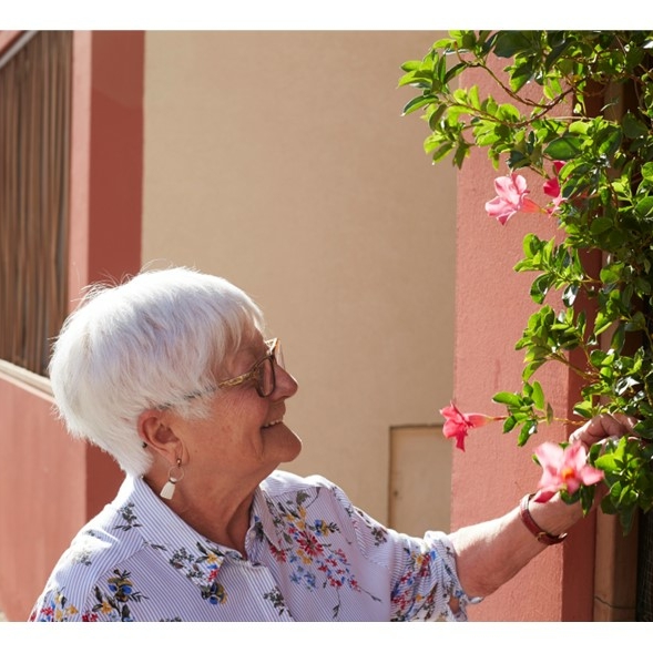 Une personne âgée observe et touche des fleurs dans un jardin fleuri, illustrant le cadre de vie agréable offert par le programme seniors d’Habitat en Région.