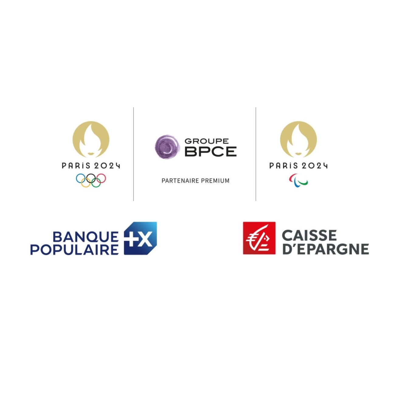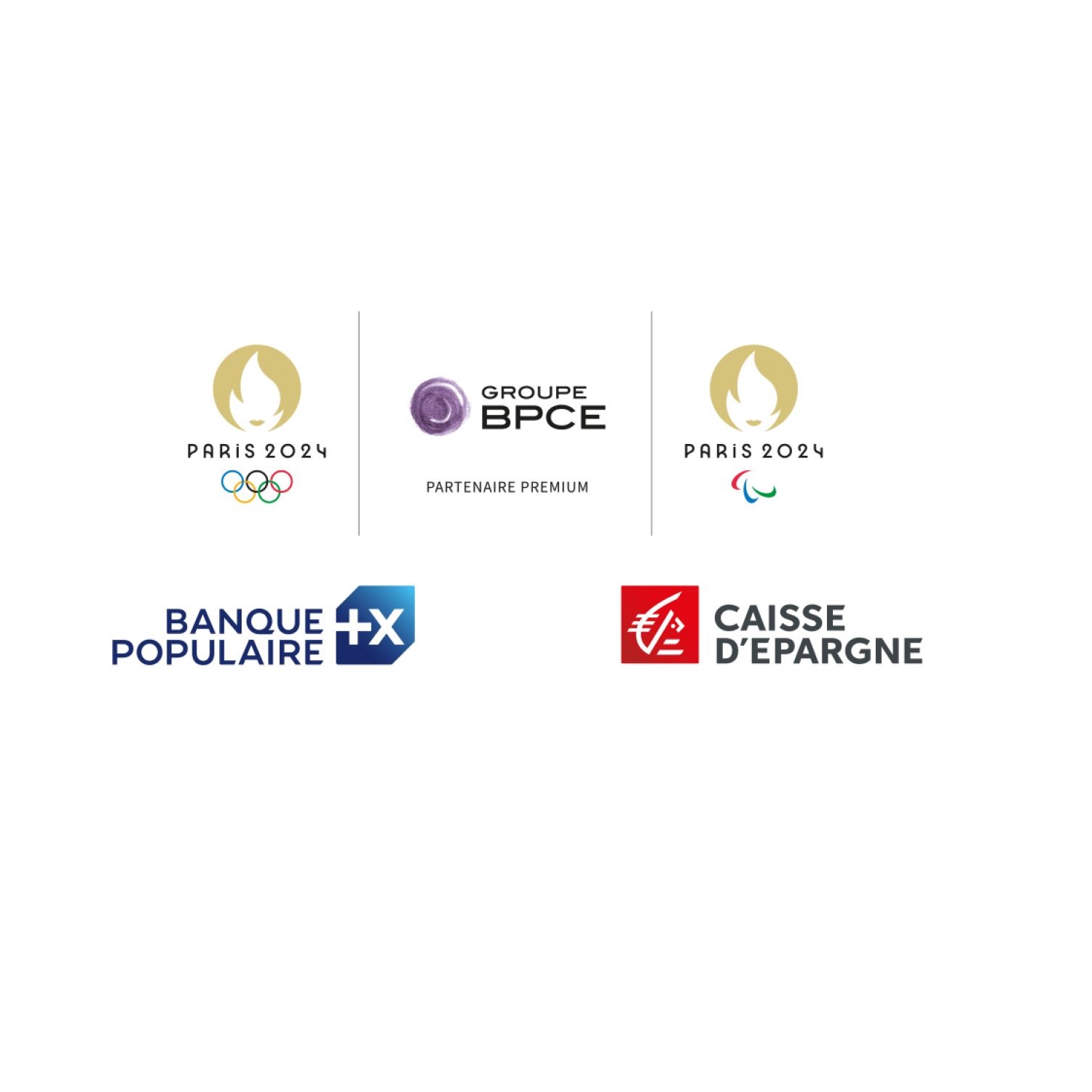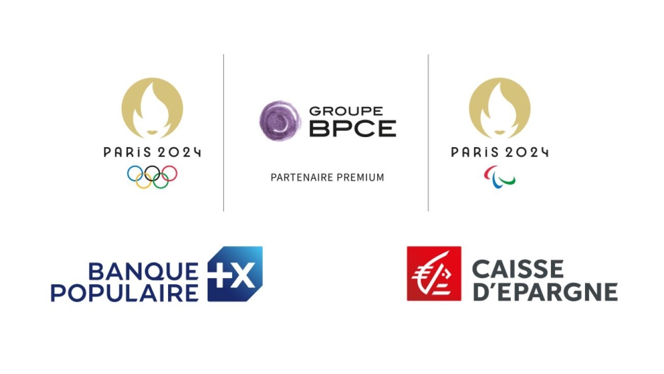 Logos officiels des Jeux Olympiques et Paralympiques de Paris 2024, du Groupe BPCE, de Banque Populaire et de Caisse d'Epargne, illustrant leur partenariat premium pour Paris 2024.