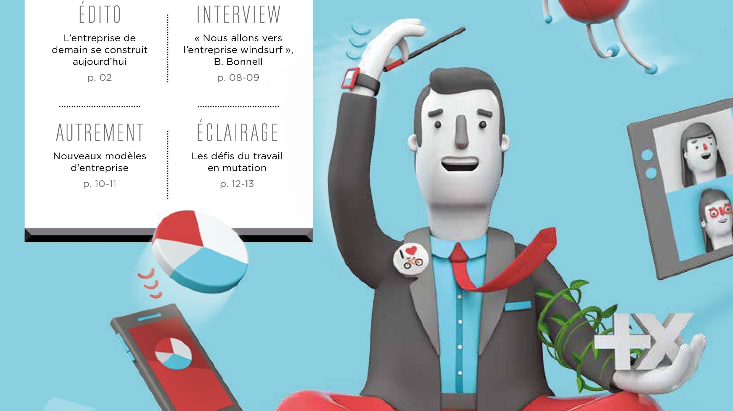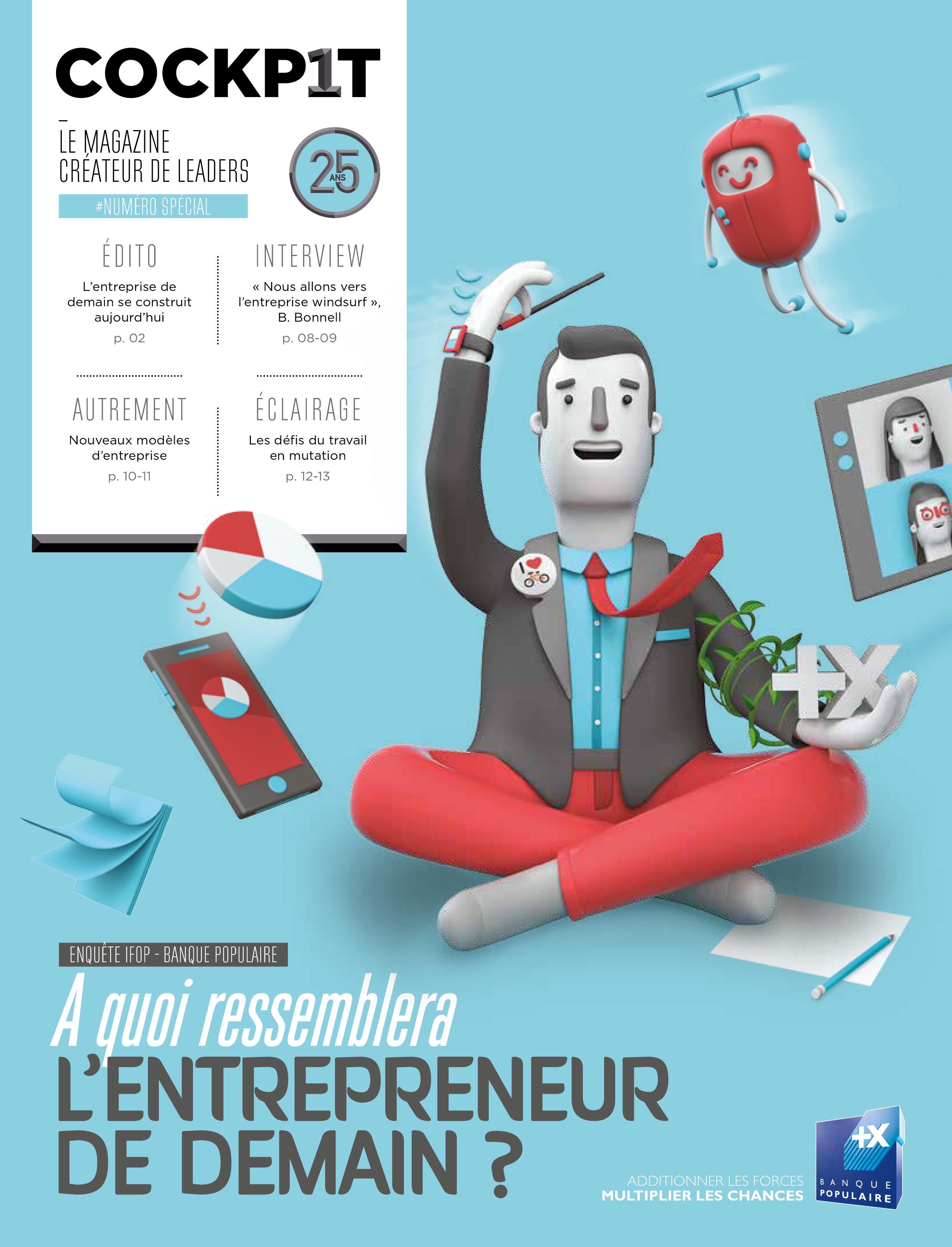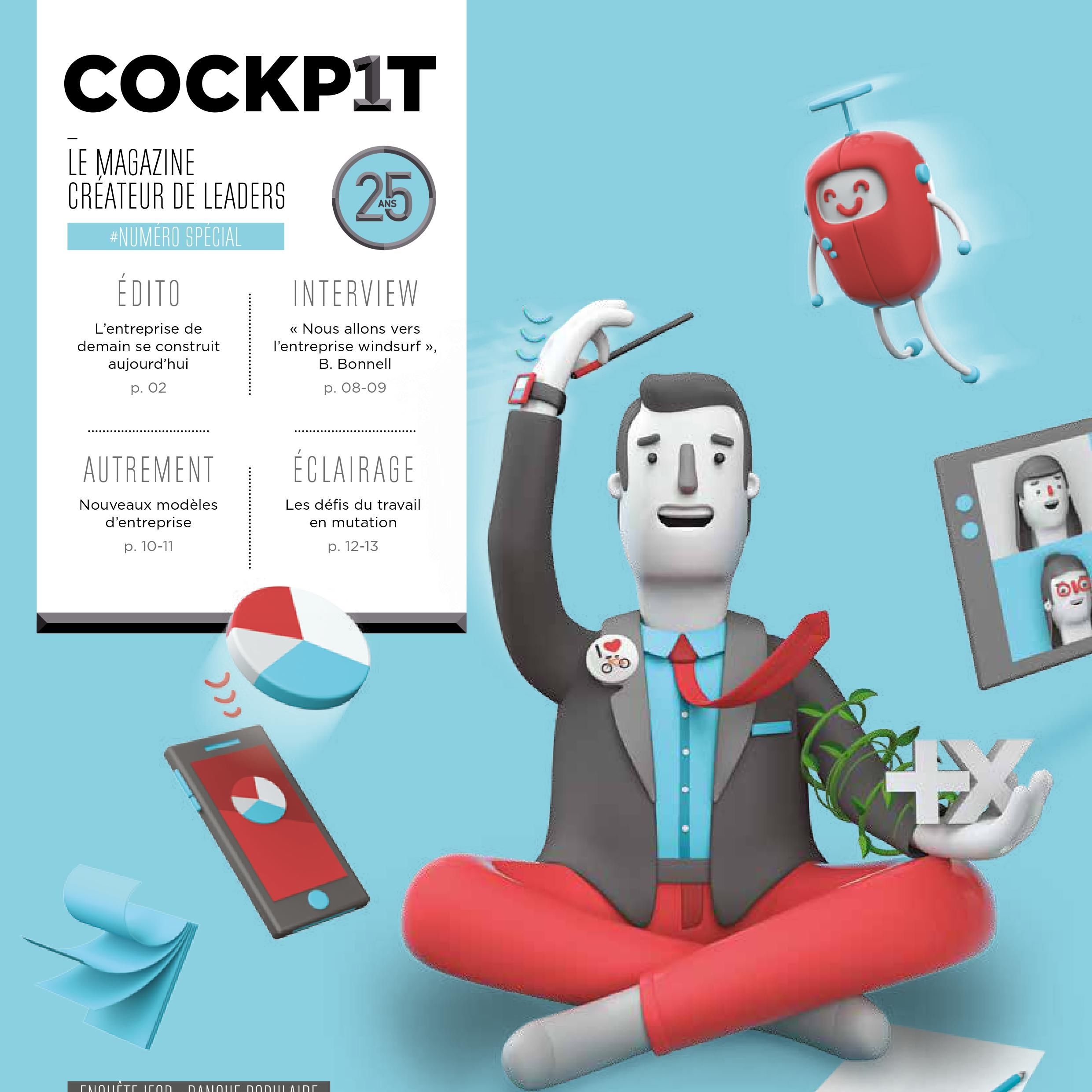 Couverture du magazine Cockpit spécial 25 ans présentant une illustration de l'entrepreneur de demain connecté, avec des objets digitaux et technologiques.