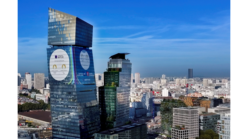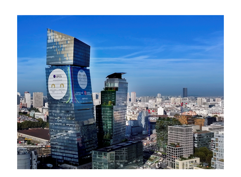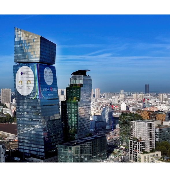 Vue aérienne de la Tour BPCE, un gratte-ciel moderne situé dans le quartier d’affaires de Paris, reconnaissable à son architecture contemporaine et à ses affichages sur la façade.